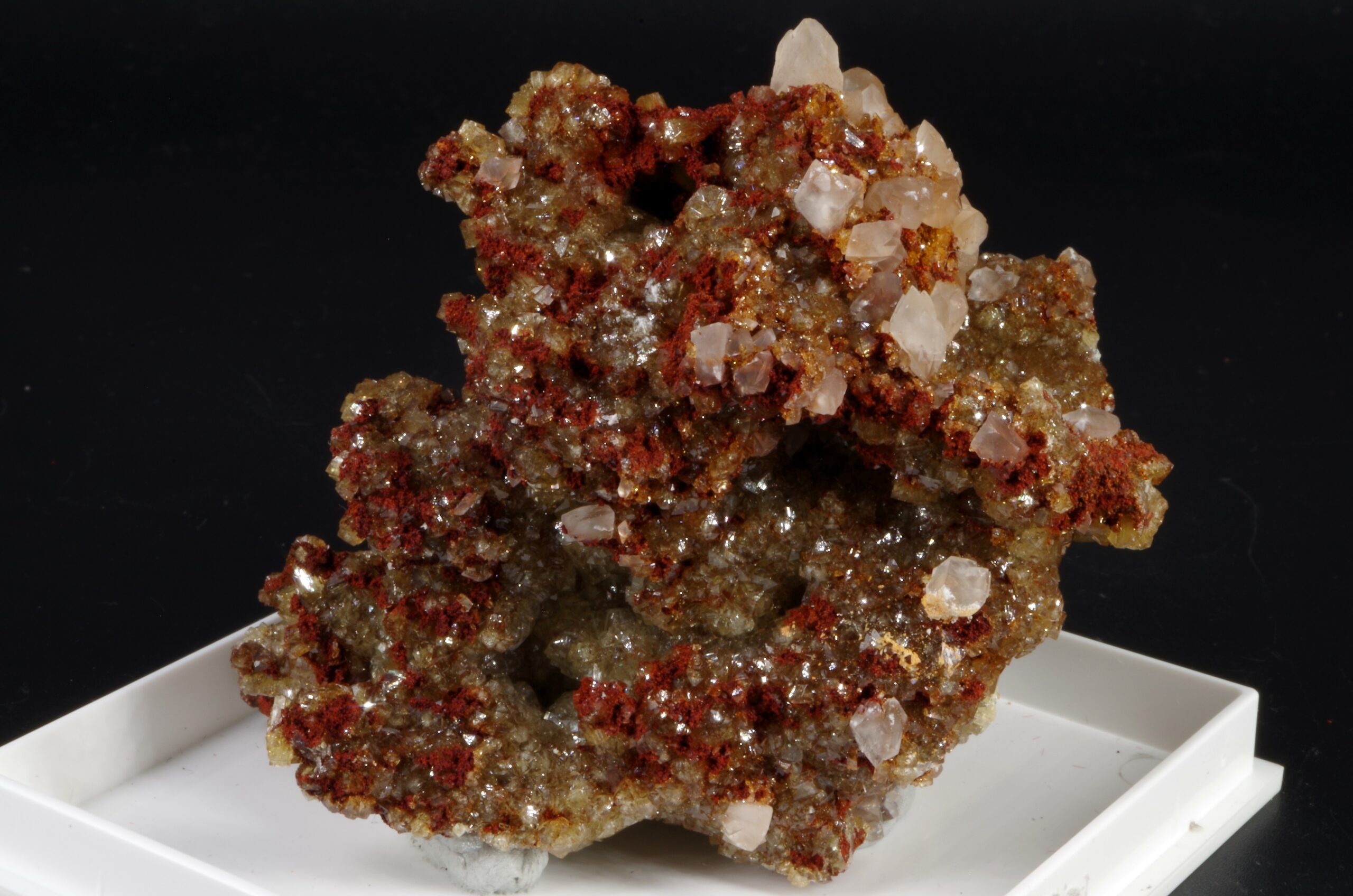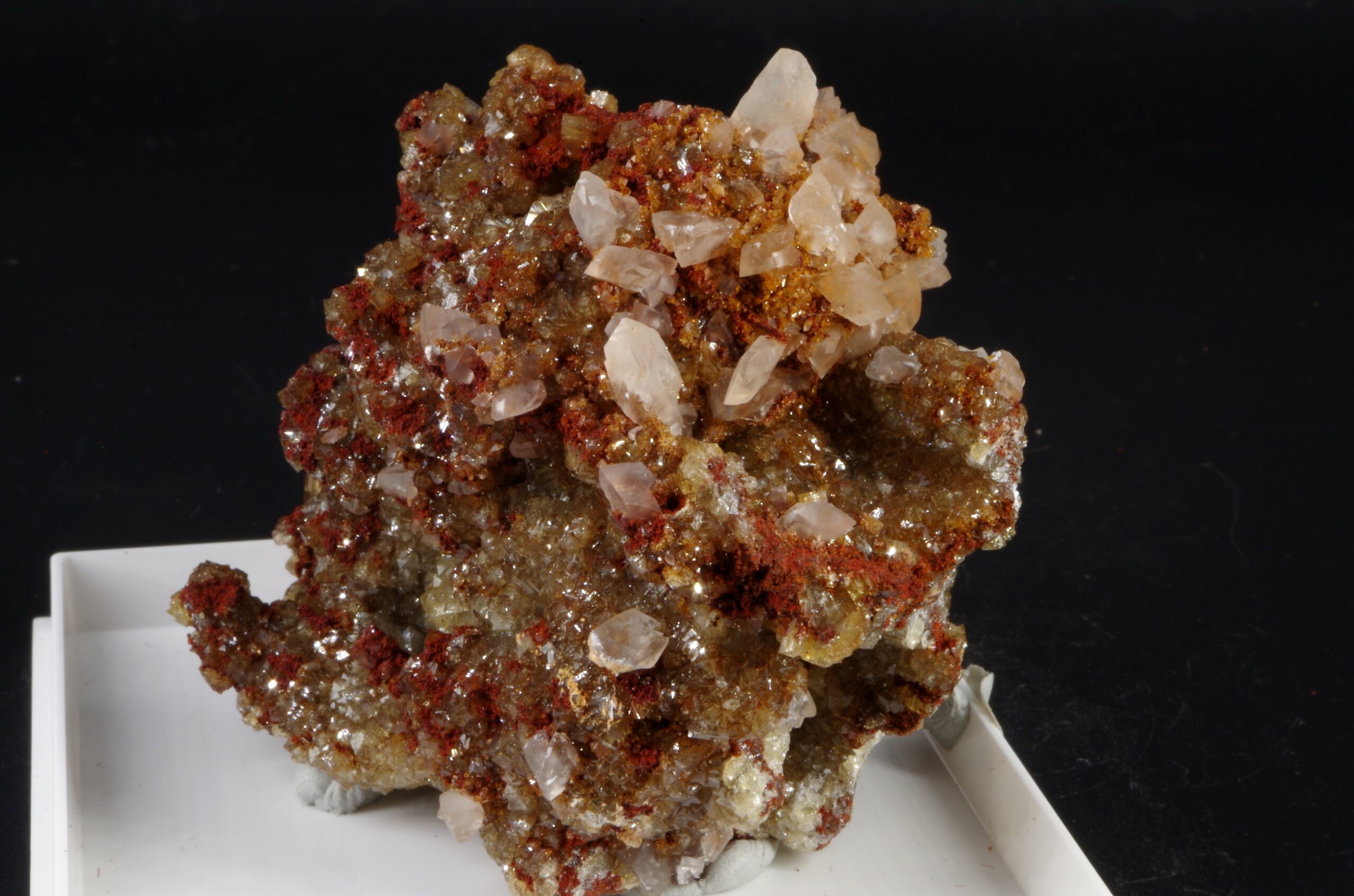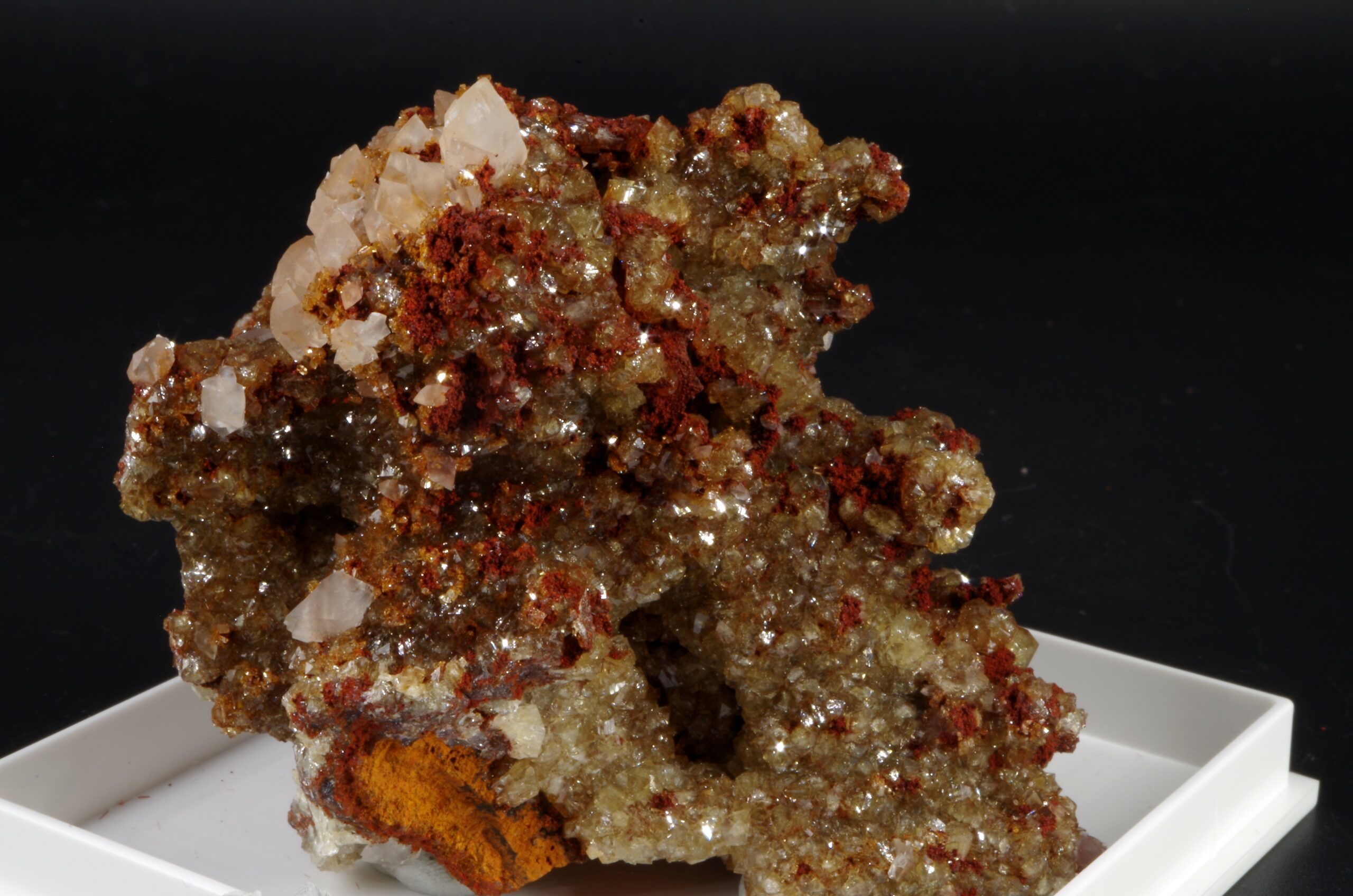 Excellent spécimen d’adamite couvrant une matrice en limonite et parsemé d’élégantes cristallisations de Calcite.