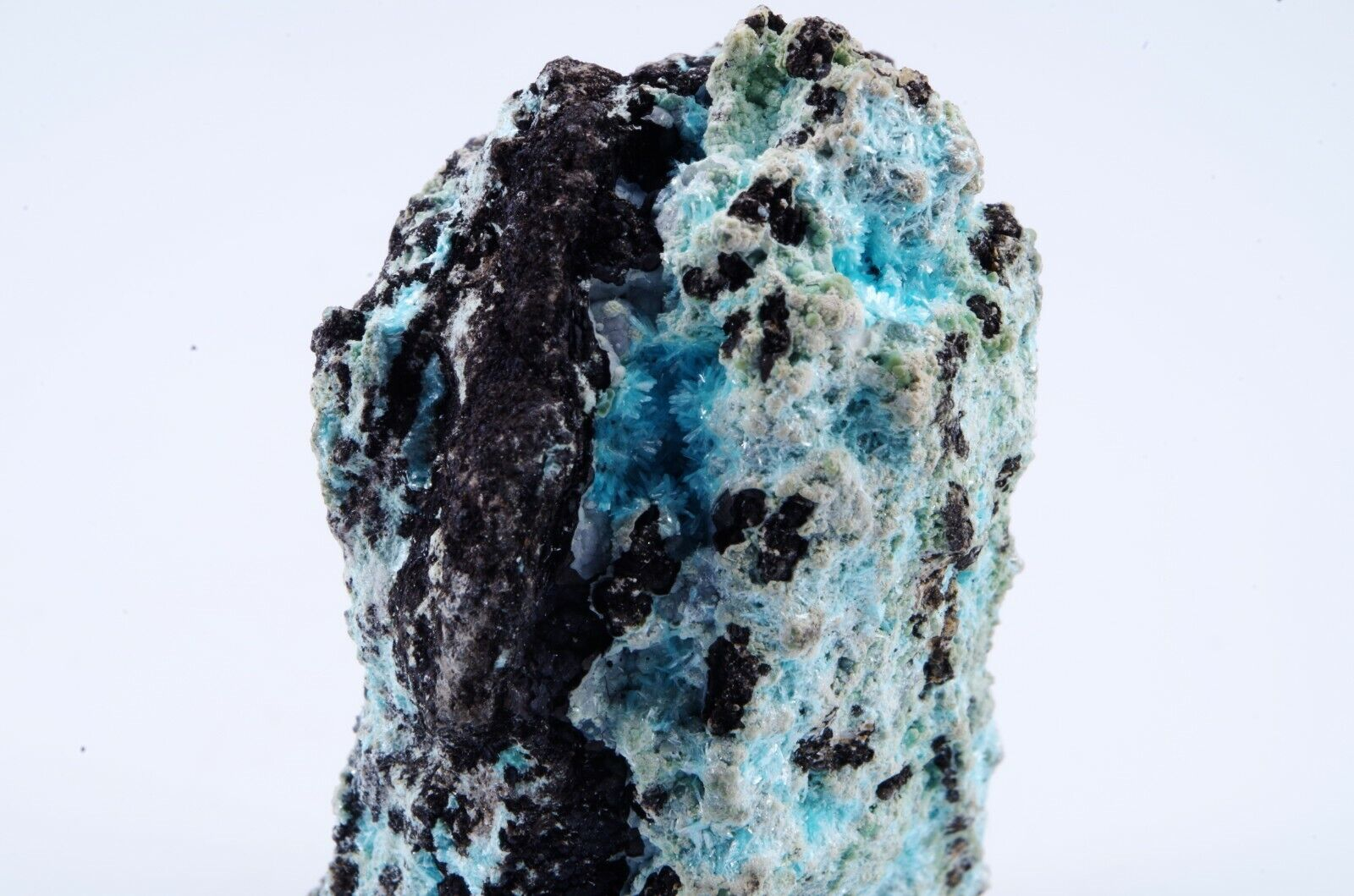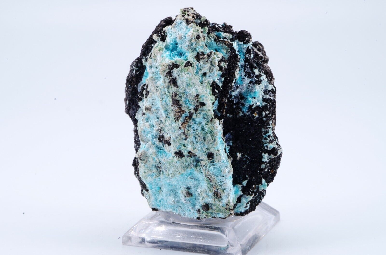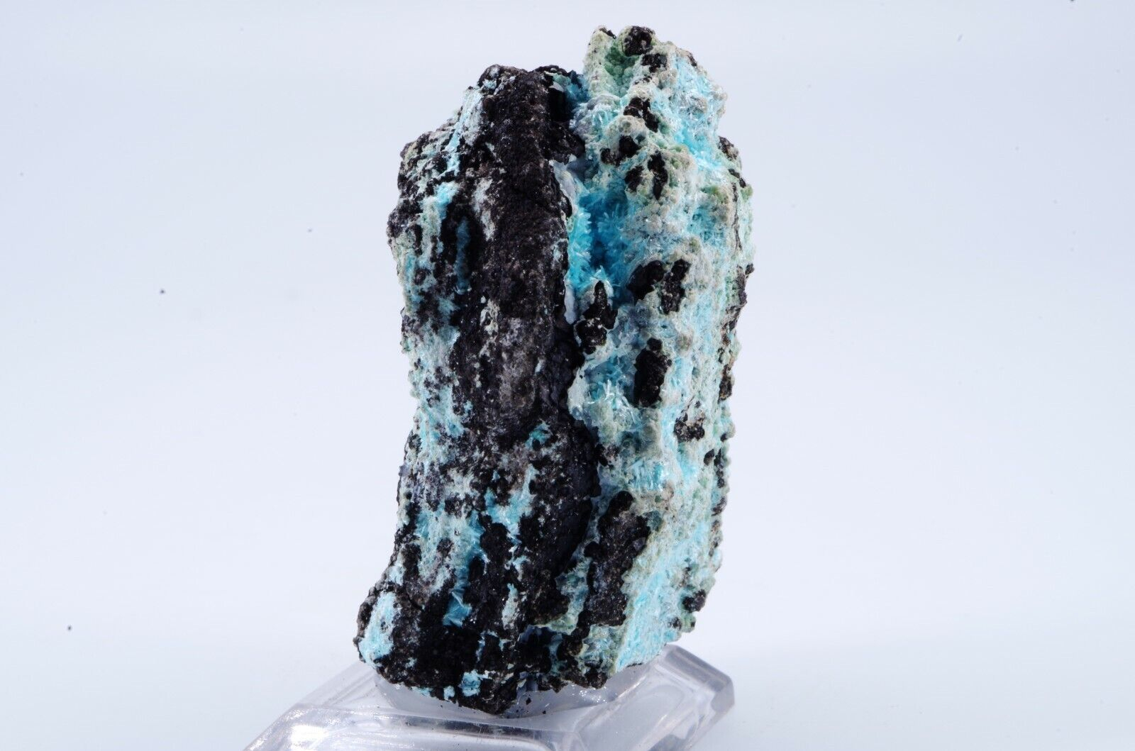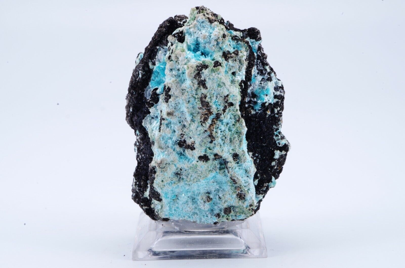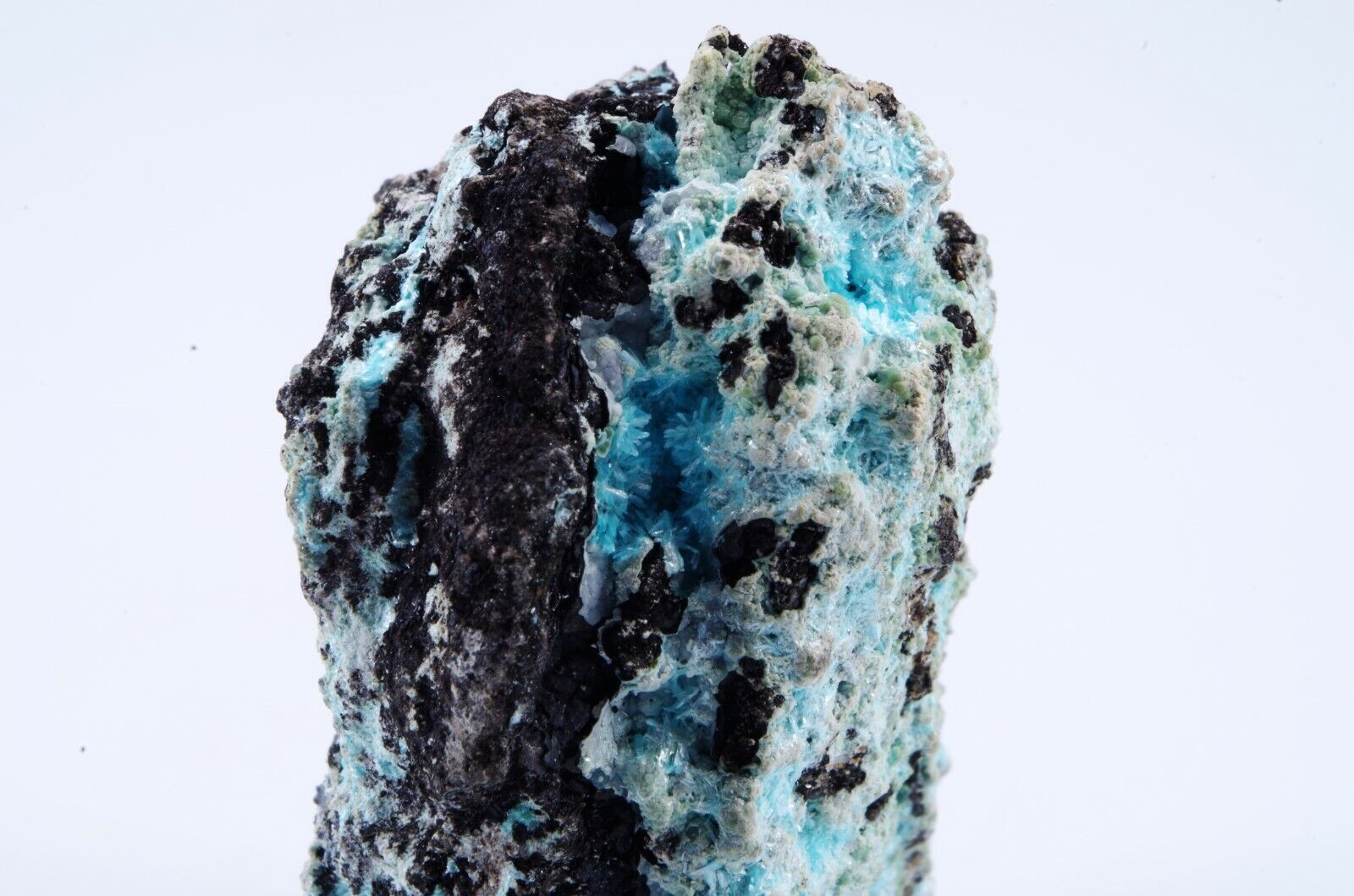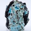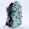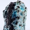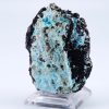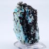 Rare Aurichalcite de Grèce en cristallisations aciculaires formant des « pompons » couleur bleu lagon sur matrice foncée offrant un excellent contraste