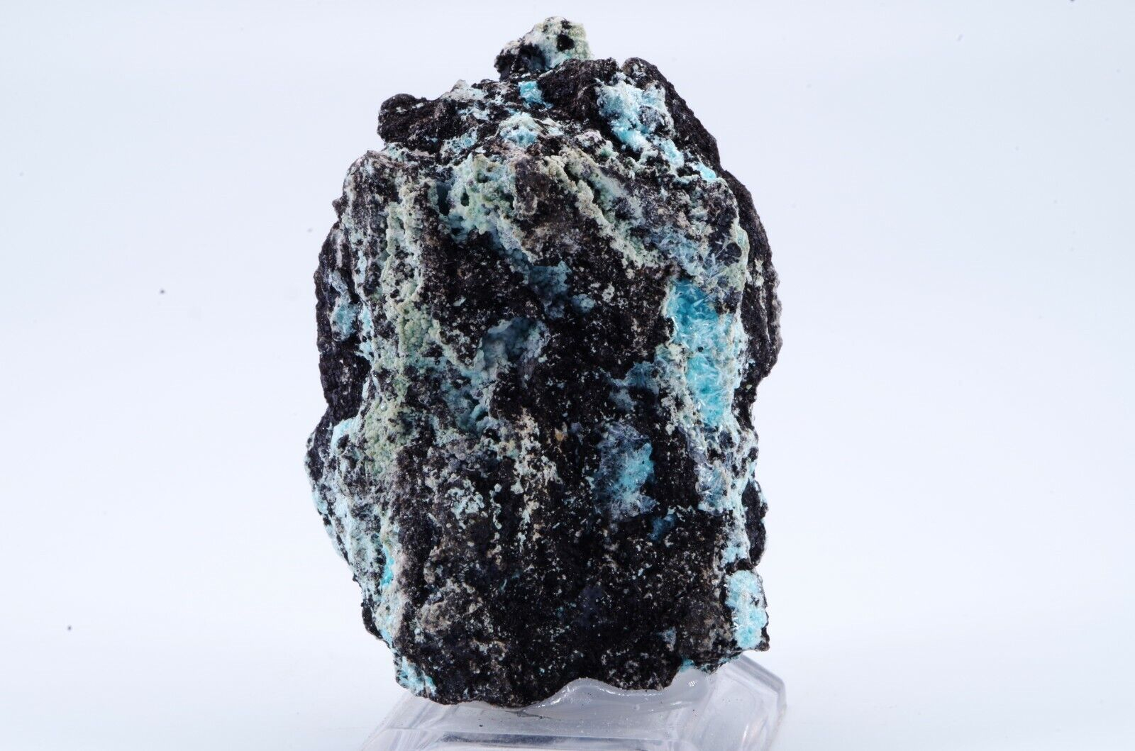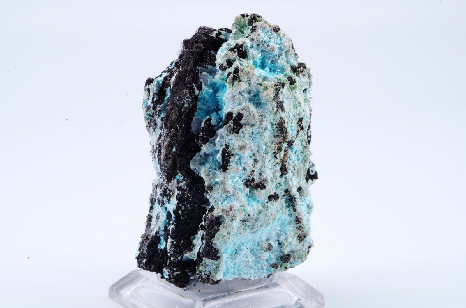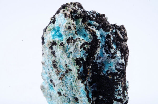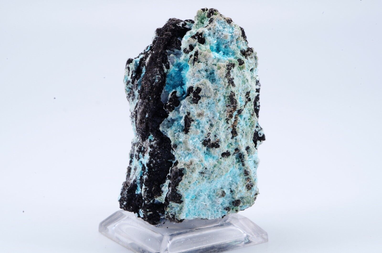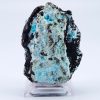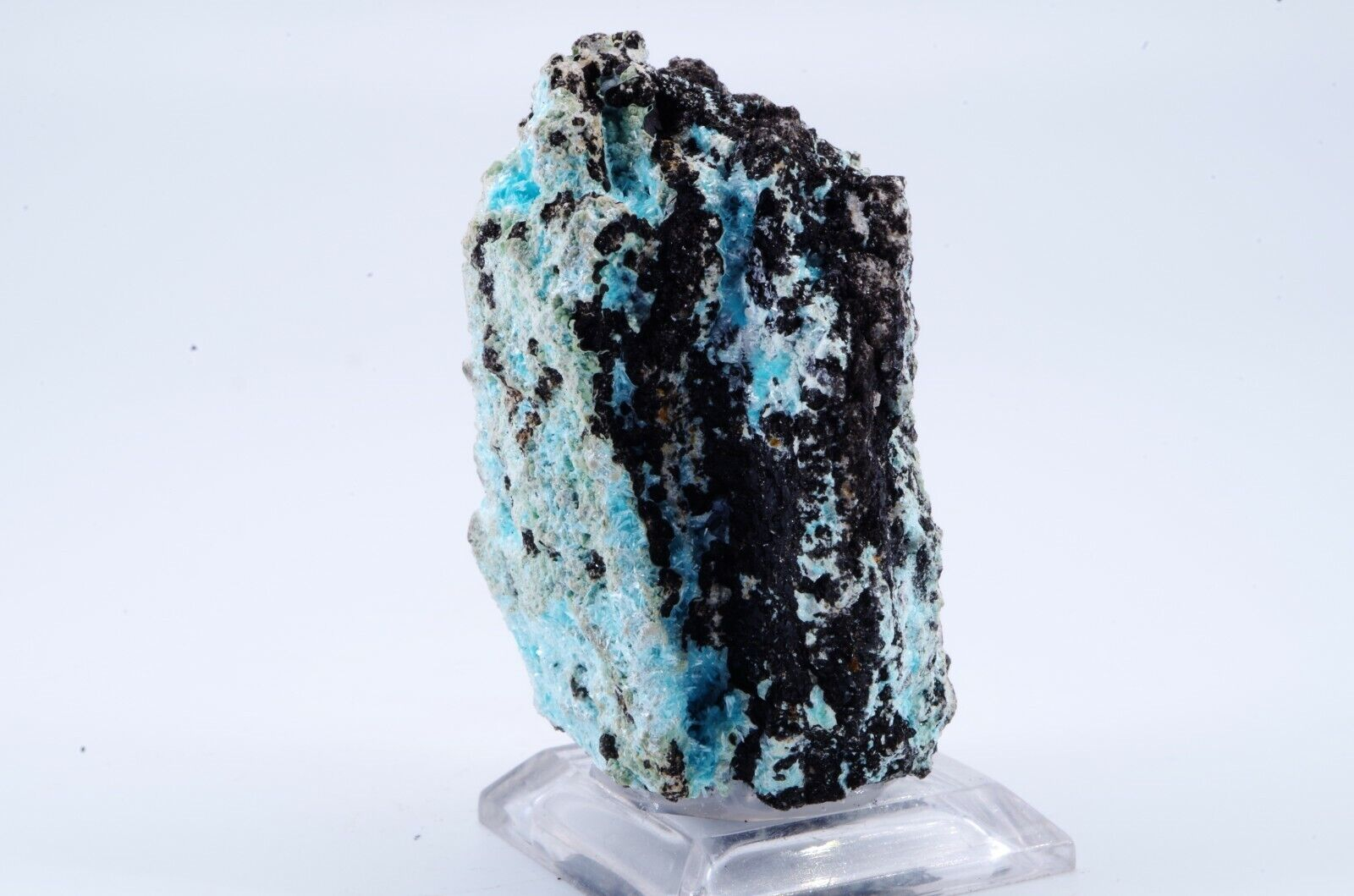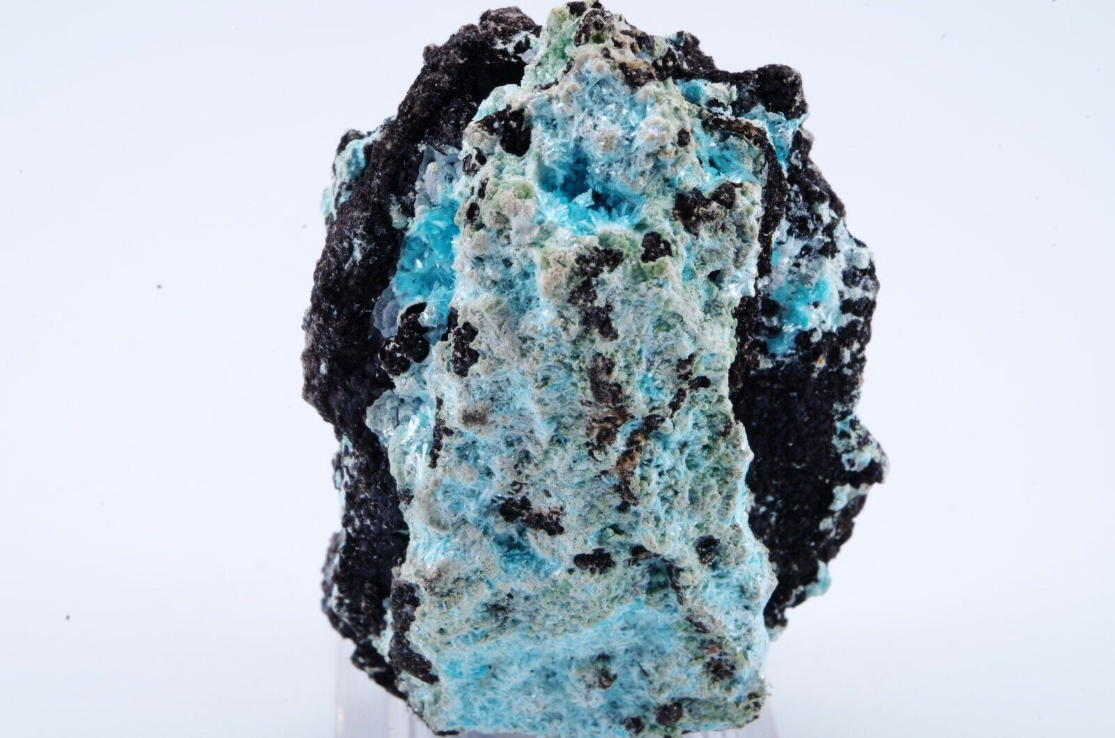 Rare Aurichalcite de Grèce en cristallisations aciculaires formant des « pompons » couleur bleu lagon sur matrice foncée offrant un excellent contraste