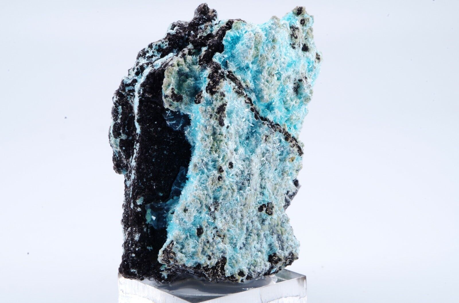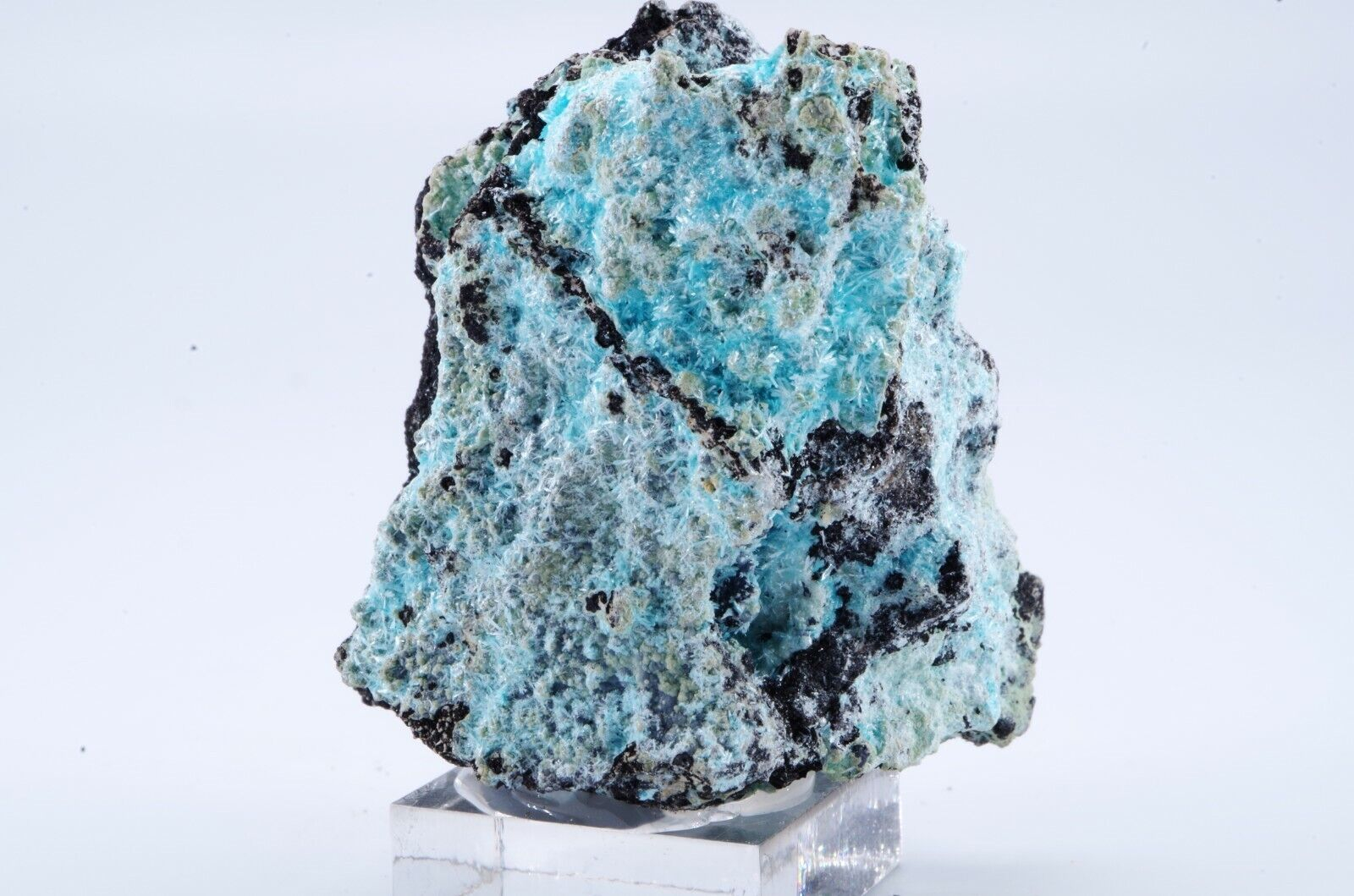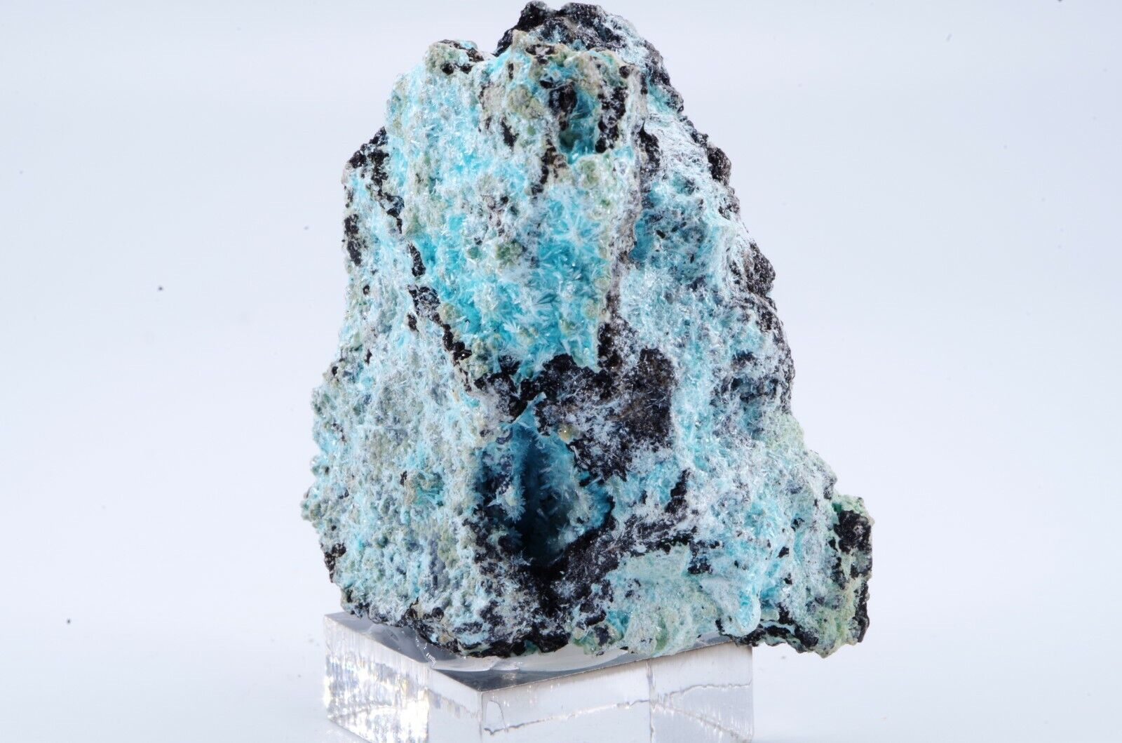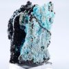 Rare Aurichalcite de Grèce en cristallisations aciculaires formant des « pompons » couleur bleu lagon sur matrice foncée offrant un excellent contraste