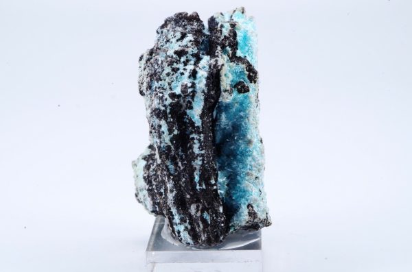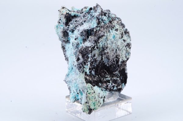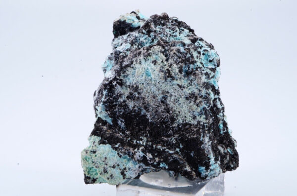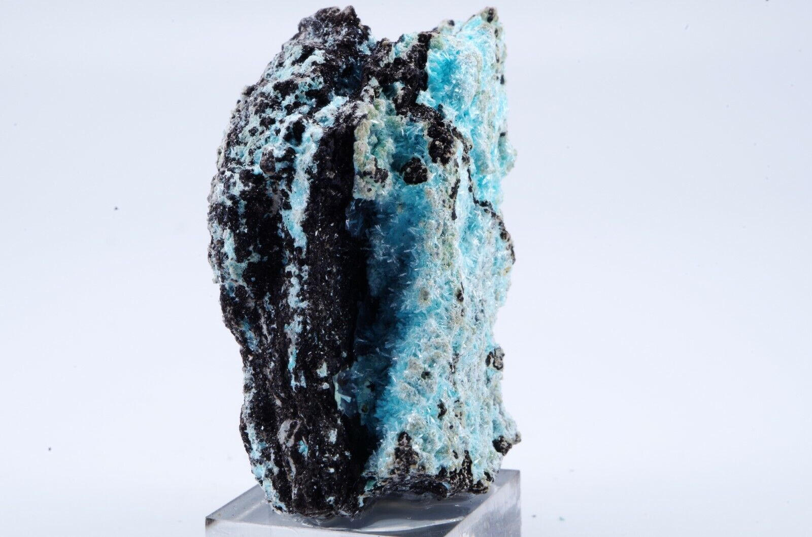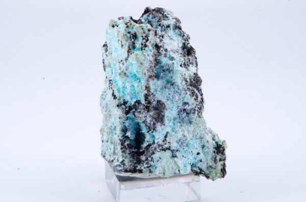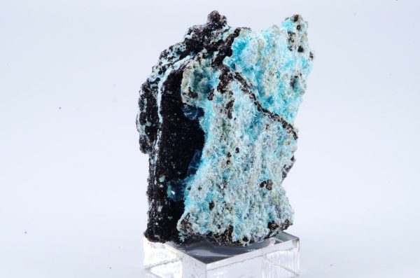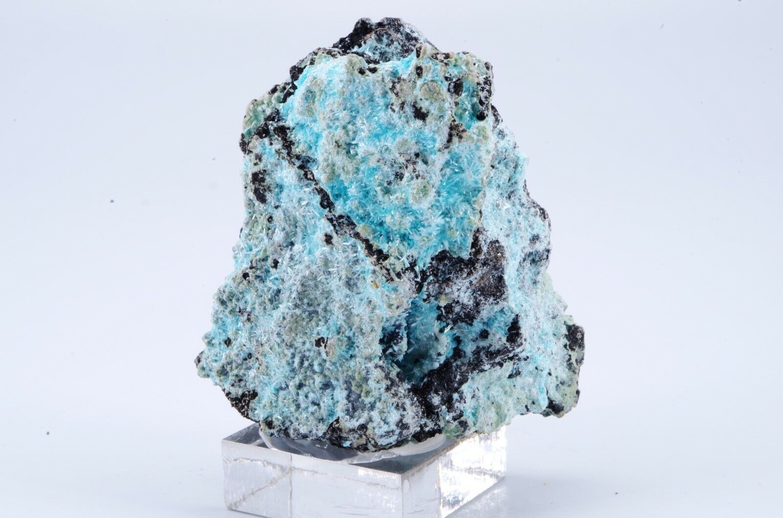 Rare Aurichalcite de Grèce en cristallisations aciculaires formant des « pompons » couleur bleu lagon sur matrice foncée offrant un excellent contraste