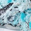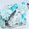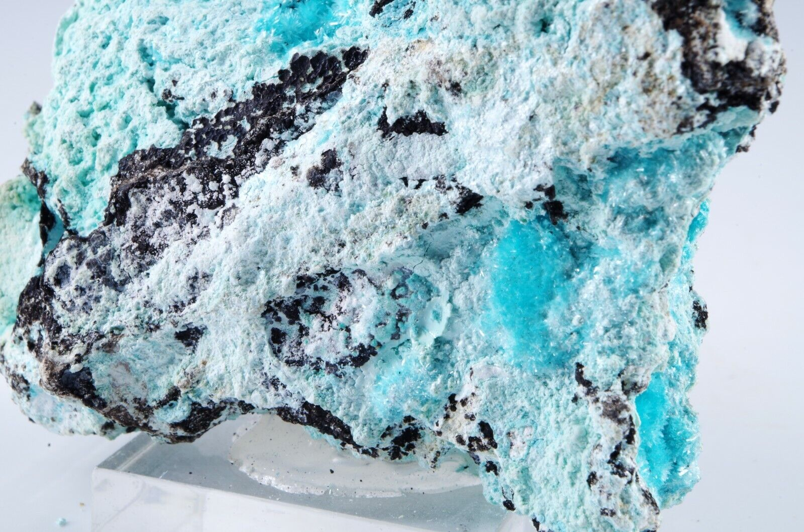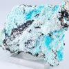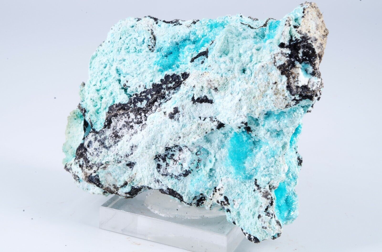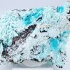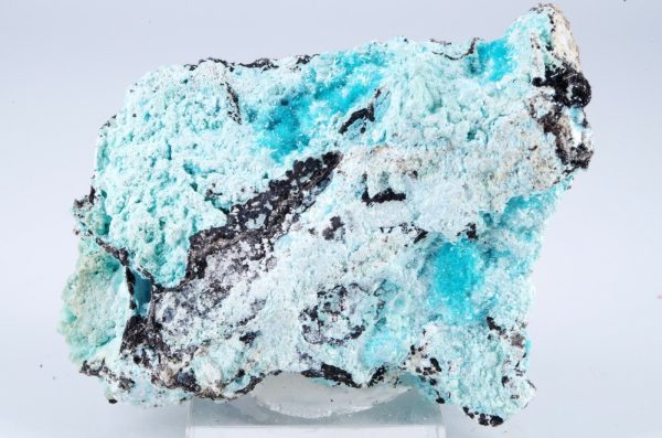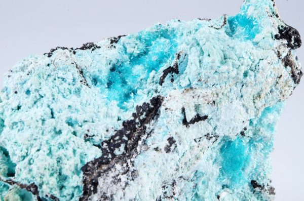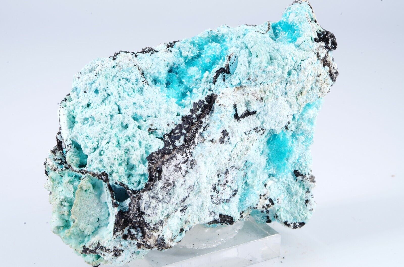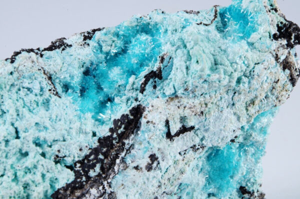 Rare Aurichalcite de Grèce en cristallisations aciculaires formant des « pompons » couleur bleu lagon sur matrice foncée offrant un excellent contraste