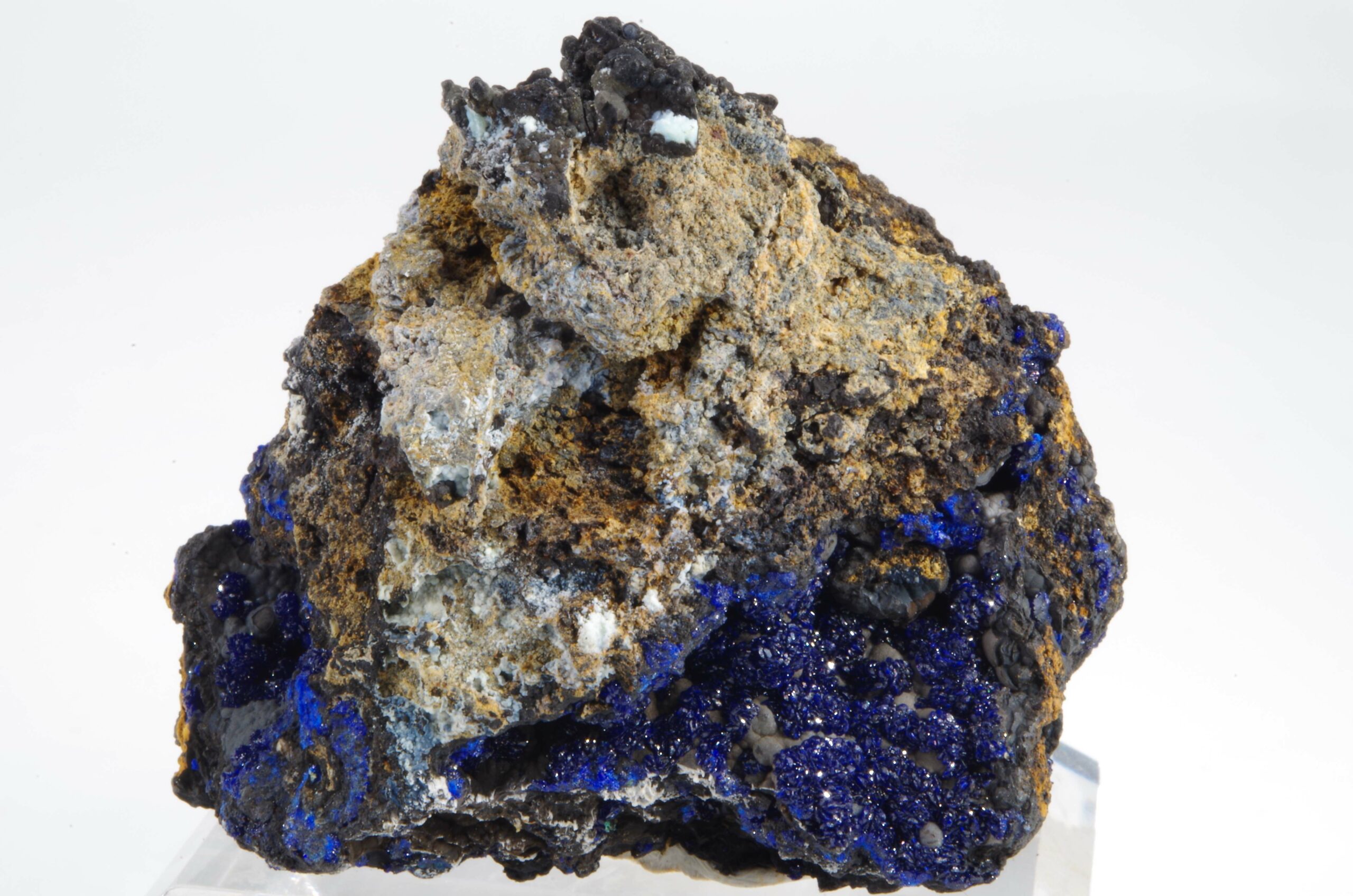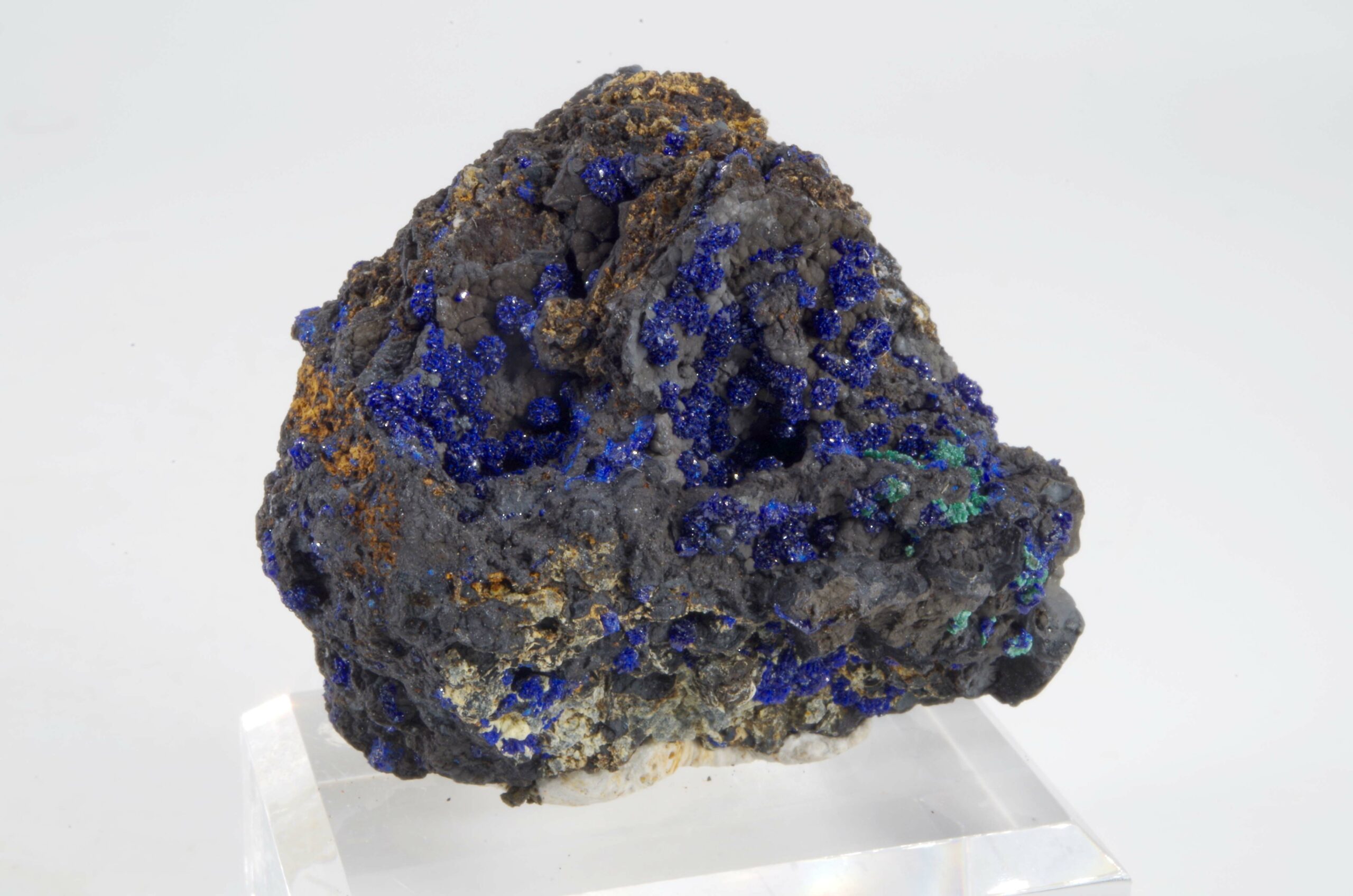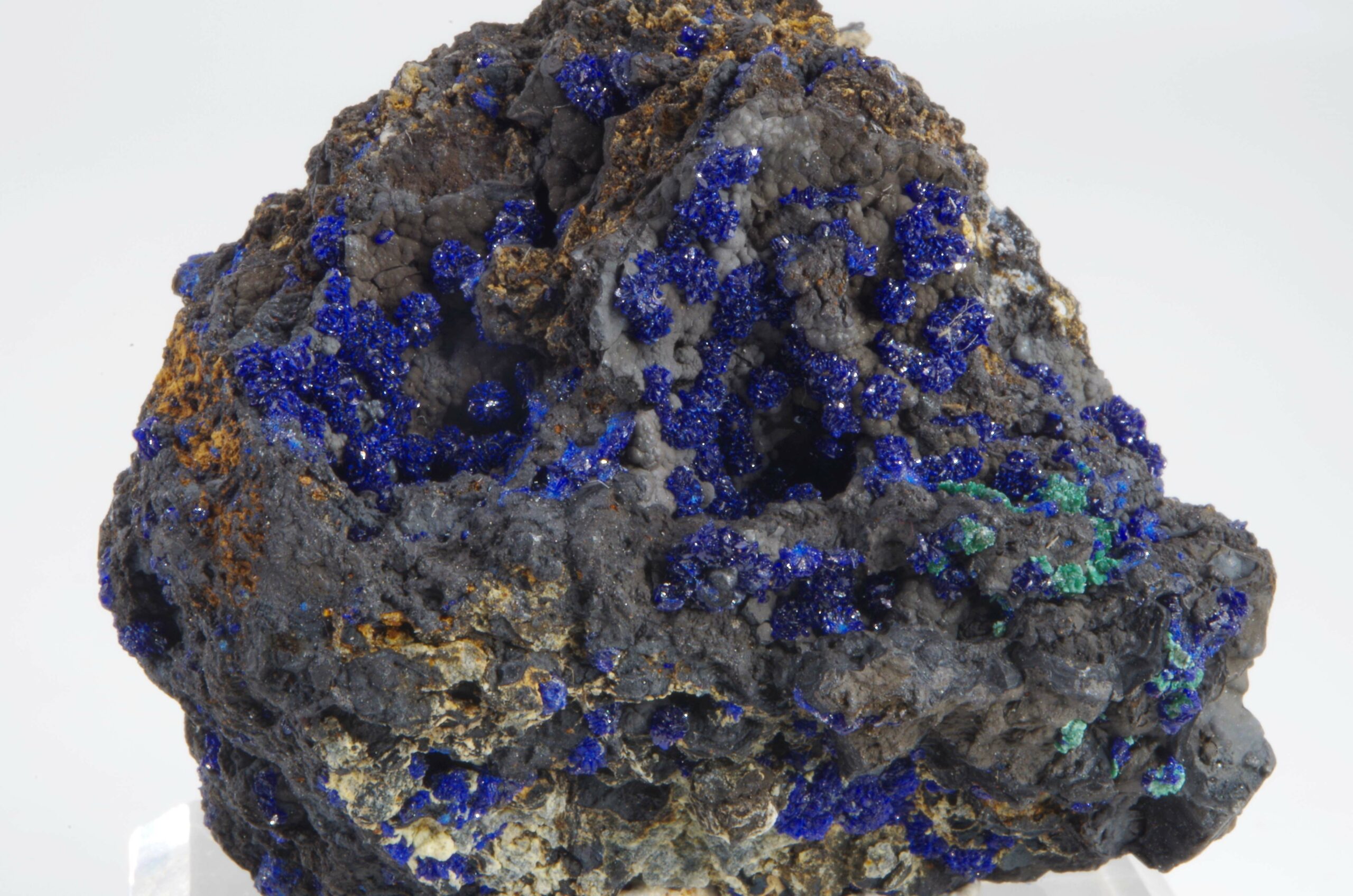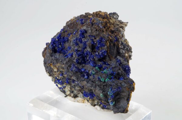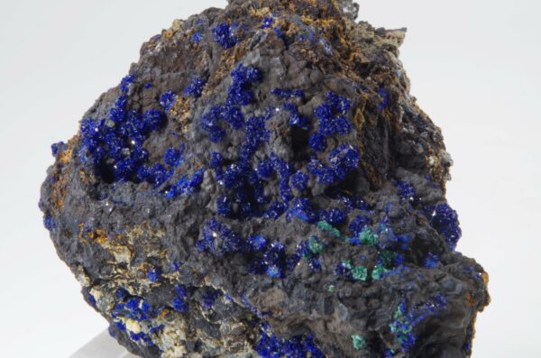 Jolies sphérules d’Azurite bleu électrique sur gangue noire offrant un joli contraste.