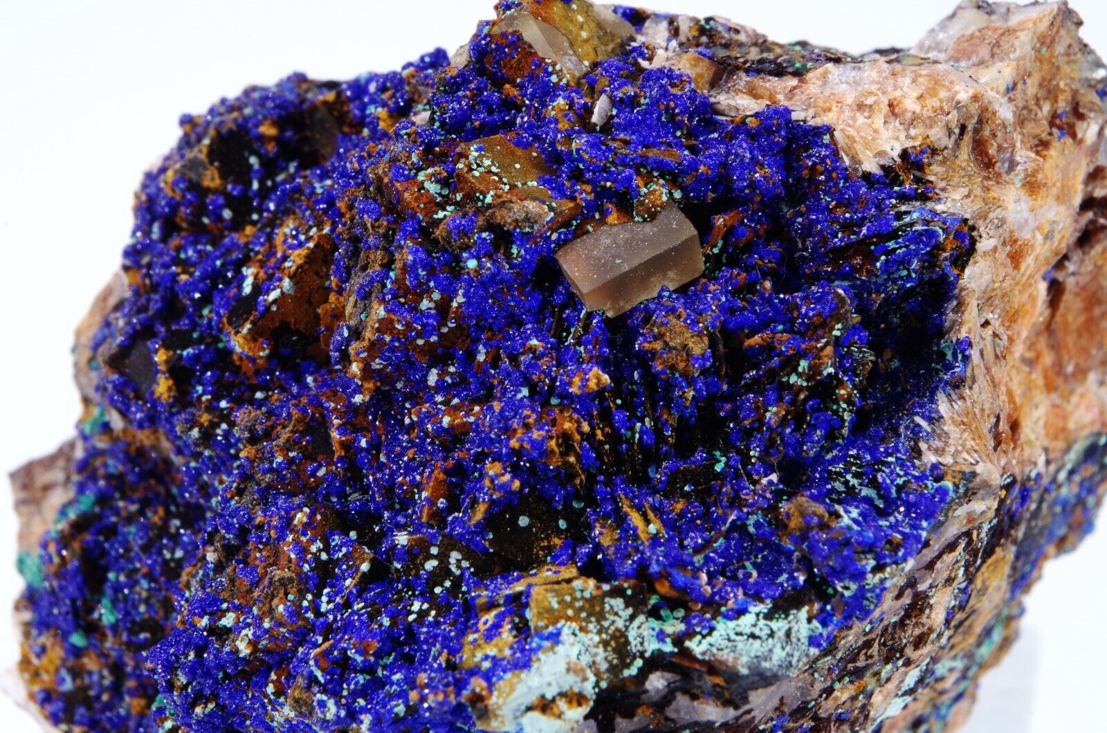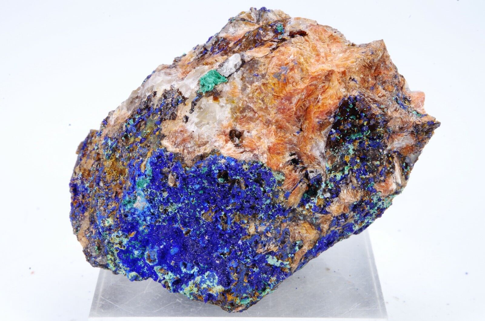 Jolie association d’azurite malachite sur baryte avec fluorite