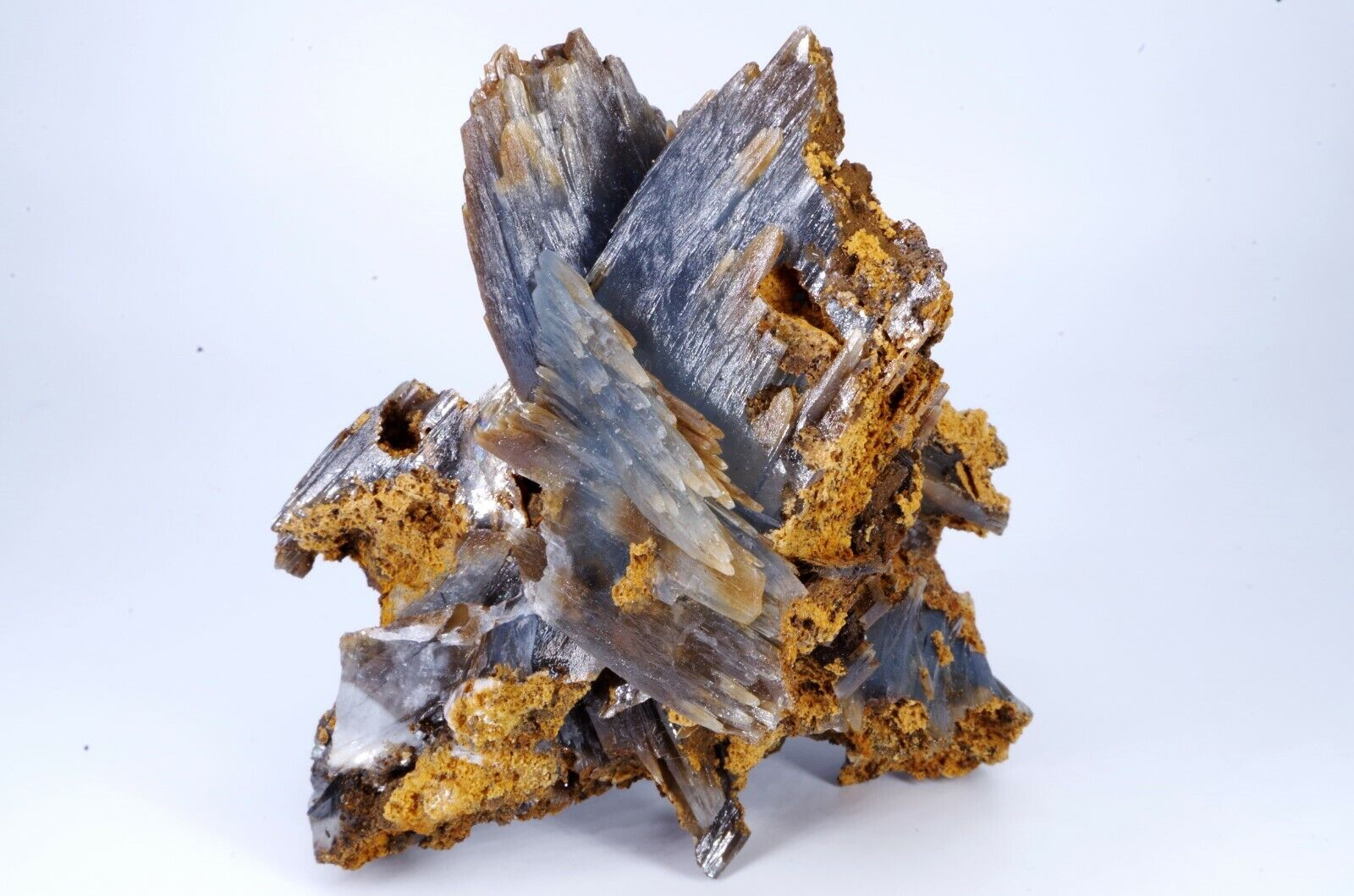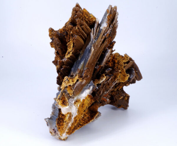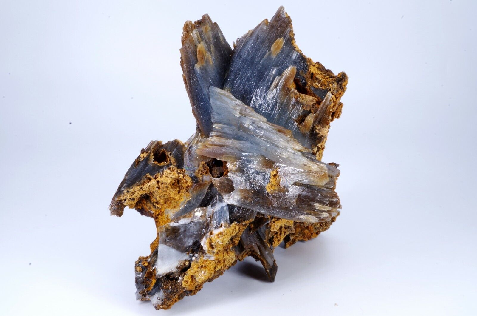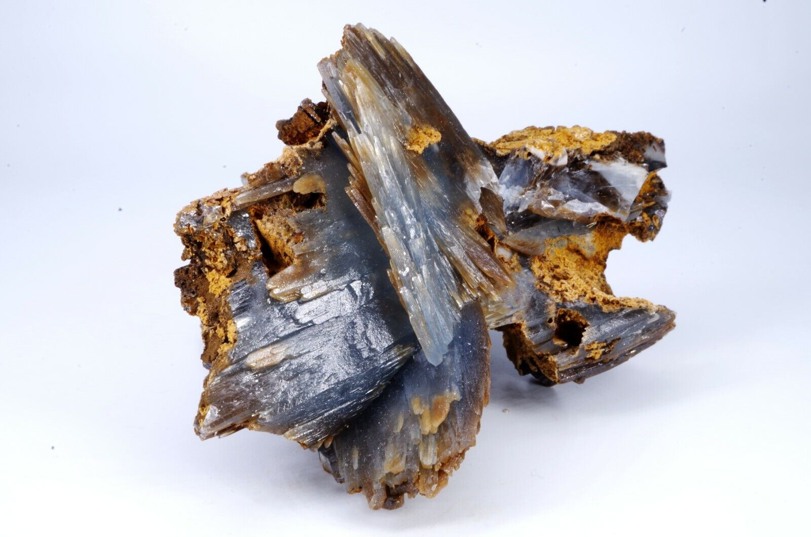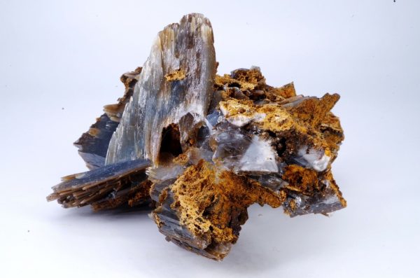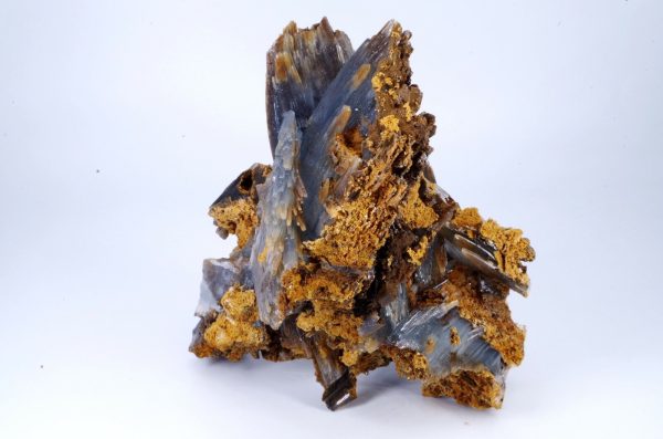 Magnifique spécimen de Baryte sur limonite. Lamelles bien définies de couleur bleues sur la face avant et chocolat sur la face arrière.