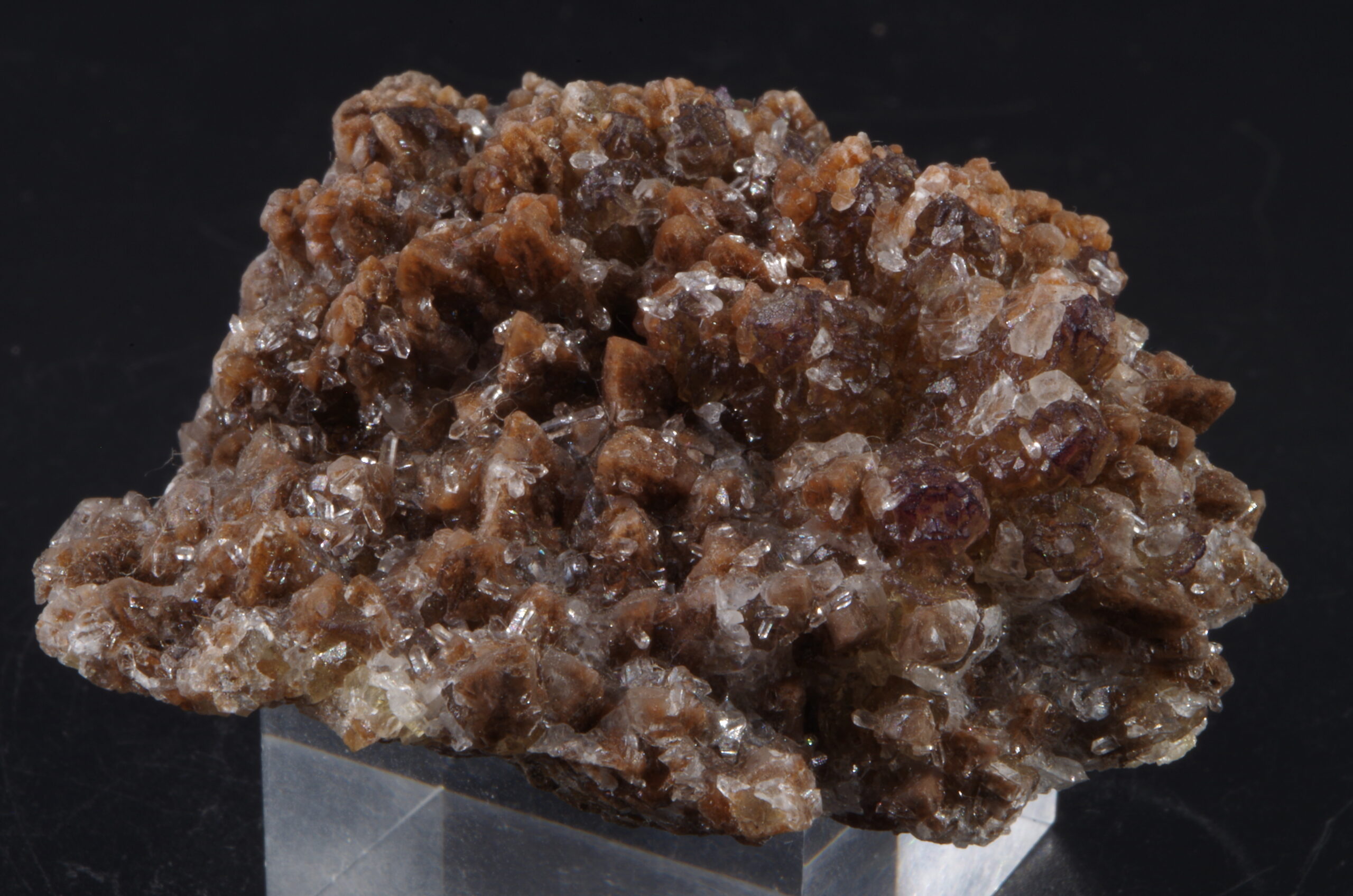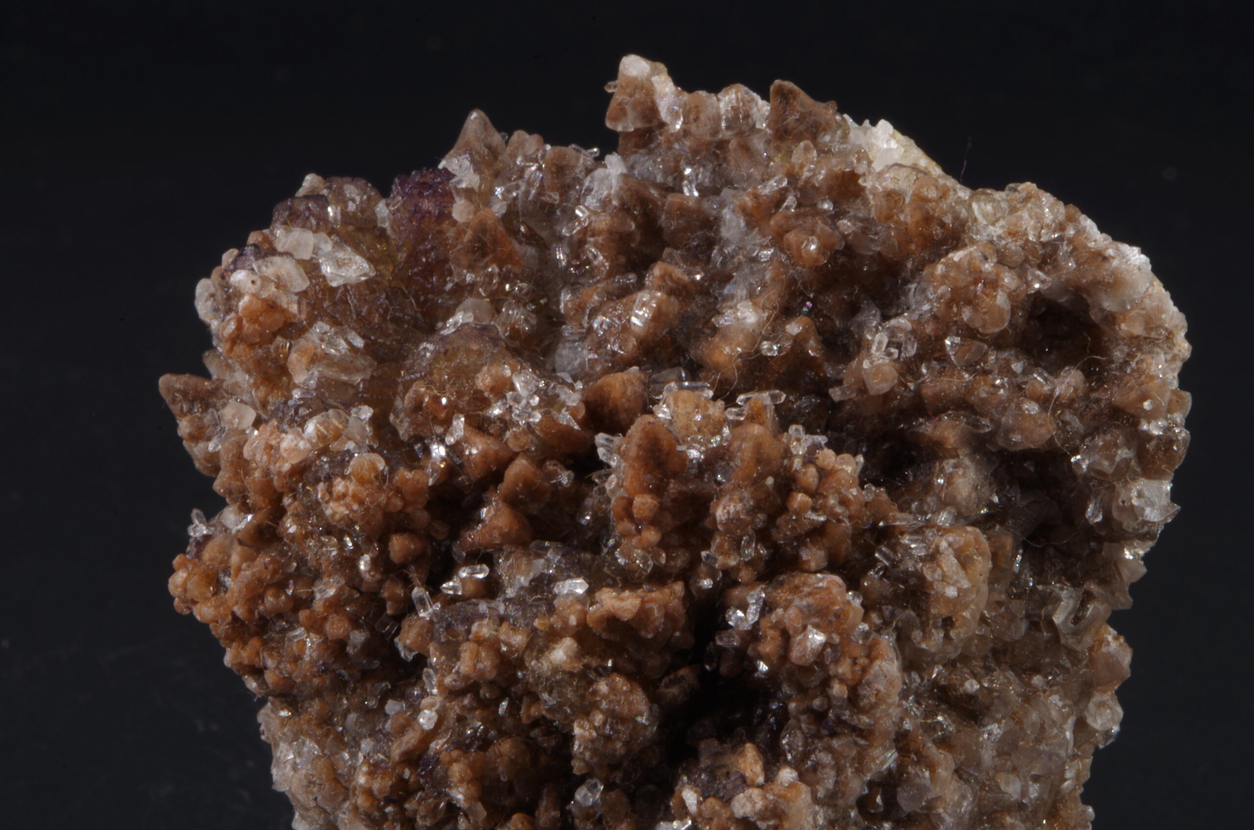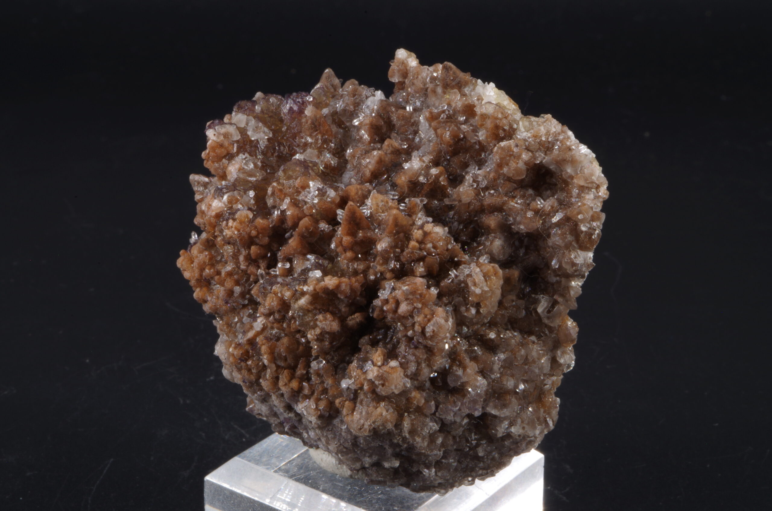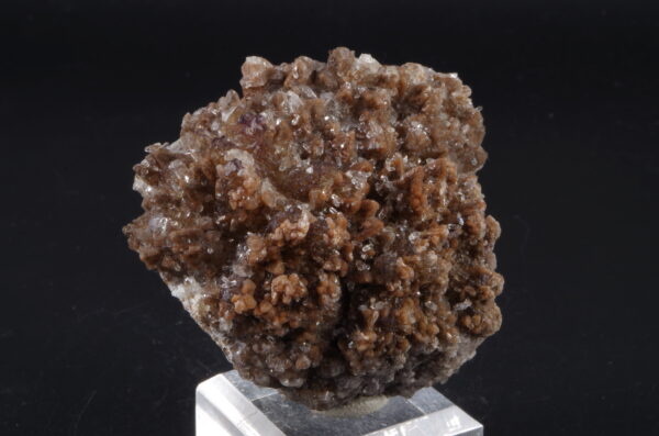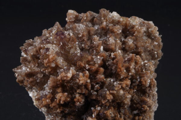 Elégant spécimen de Calcite « dent de chien » brune partiellement recouverte sur les pointes par des microcristaux de fluorites translucides à mauves foncé et complété de micro-quartz limpides.