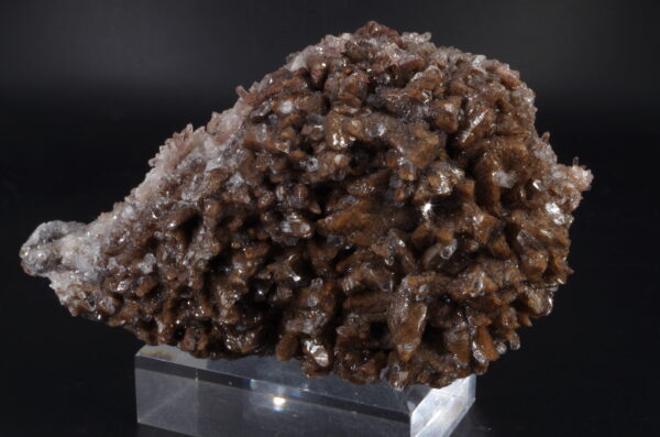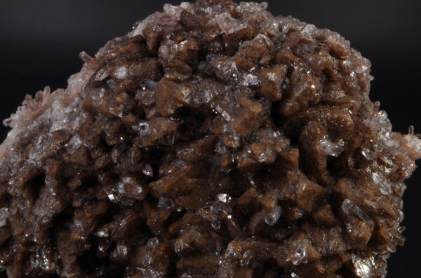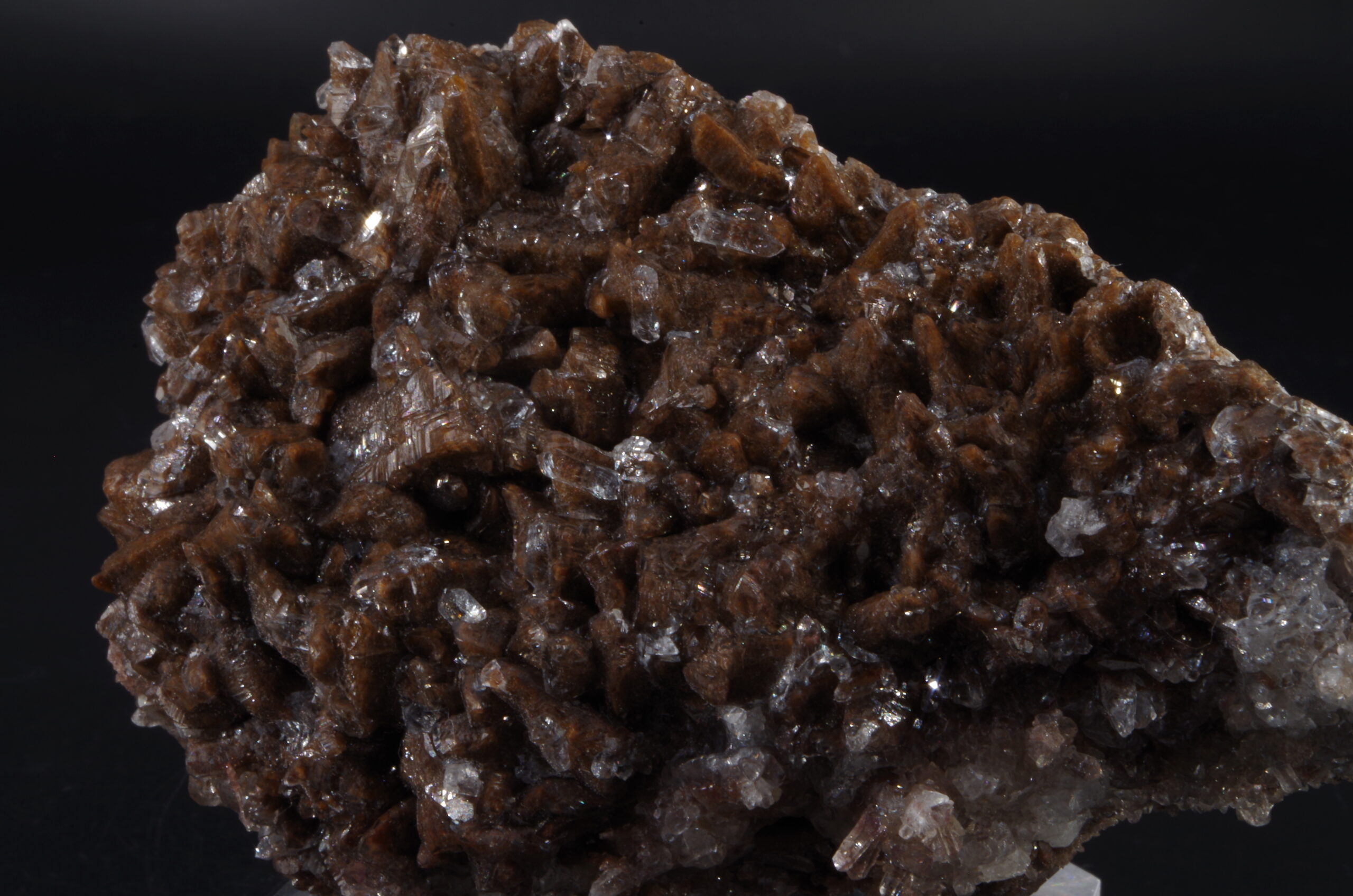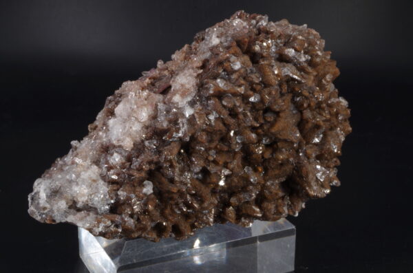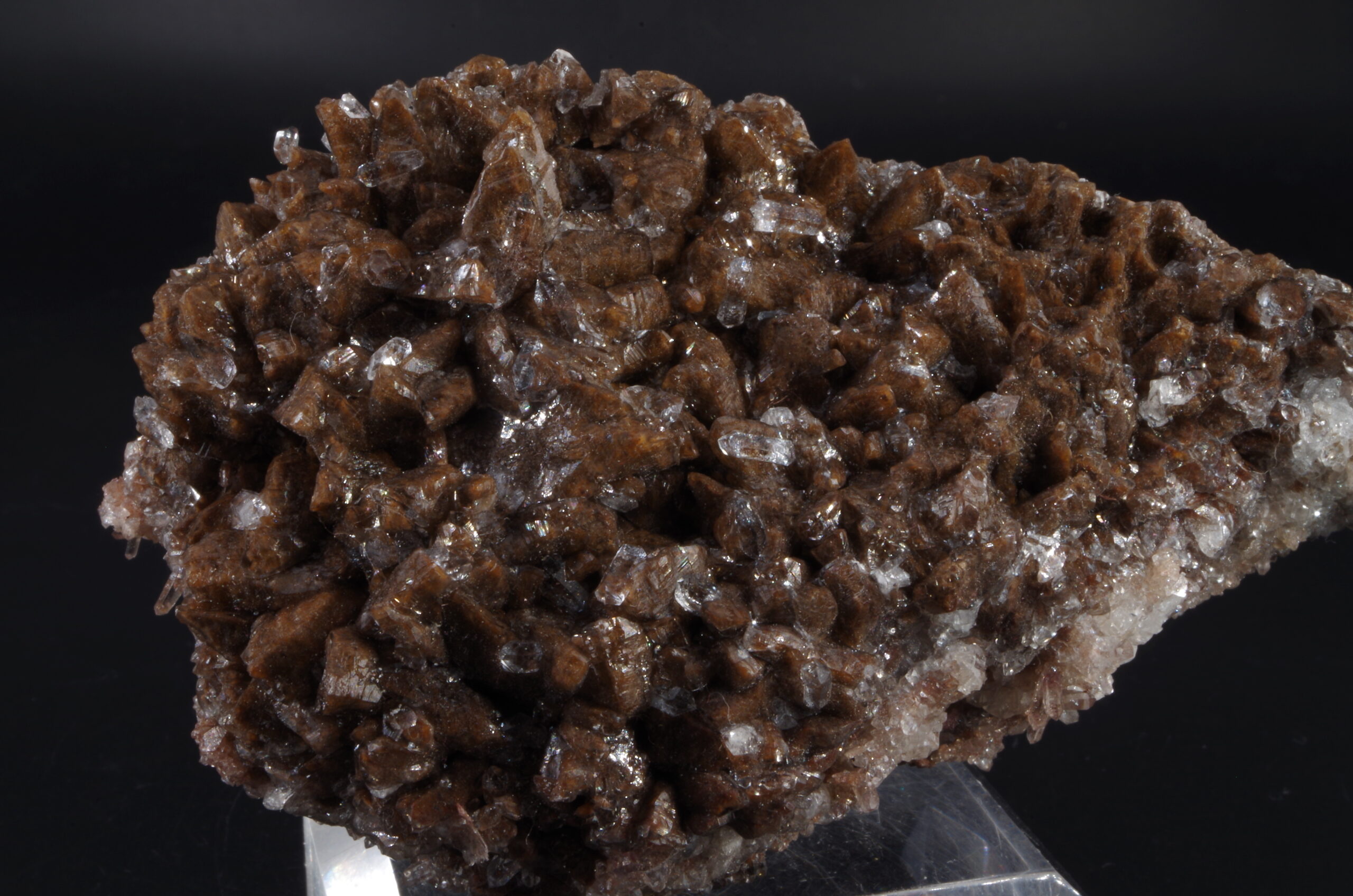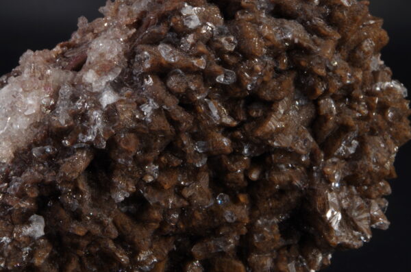 Jolie Calcite « dent de chien » brune partiellement recouverte de micro-quartz limpides.