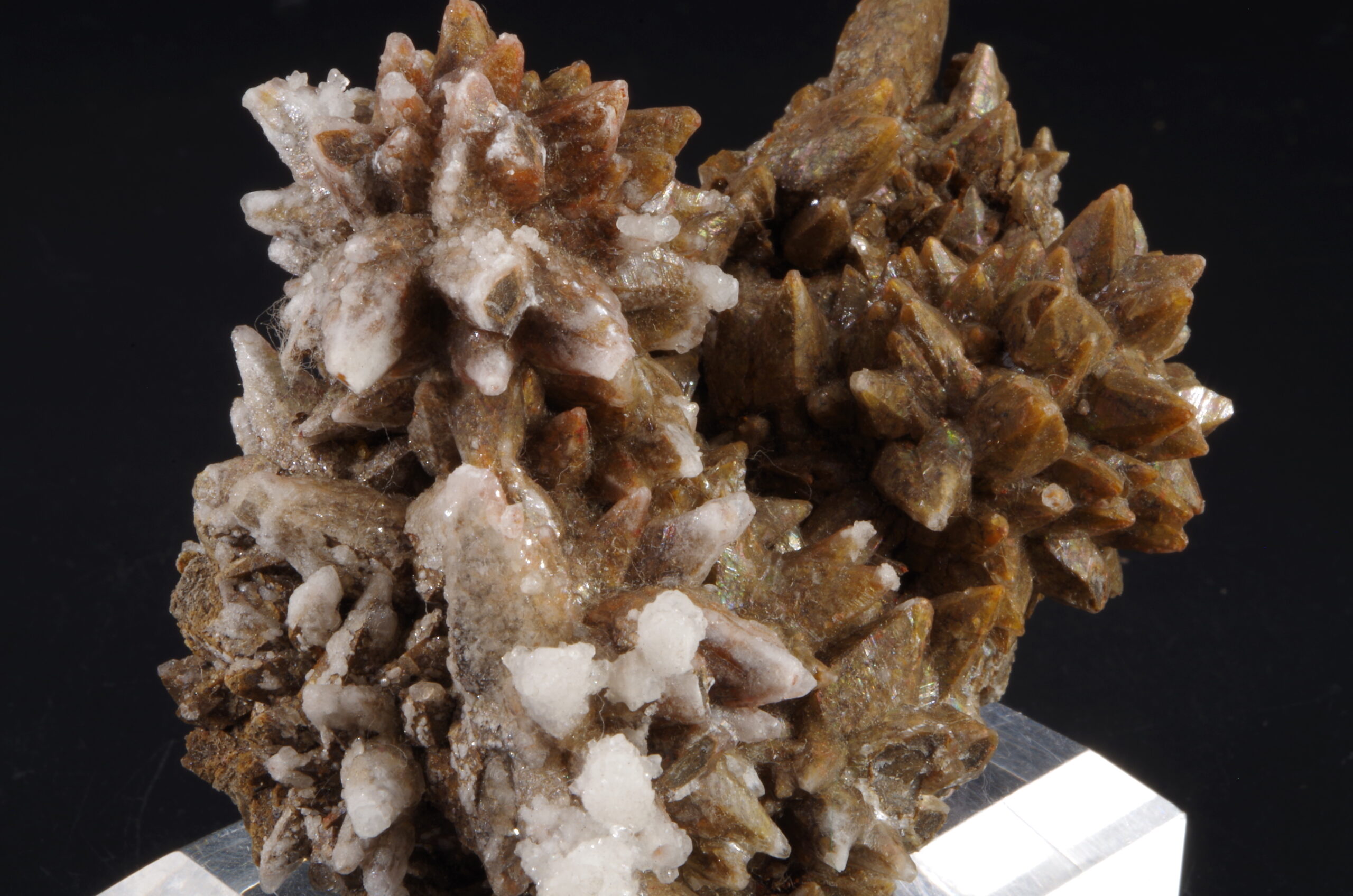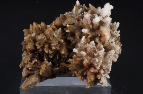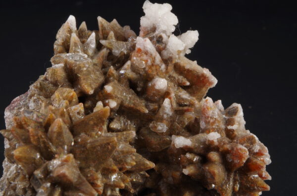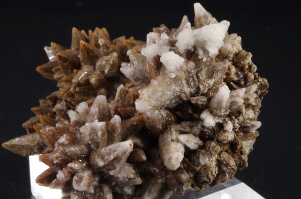 Jolie Calcite « dent de chien » bien exprimée de couleur brune parsemée d’une recristallisation blanc laiteux et de micro-quartz limpides.
