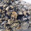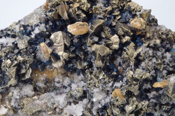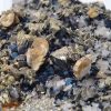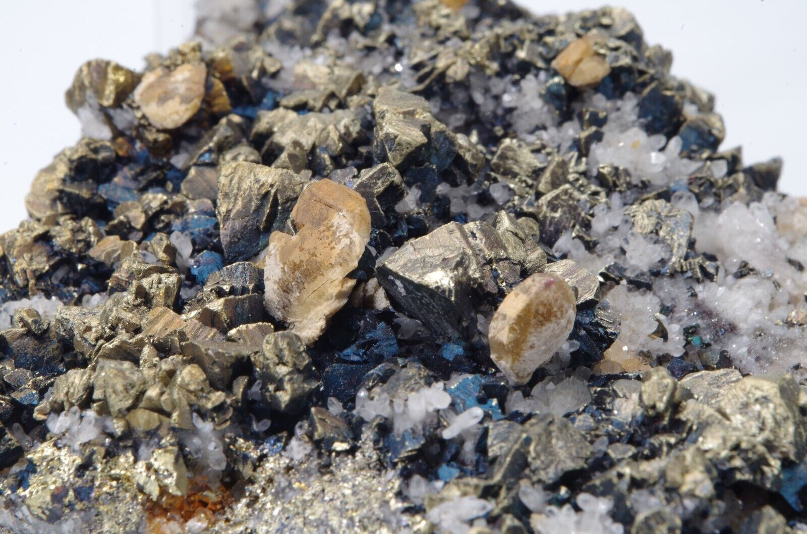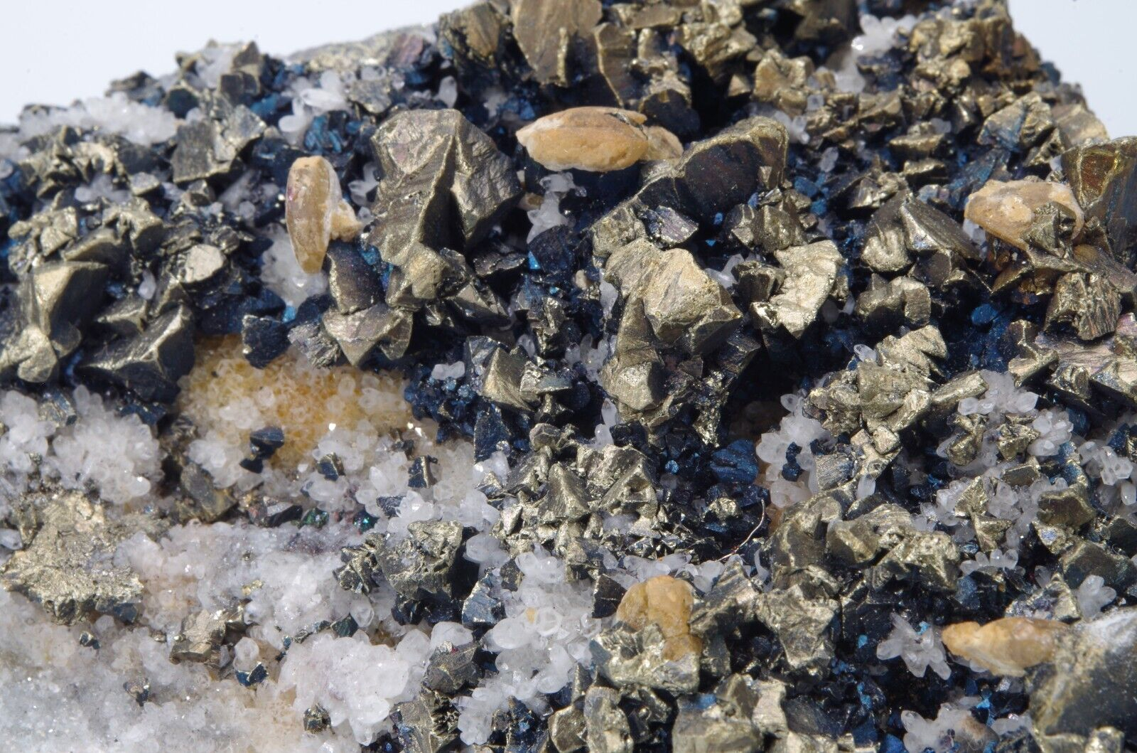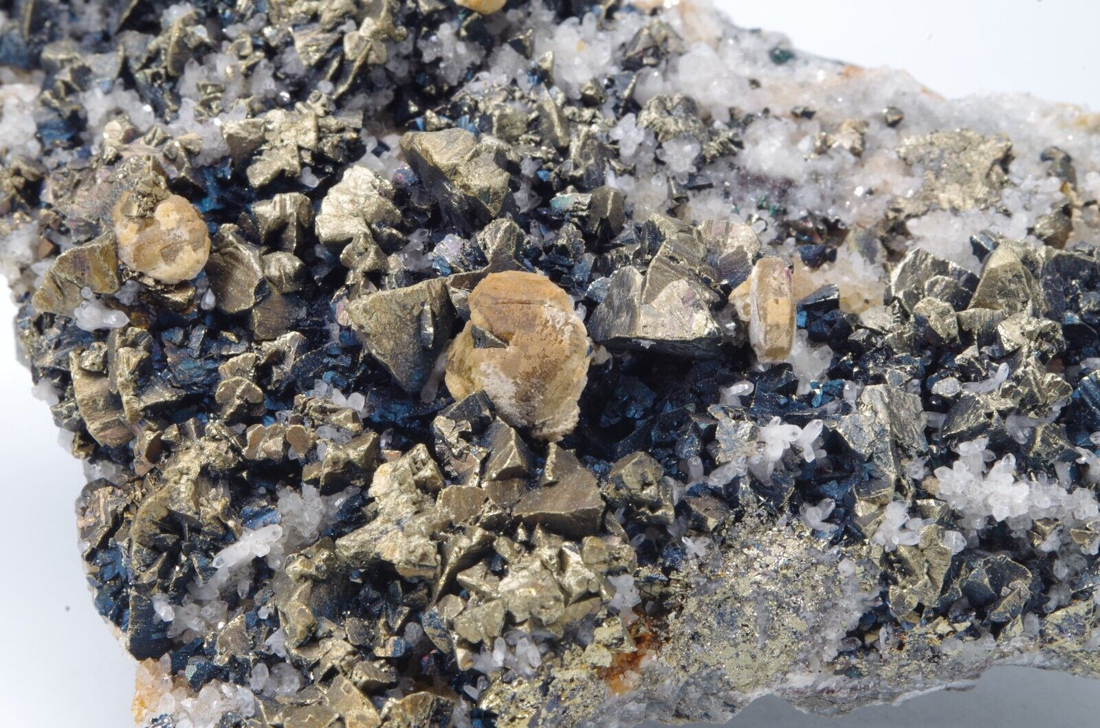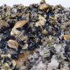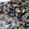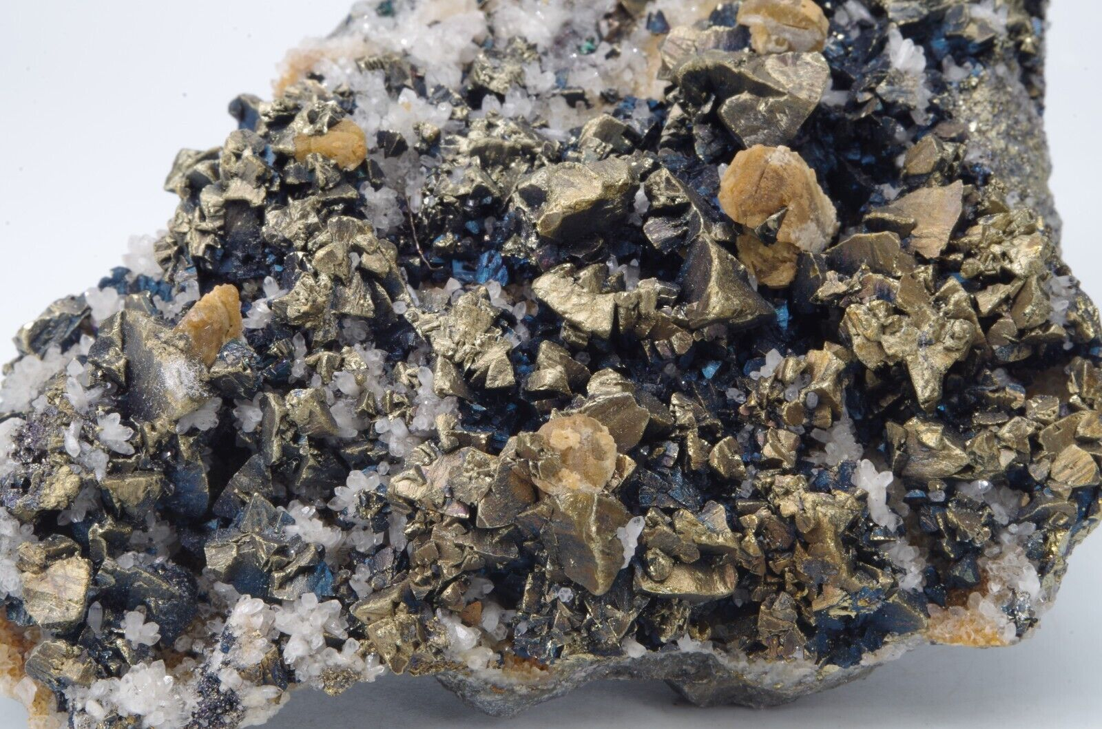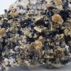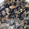 Jolie et rare association de chalcopyrite tétraédrique noire irisée à dorée avec quartz miniature et lamelles de muscovite