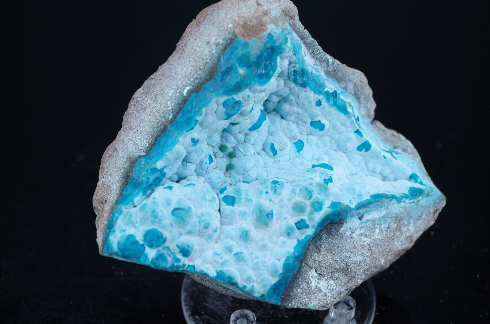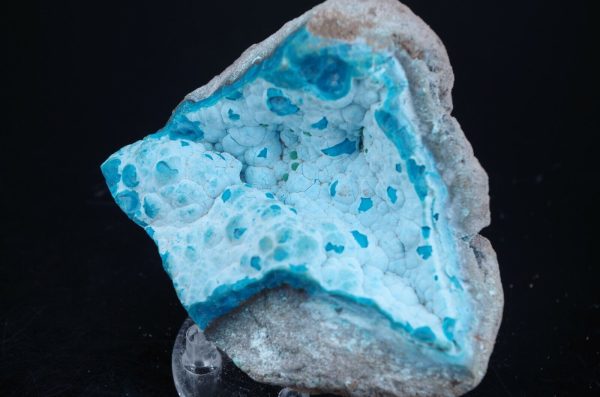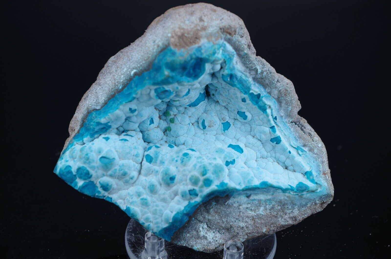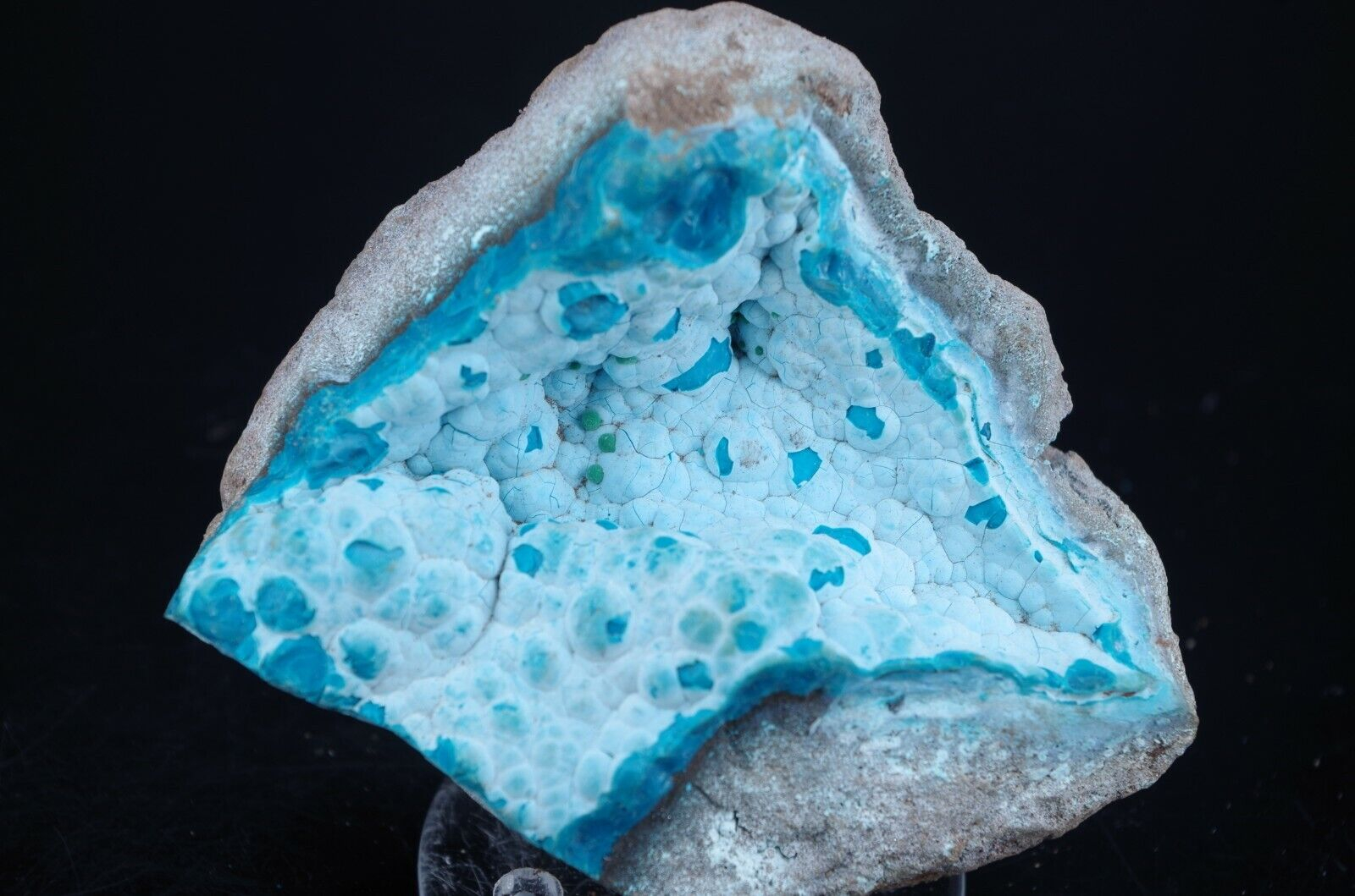 Chrysocolle aux nuances bleu ciel – turquoise tapissant la matrice formant une petite géode