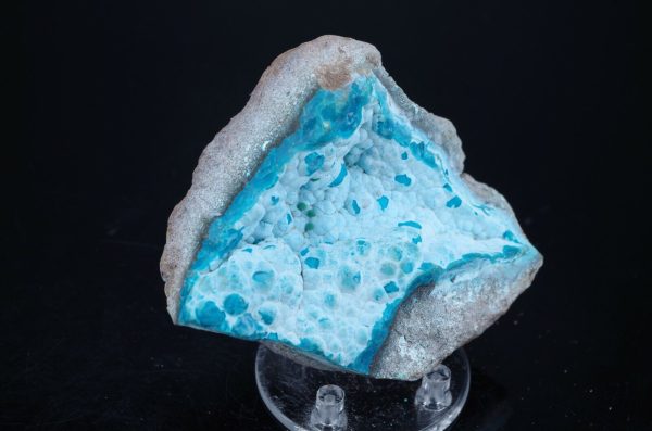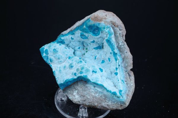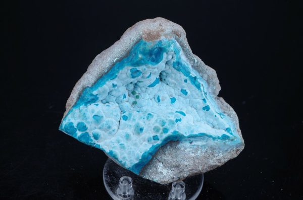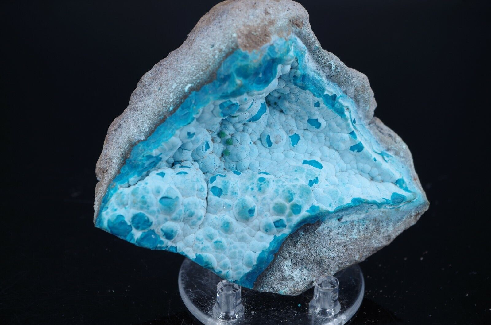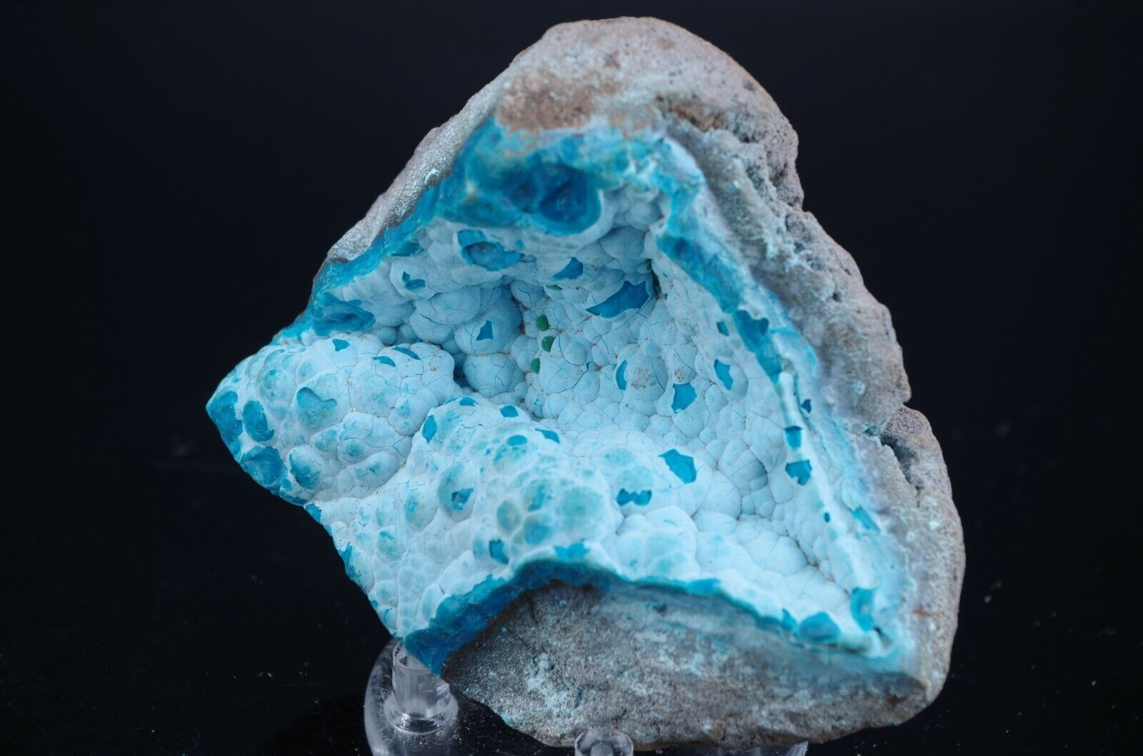 Chrysocolle aux nuances bleu ciel – turquoise tapissant la matrice formant une petite géode