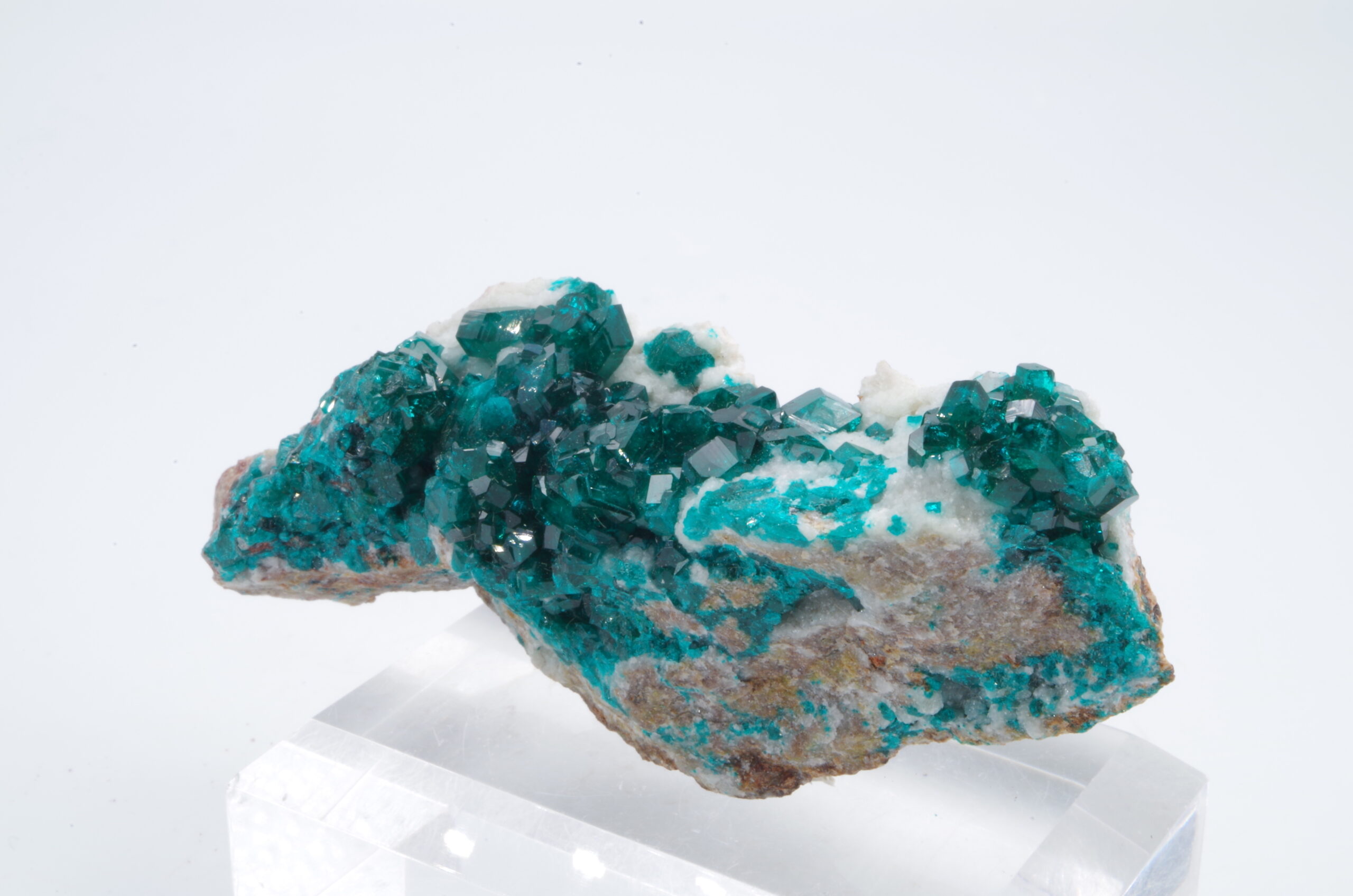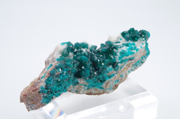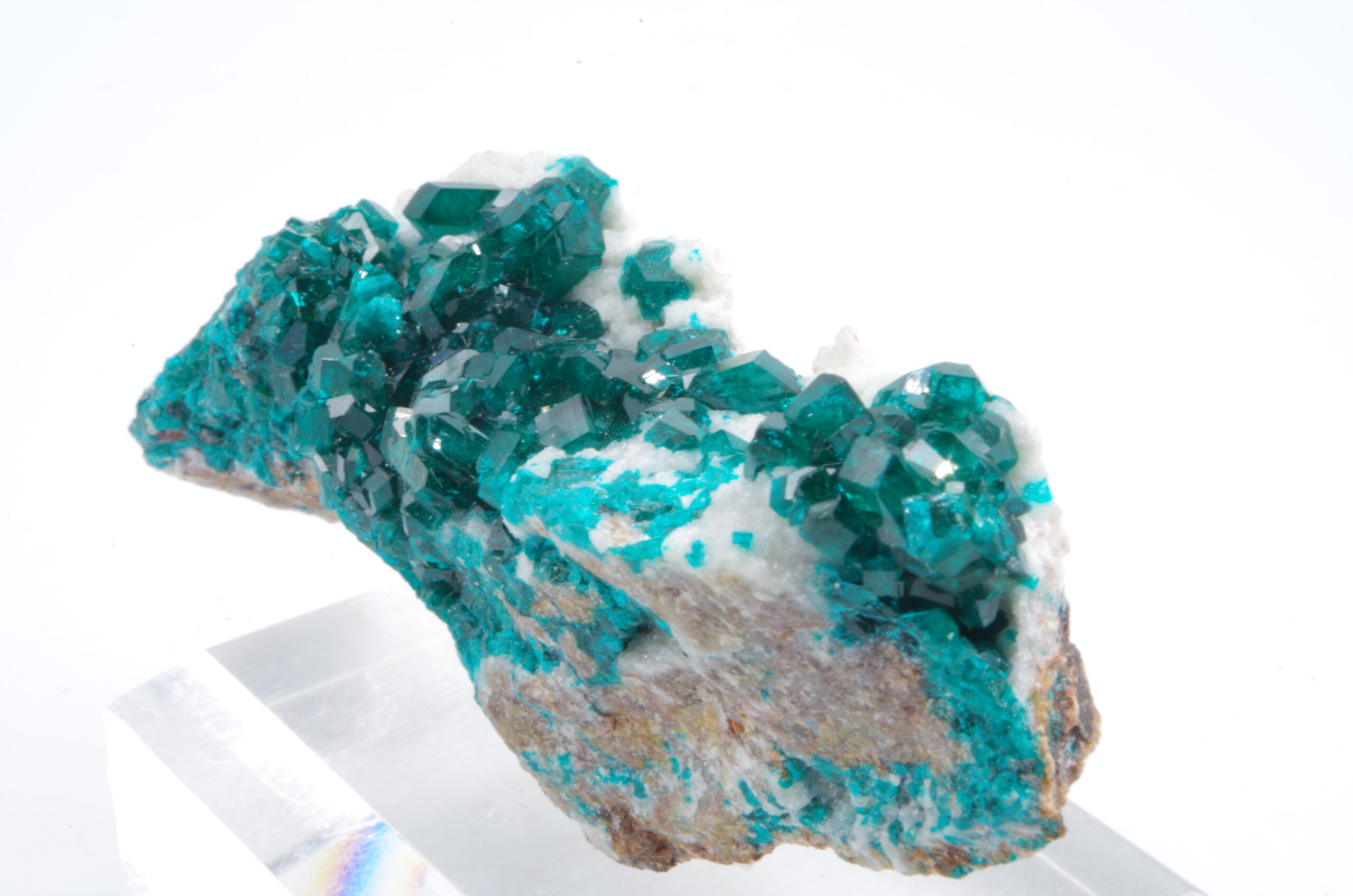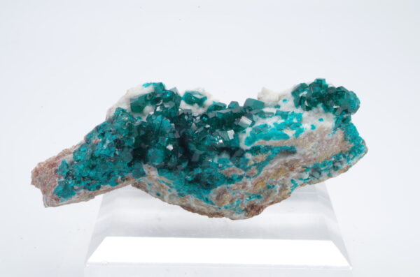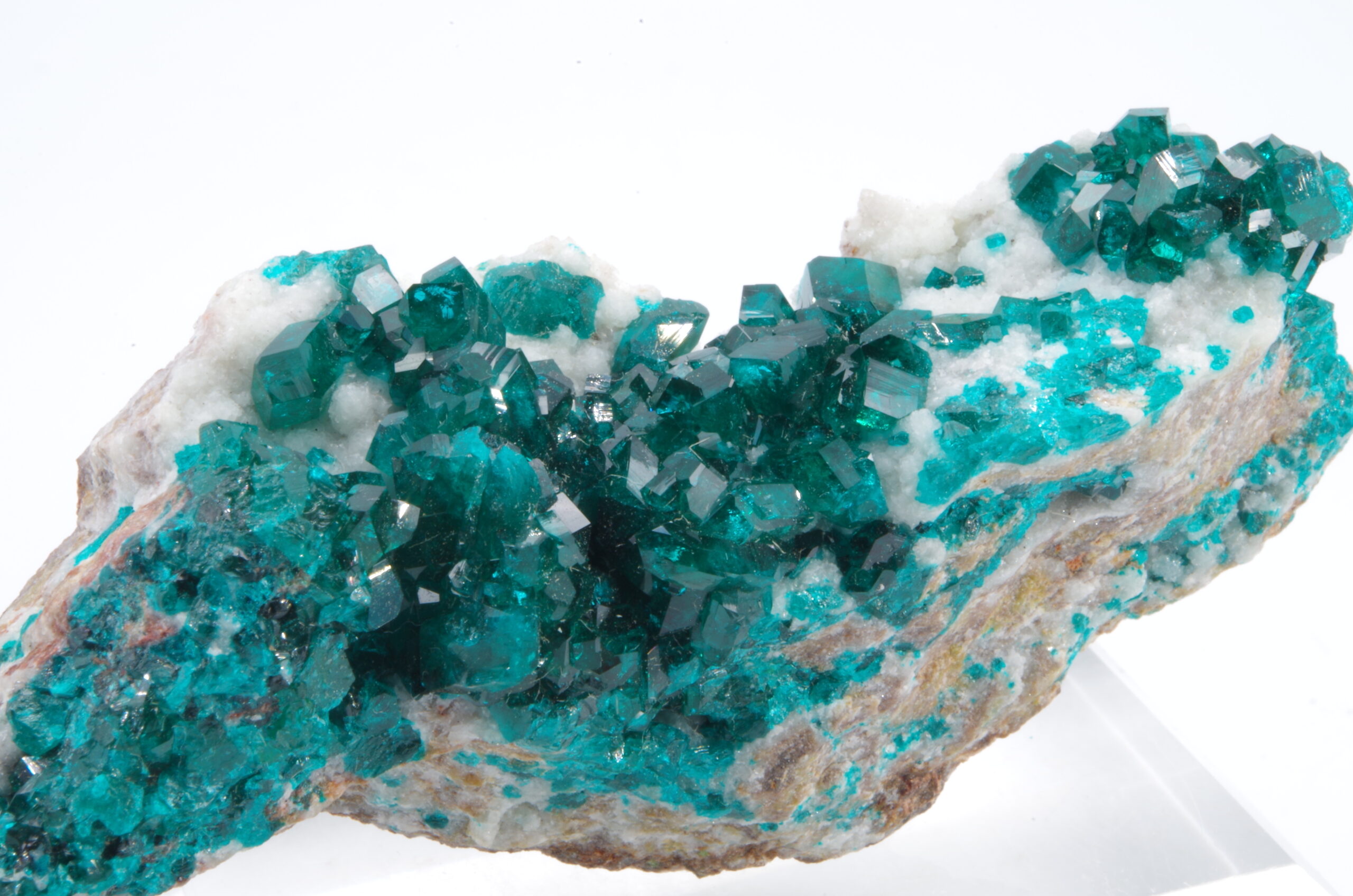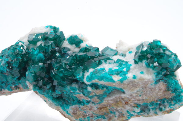 Excellentes petites cristallisations de Dioptase vert émeraude et brillantes complétées par du quartz blanc sur une petite matrice.