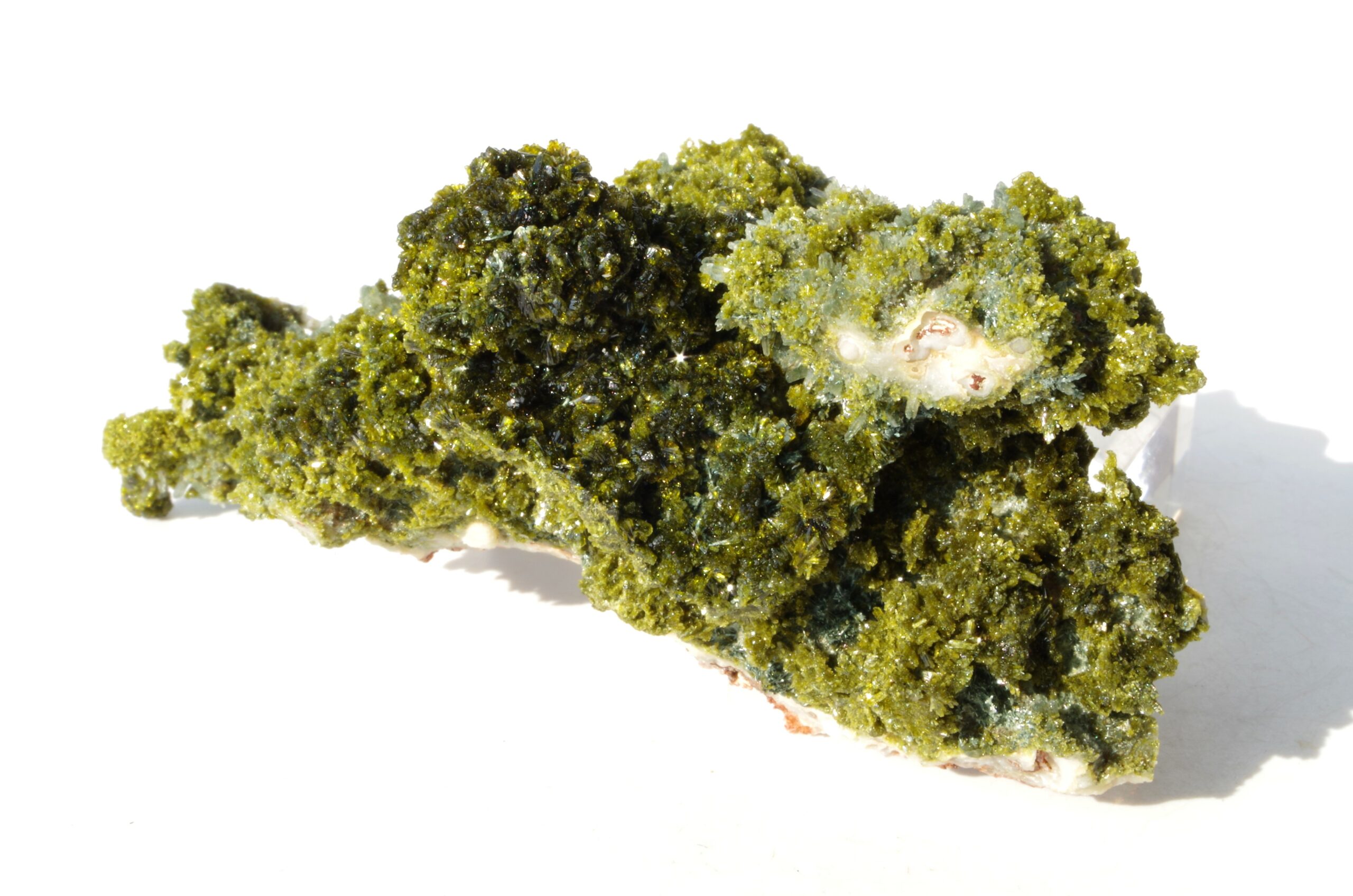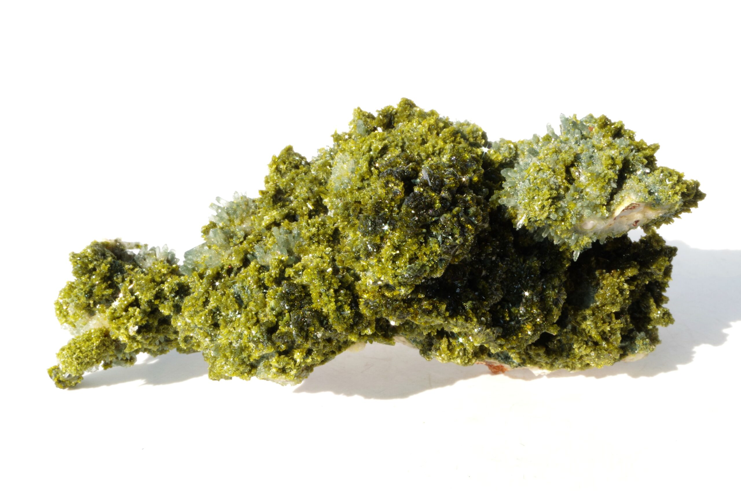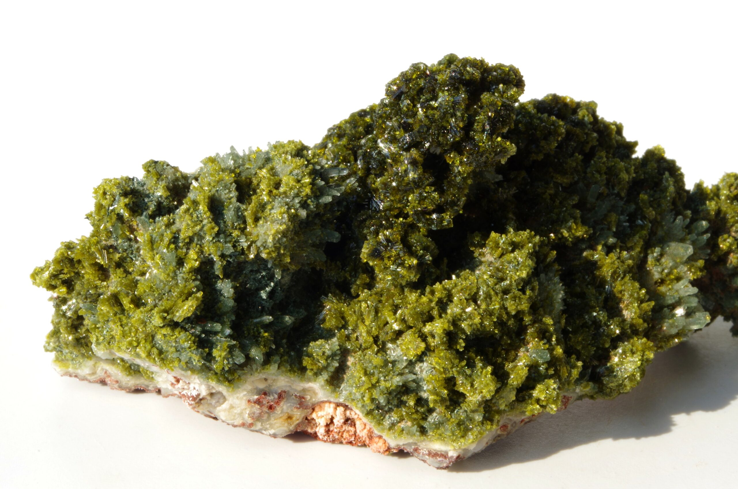 L’épidote est un minéral formé principalement de silicates de calcium, d’aluminium et de fer. Ses teintes distinctives vont du vert olive au vert foncé, parfois rehaussées de reflets dorés ou brunâtres.