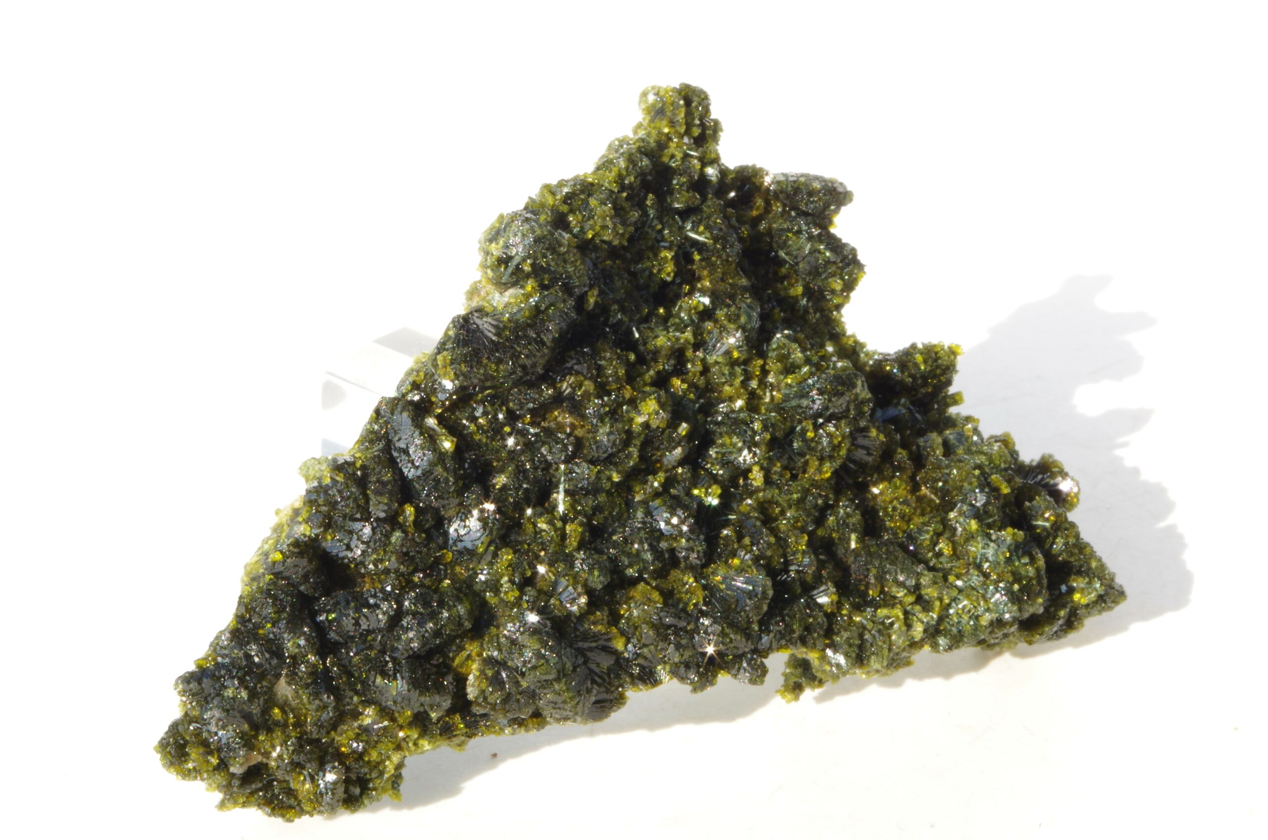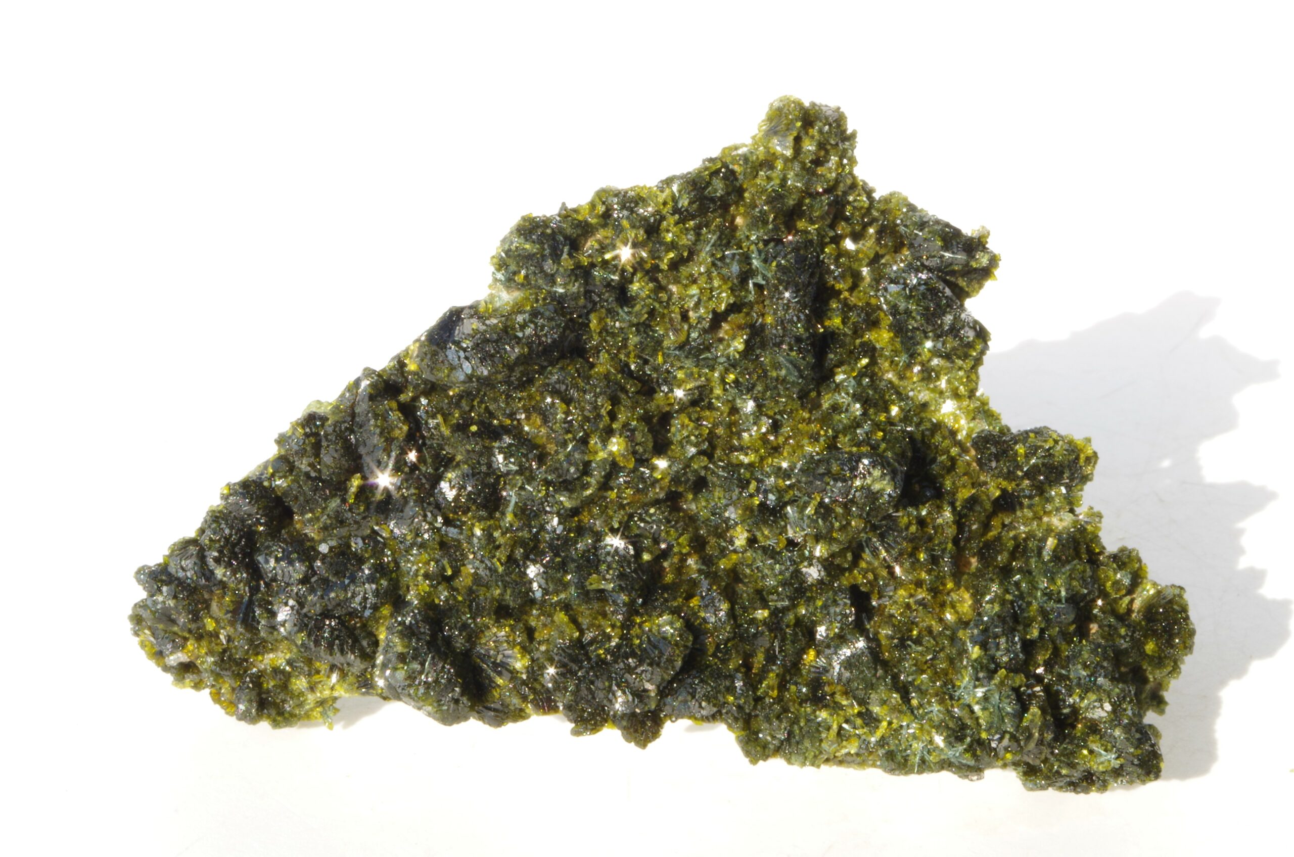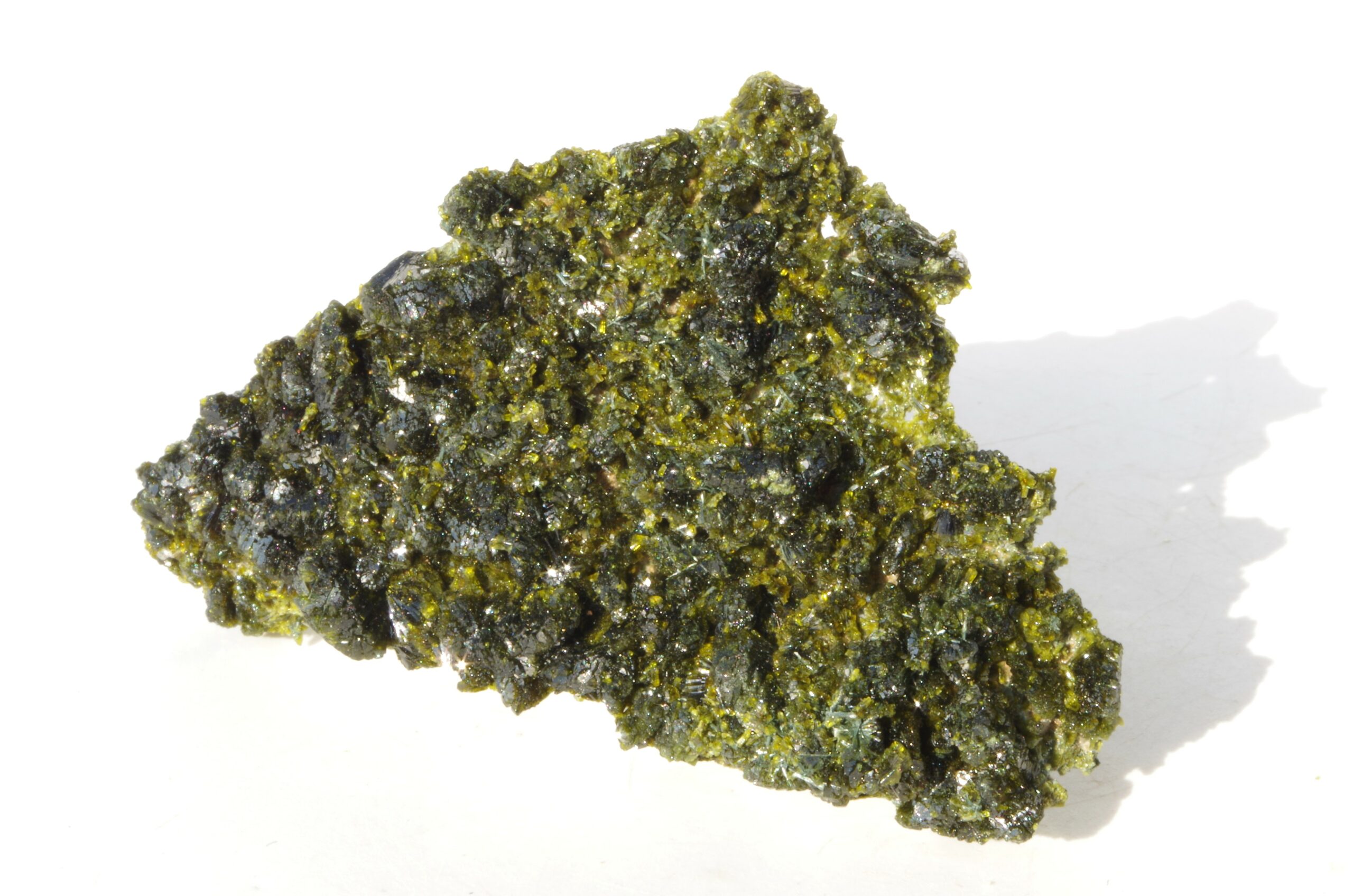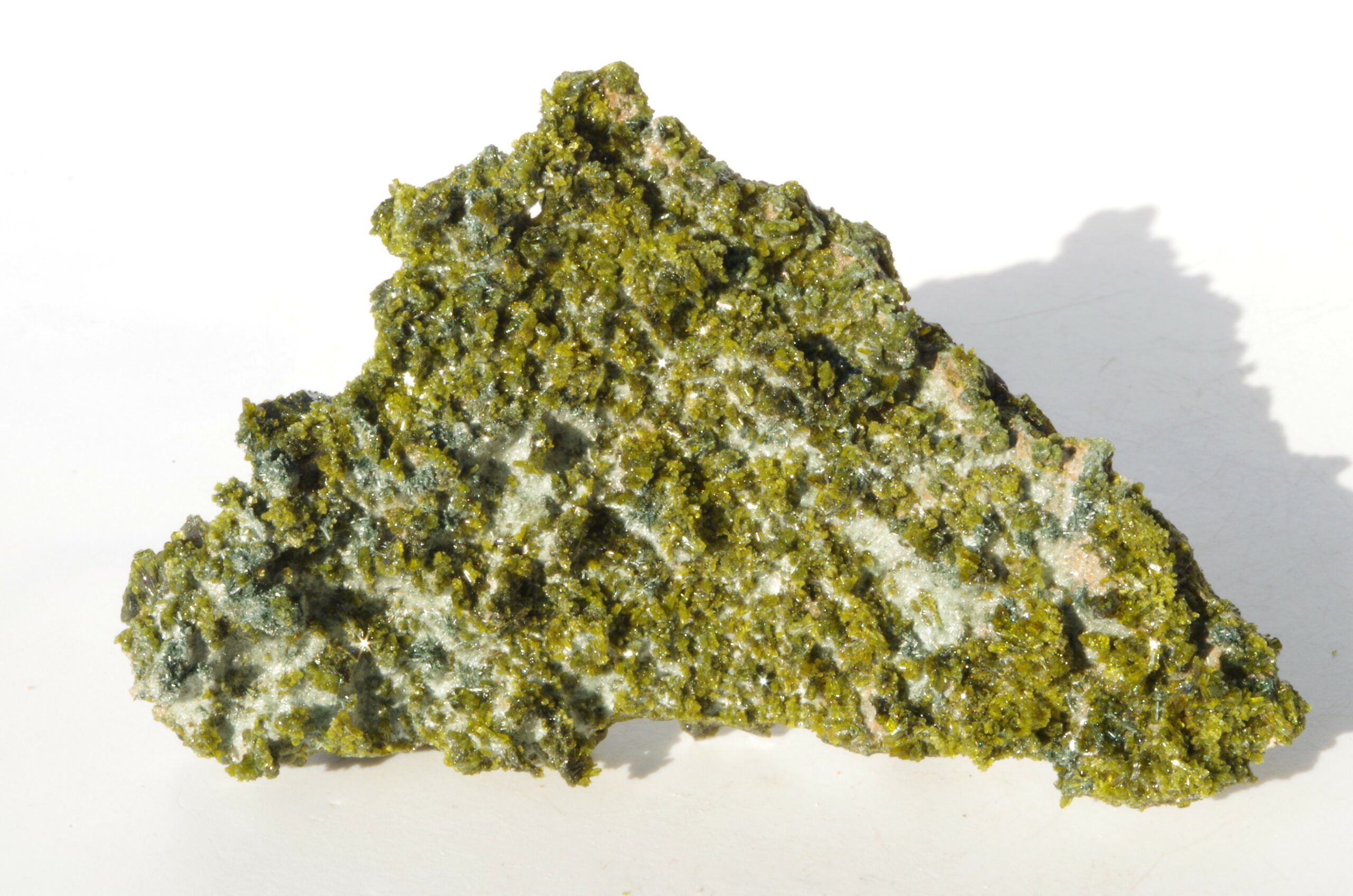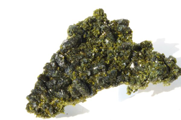 L’épidote est un minéral formé principalement de silicates de calcium, d’aluminium et de fer. Ses teintes distinctives vont du vert olive au vert foncé, parfois rehaussées de reflets dorés ou brunâtres.