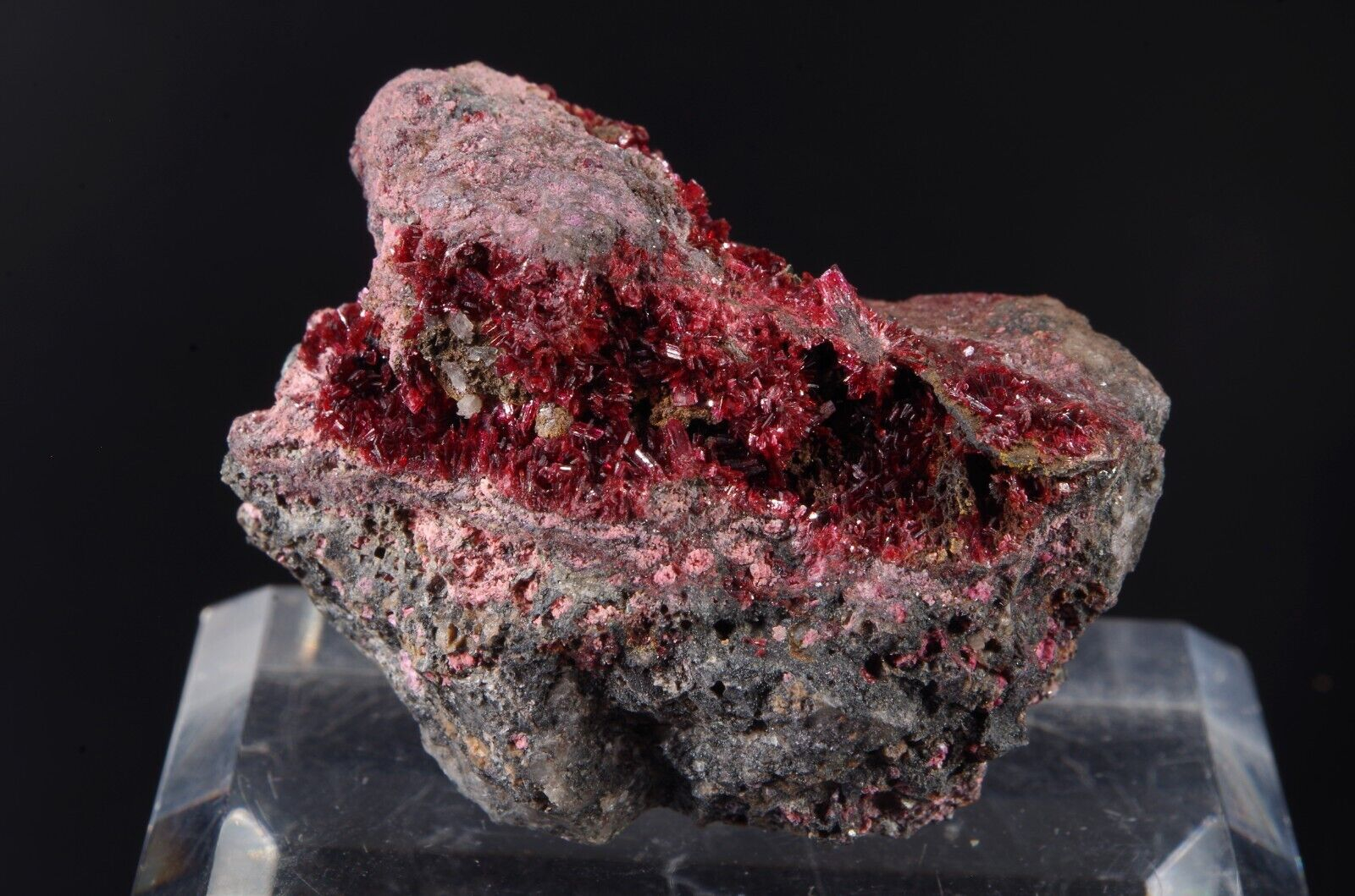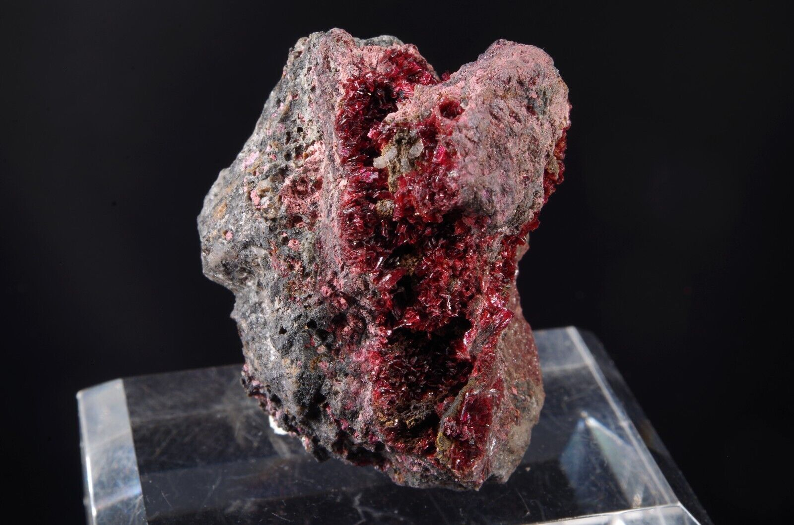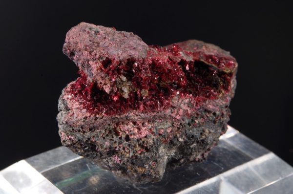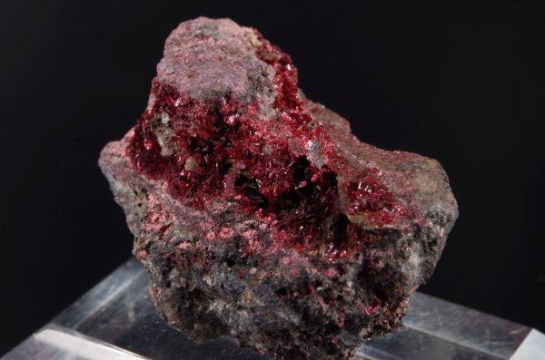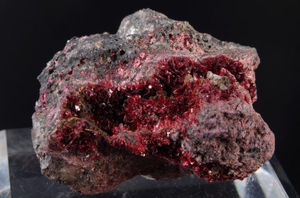 Jolie Erythrite parcourant la matrice présentant des cristallisations pourpres et brillantes.