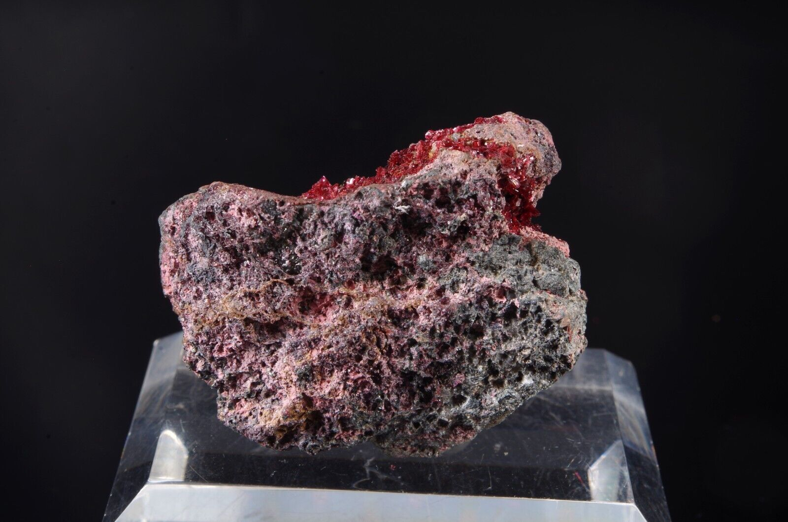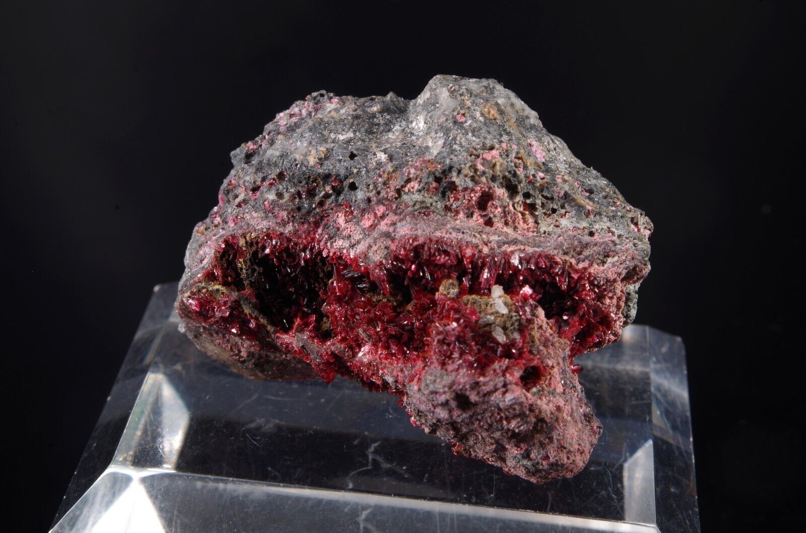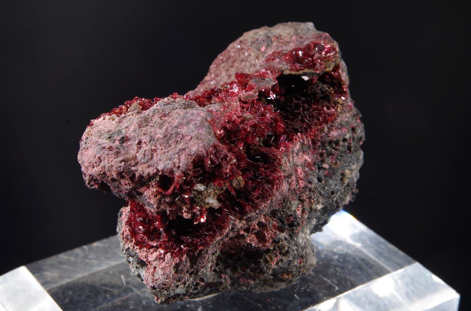Jolie Erythrite parcourant la matrice présentant des cristallisations pourpres et brillantes.
