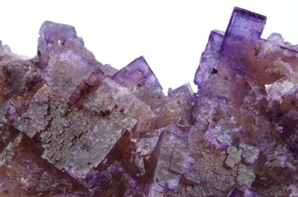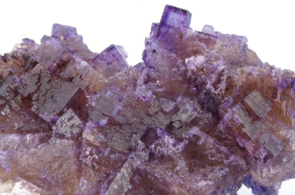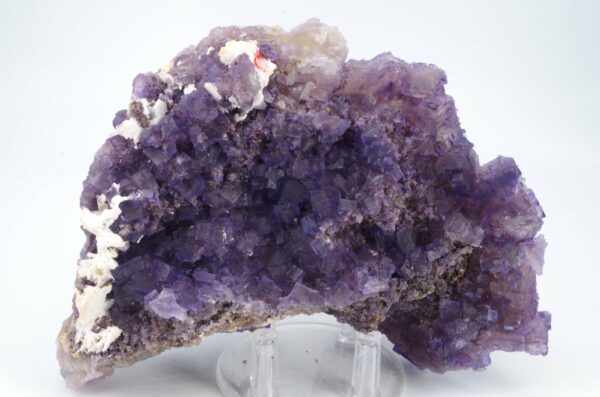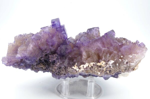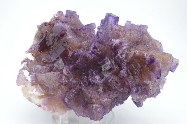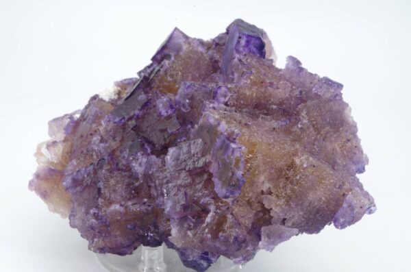 Excellent assemblage de Fluorite bicolore à dominance mauve avec des jolis zonages et des faces sculptées par des dissolutions révélant davantage les cœurs jaunes des formations. Quelques inclusions de Chalcopyrite et petites formations de Baryte sur les bords extérieurs. L’arrière de la pièce est également cristallisée par des petits cubes mauves et de la baryte. Ensemble en très bonne condition. Spécimen issu d’une acquisition à Tucson en 1994.