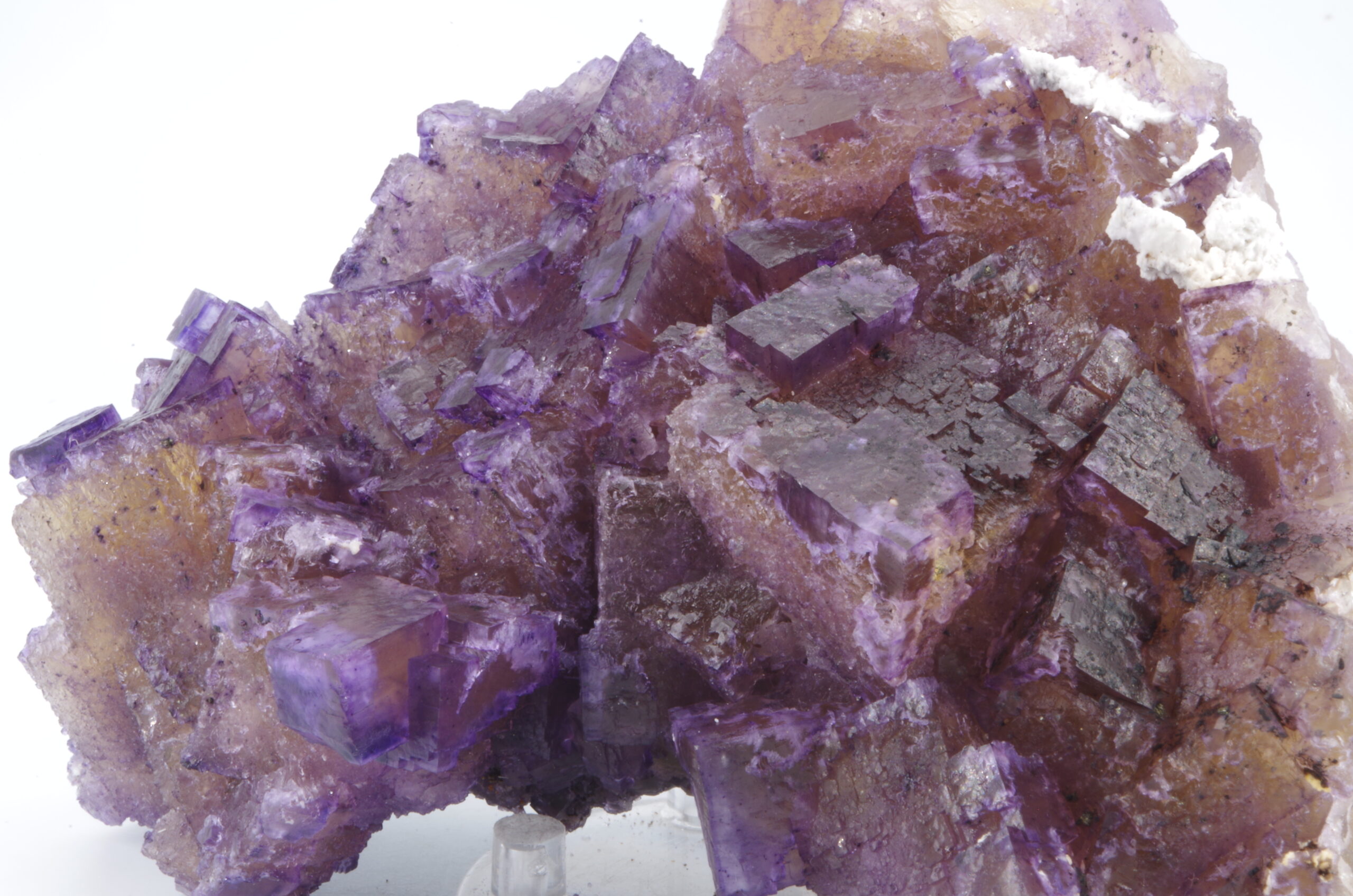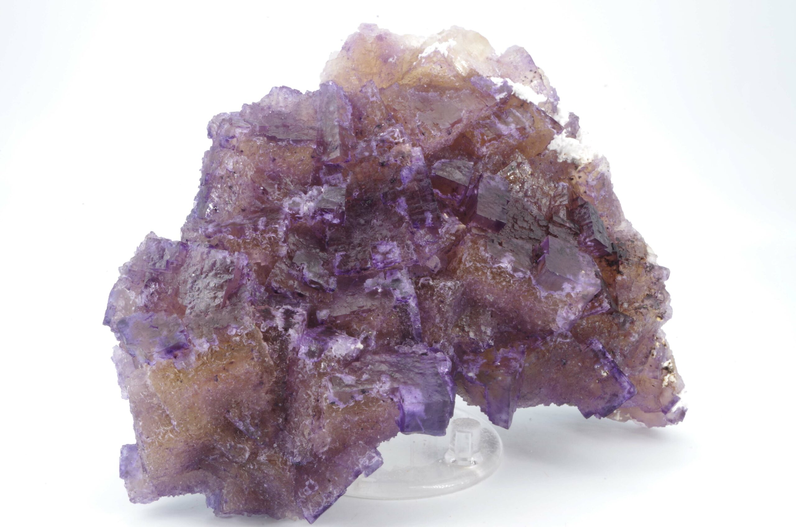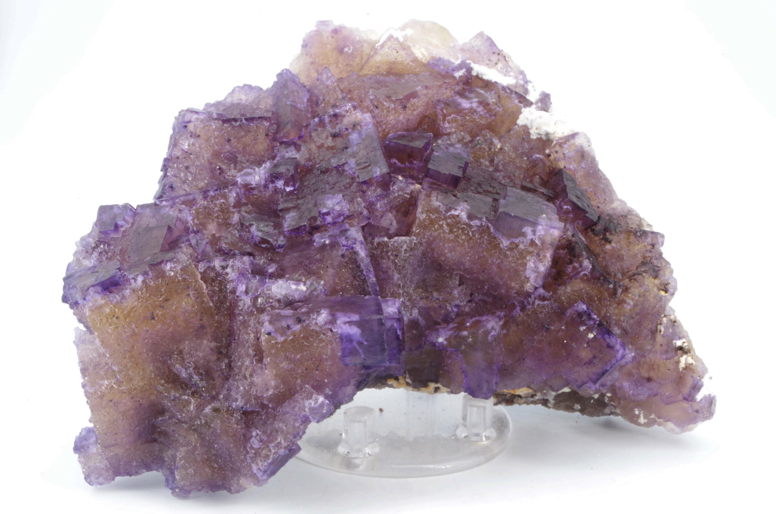 Excellent assemblage de Fluorite bicolore à dominance mauve avec des jolis zonages et des faces sculptées par des dissolutions révélant davantage les cœurs jaunes des formations. Quelques inclusions de Chalcopyrite et petites formations de Baryte sur les bords extérieurs. L’arrière de la pièce est également cristallisée par des petits cubes mauves et de la baryte. Ensemble en très bonne condition. Spécimen issu d’une acquisition à Tucson en 1994.