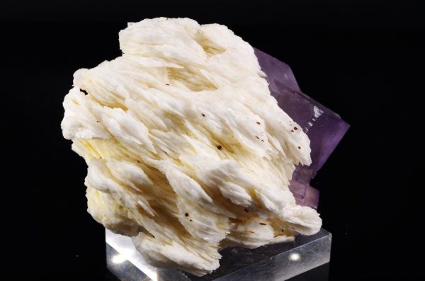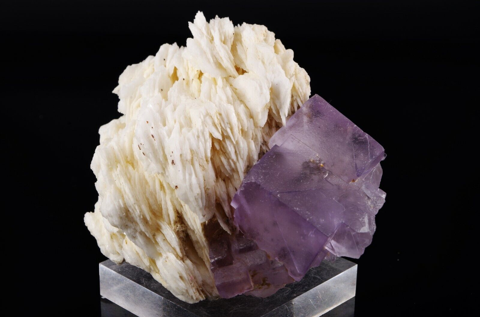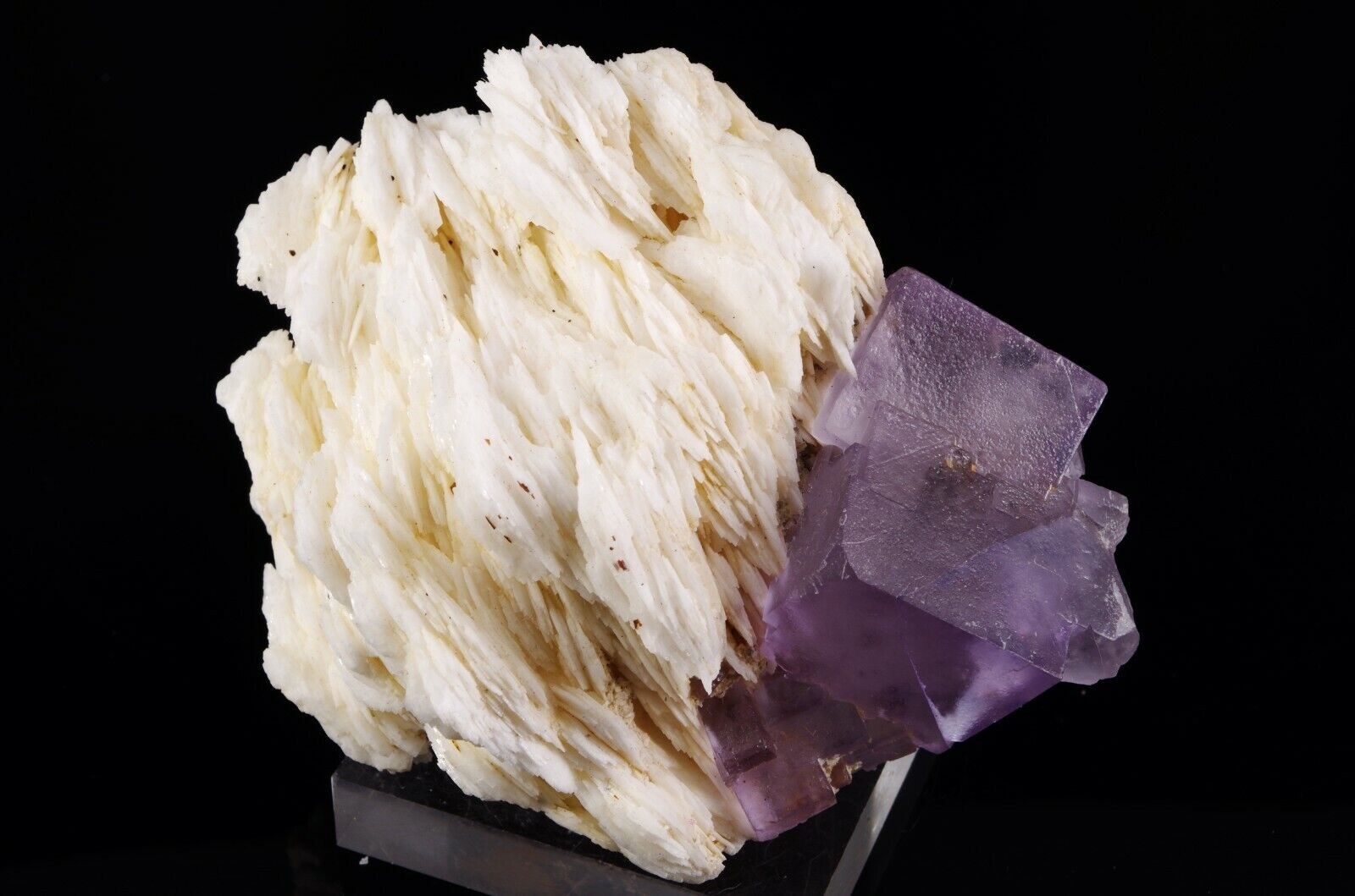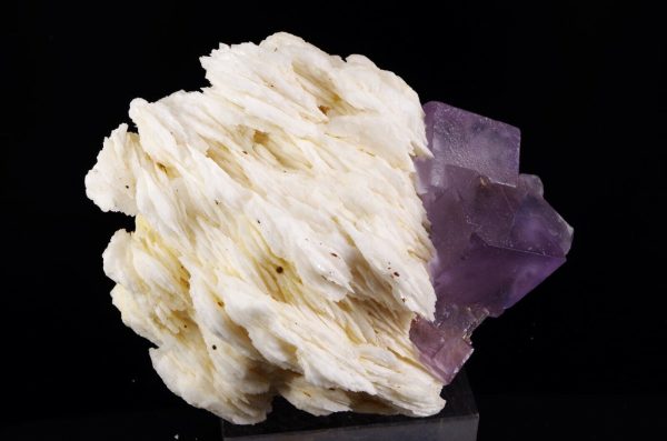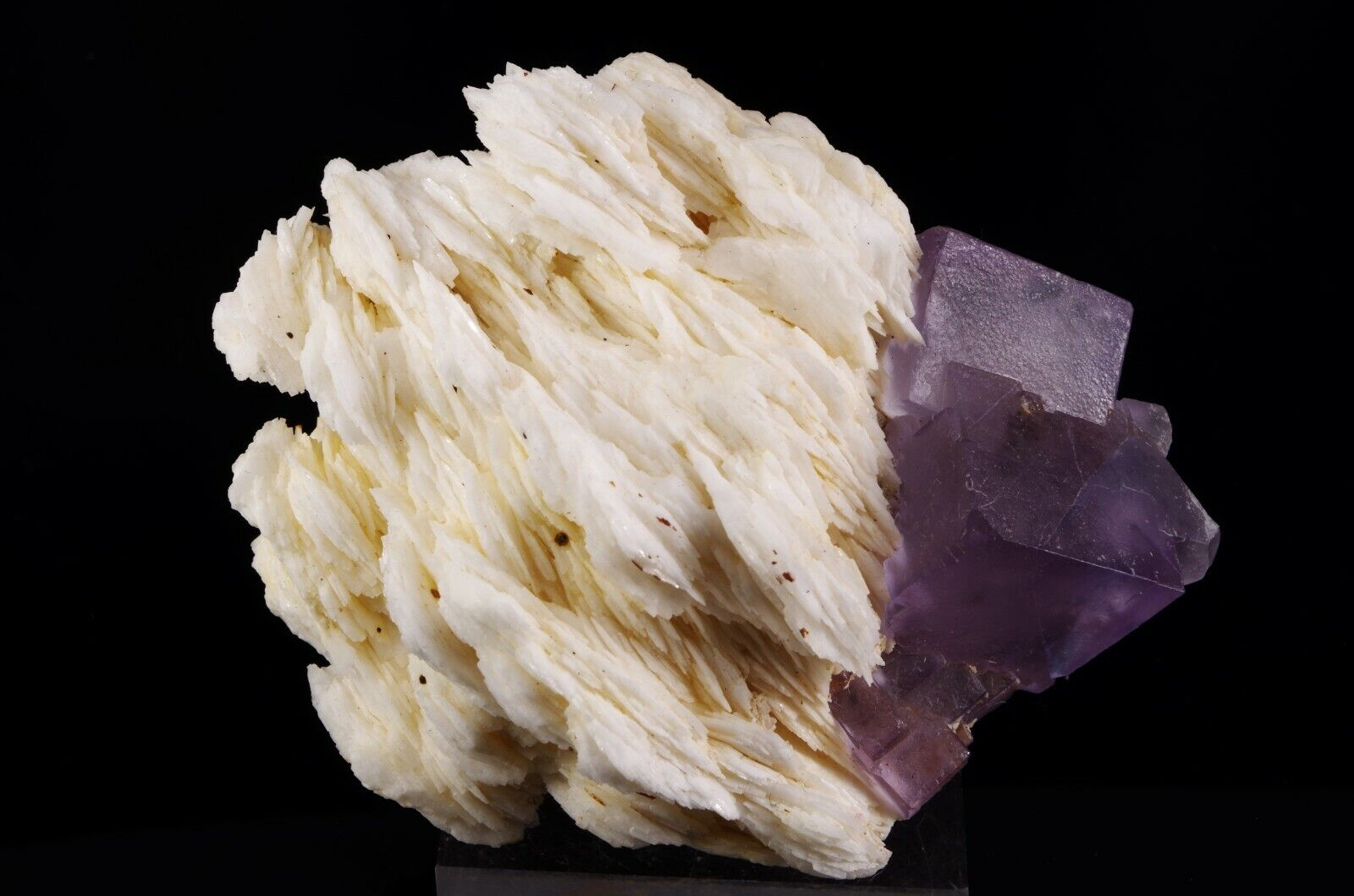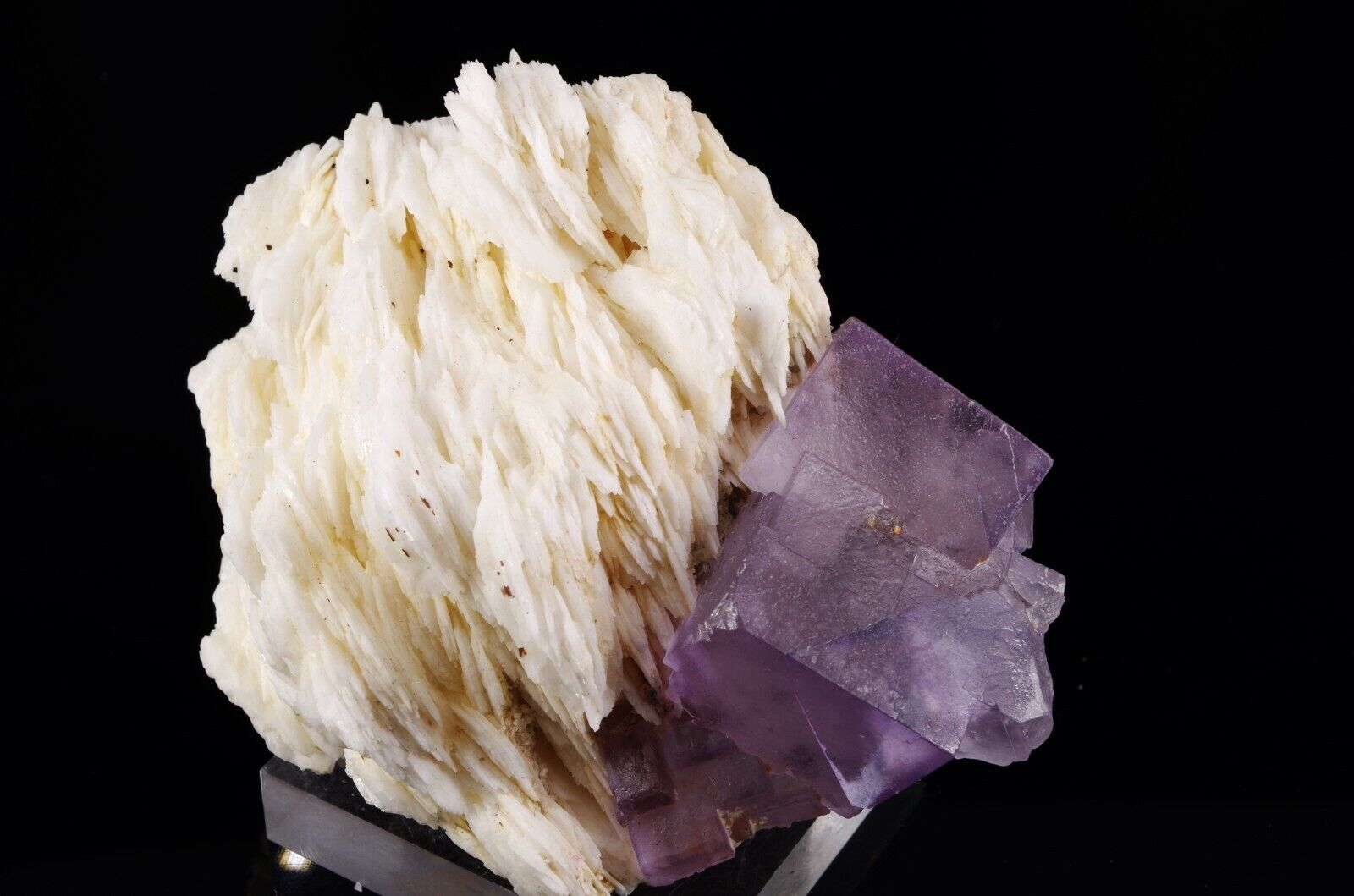 Fantastique combinaison de baryte blanche en lamelles et cube imbriqués de fluorite translucide violette.