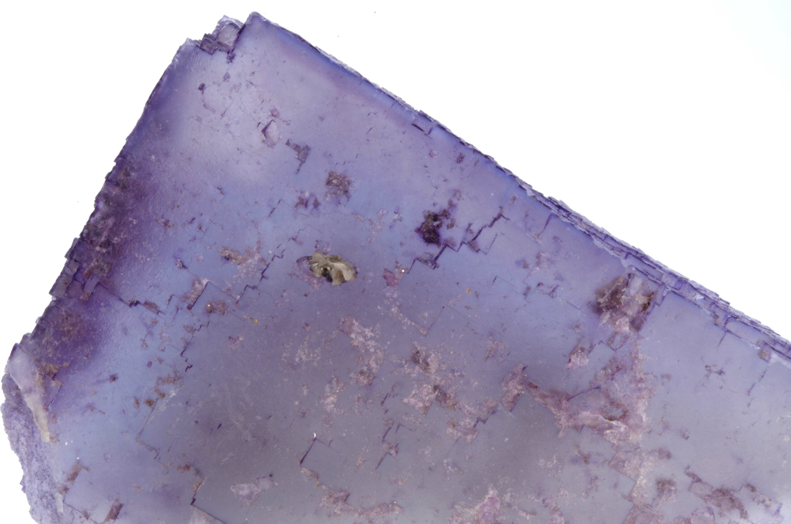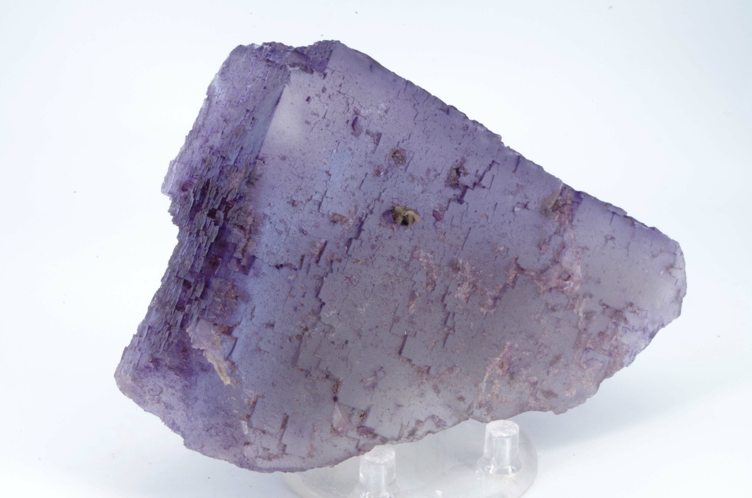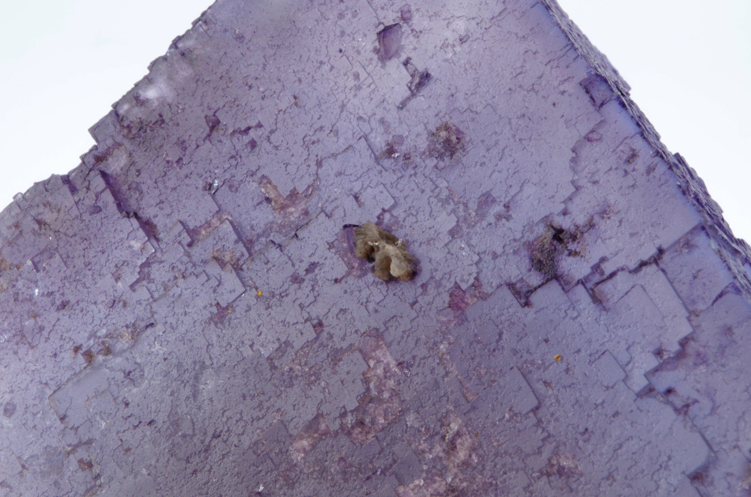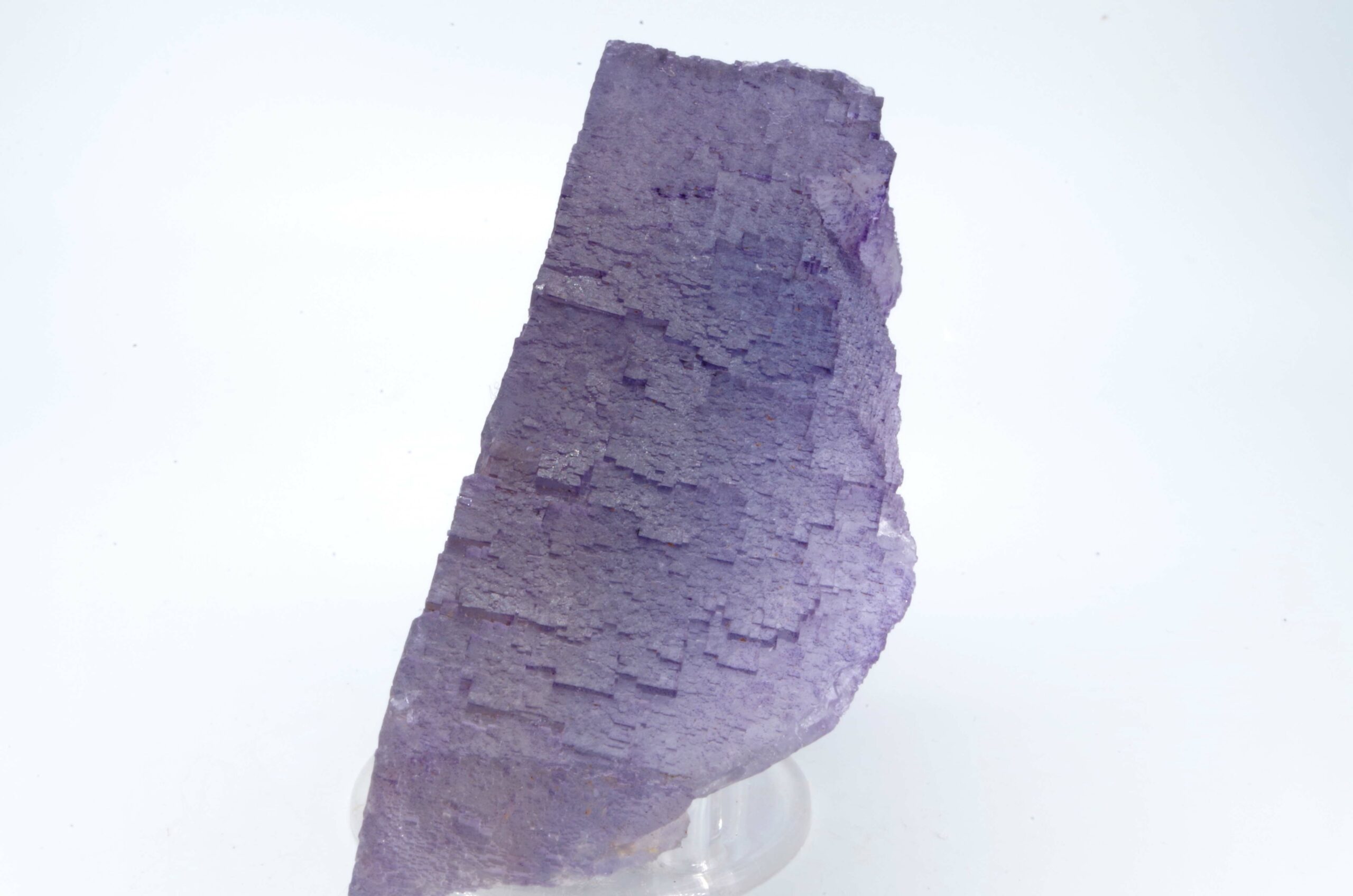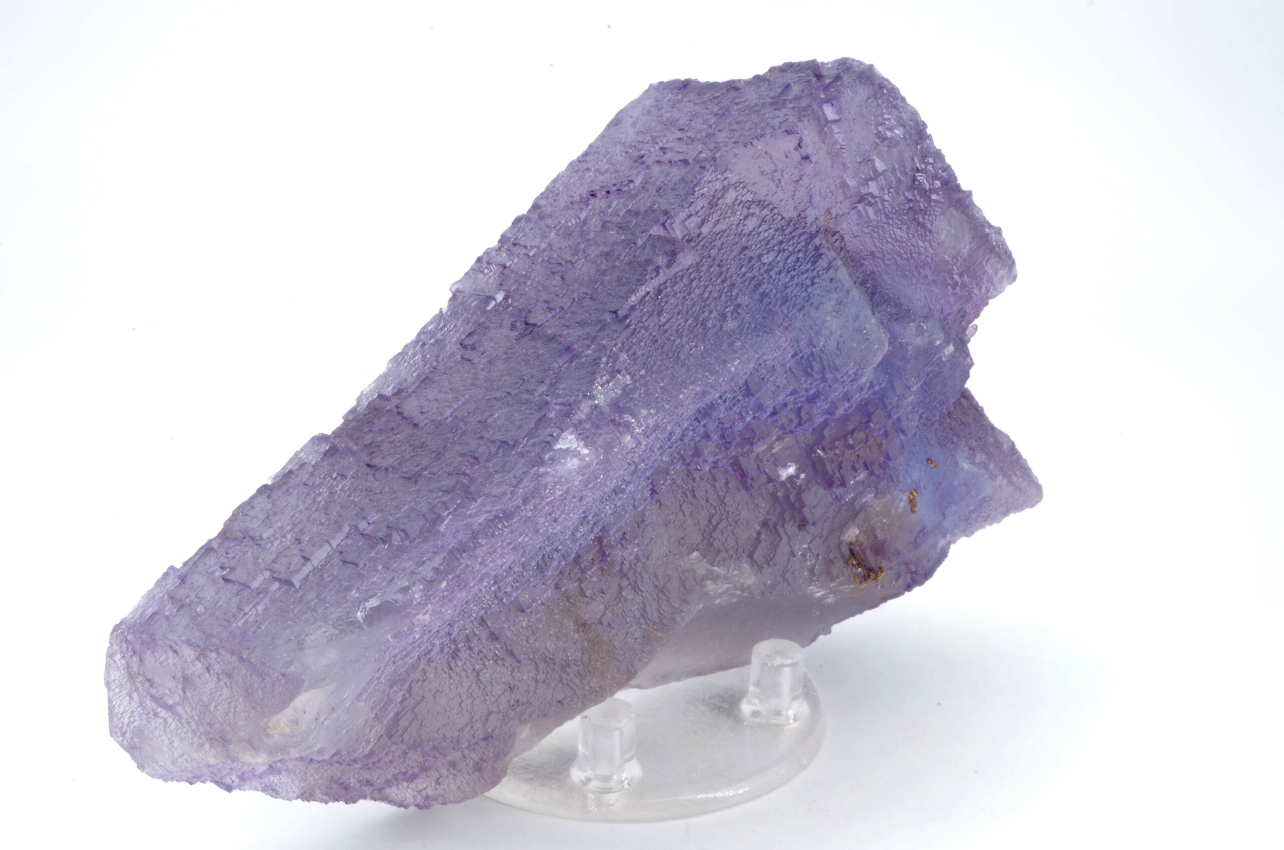 Excellent spécimen de Fluorite translucide avec une surface aux multiples empruntes cubiques de croissance et partiellement surcristalisé. L’angle au sommet est également joliment dessiné.