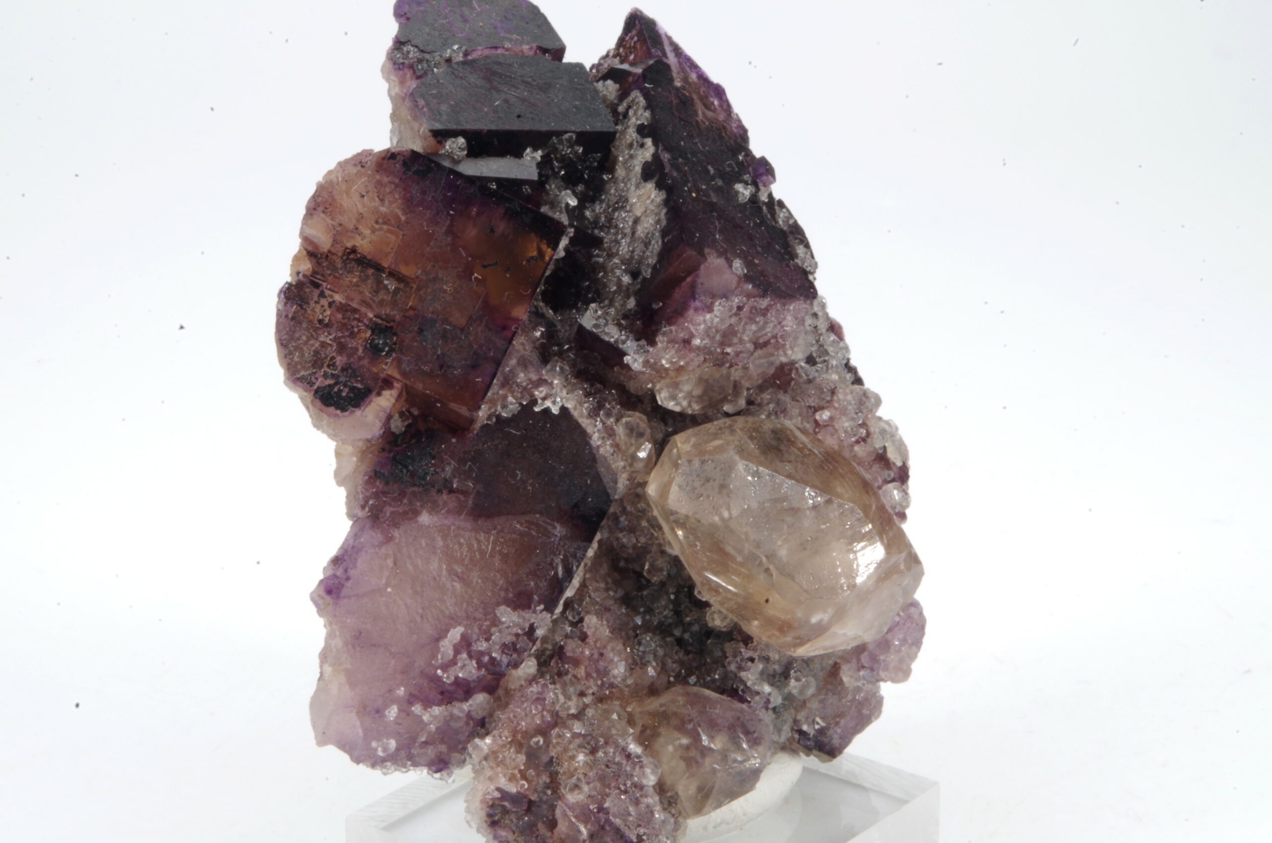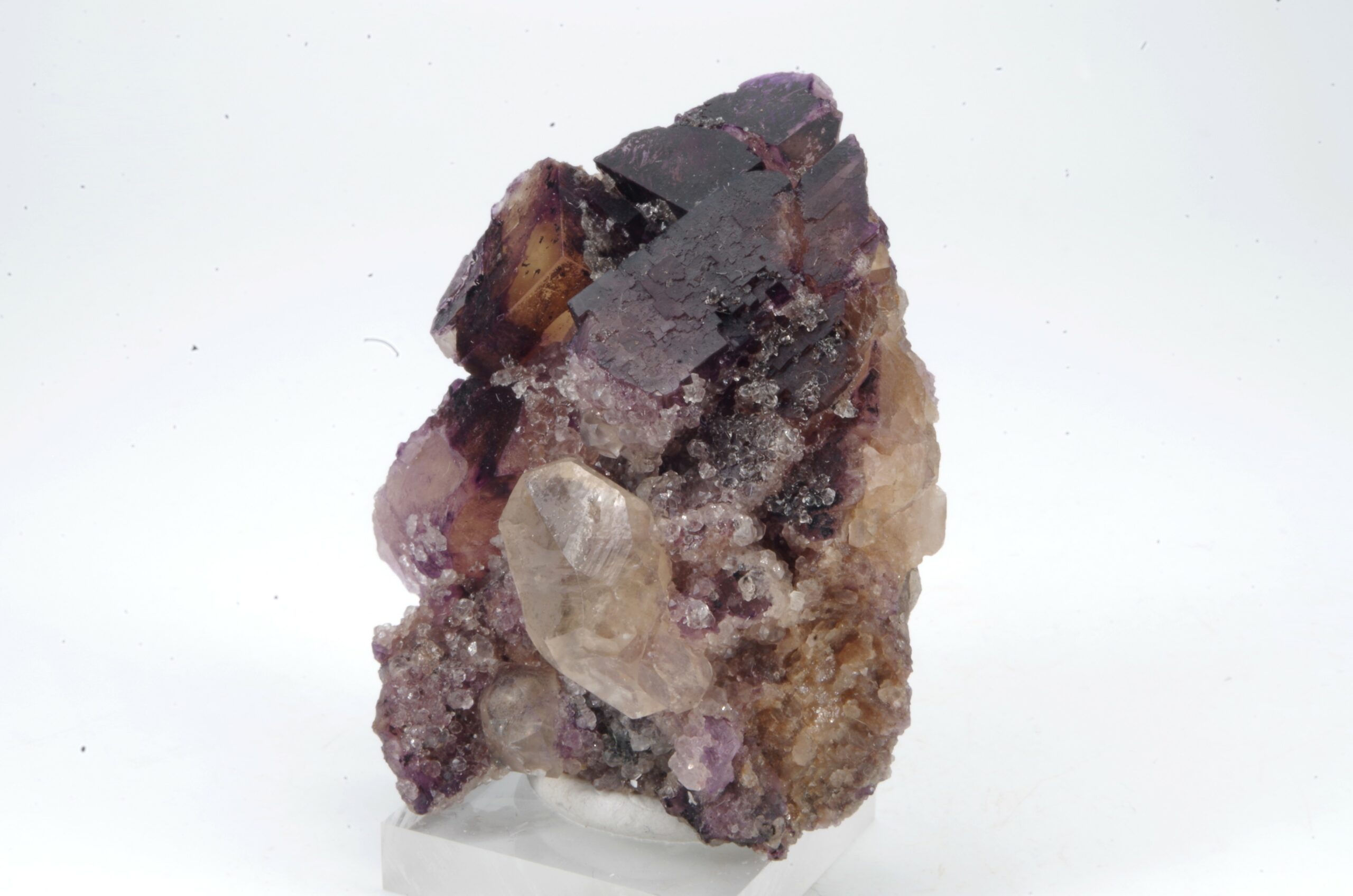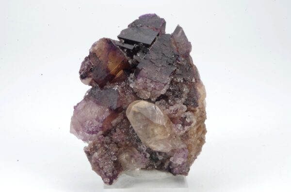 Bel assemblage de Fluorite bicolore complété d’un joli cristal de Calcite.