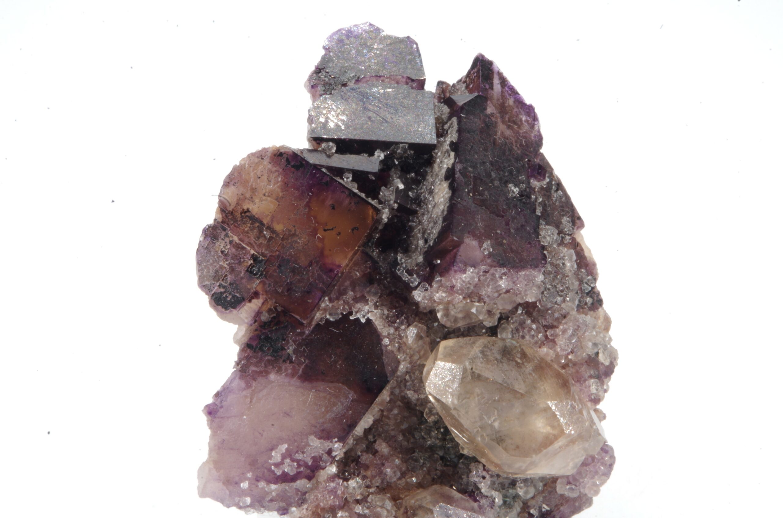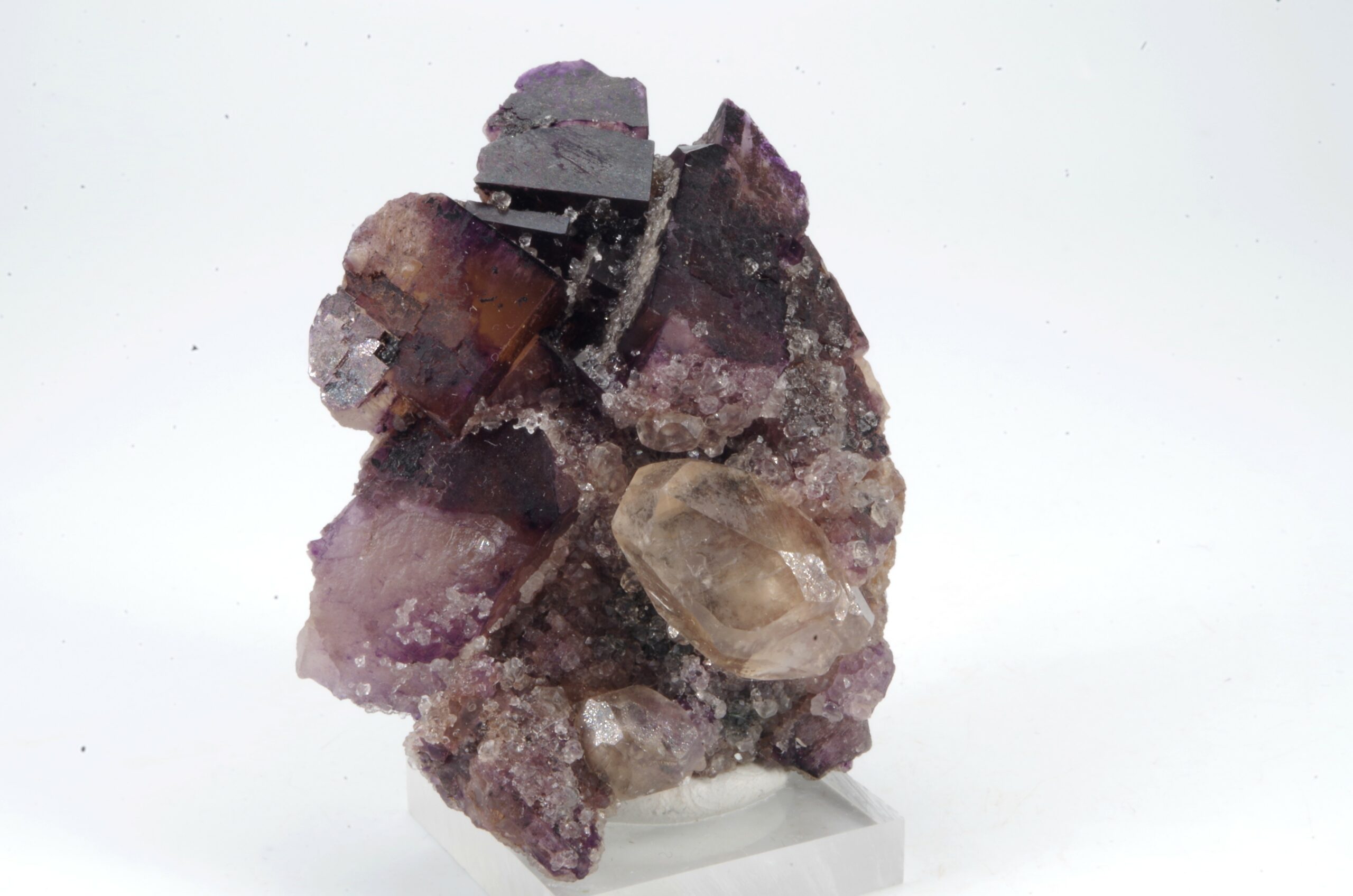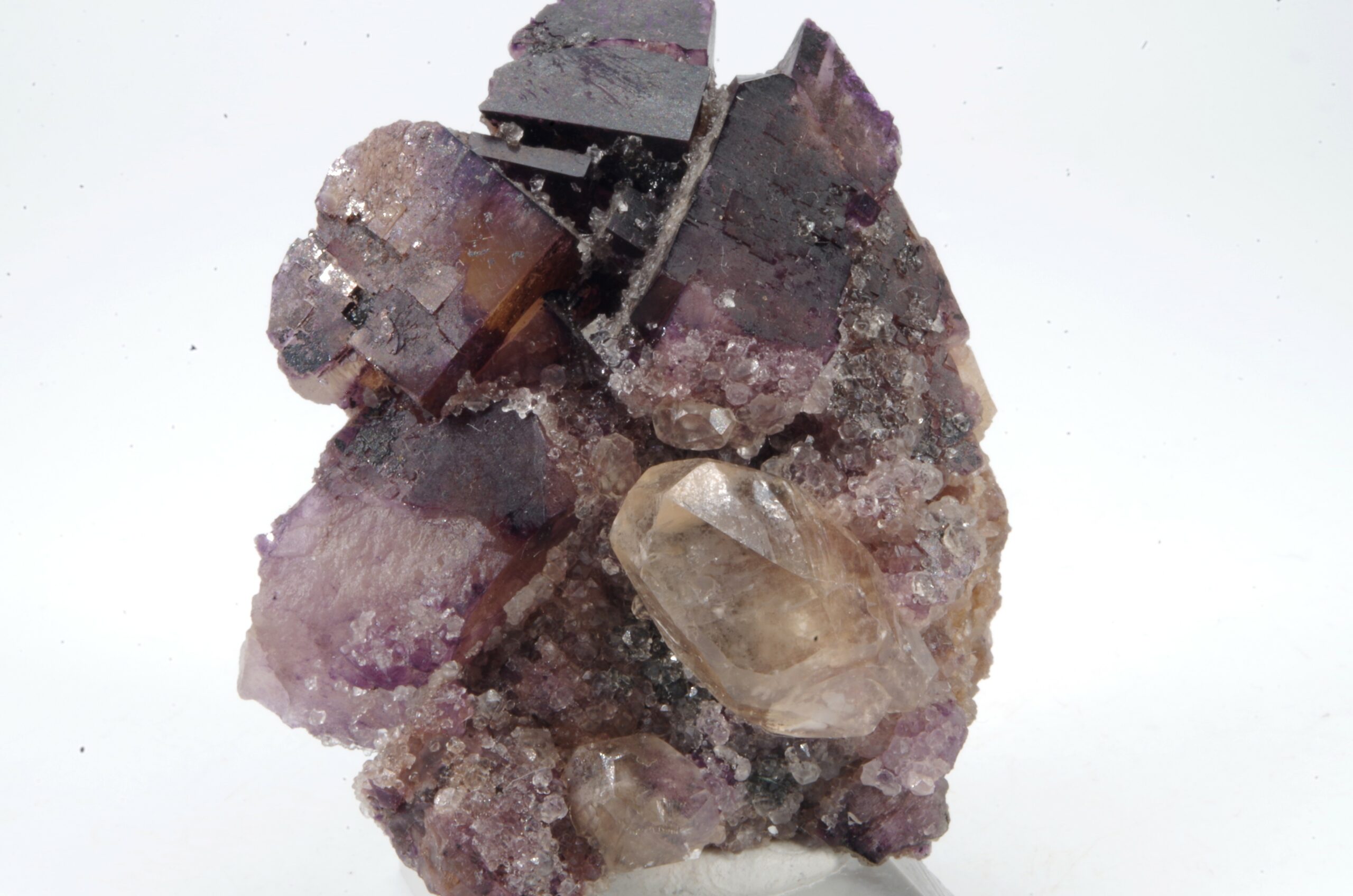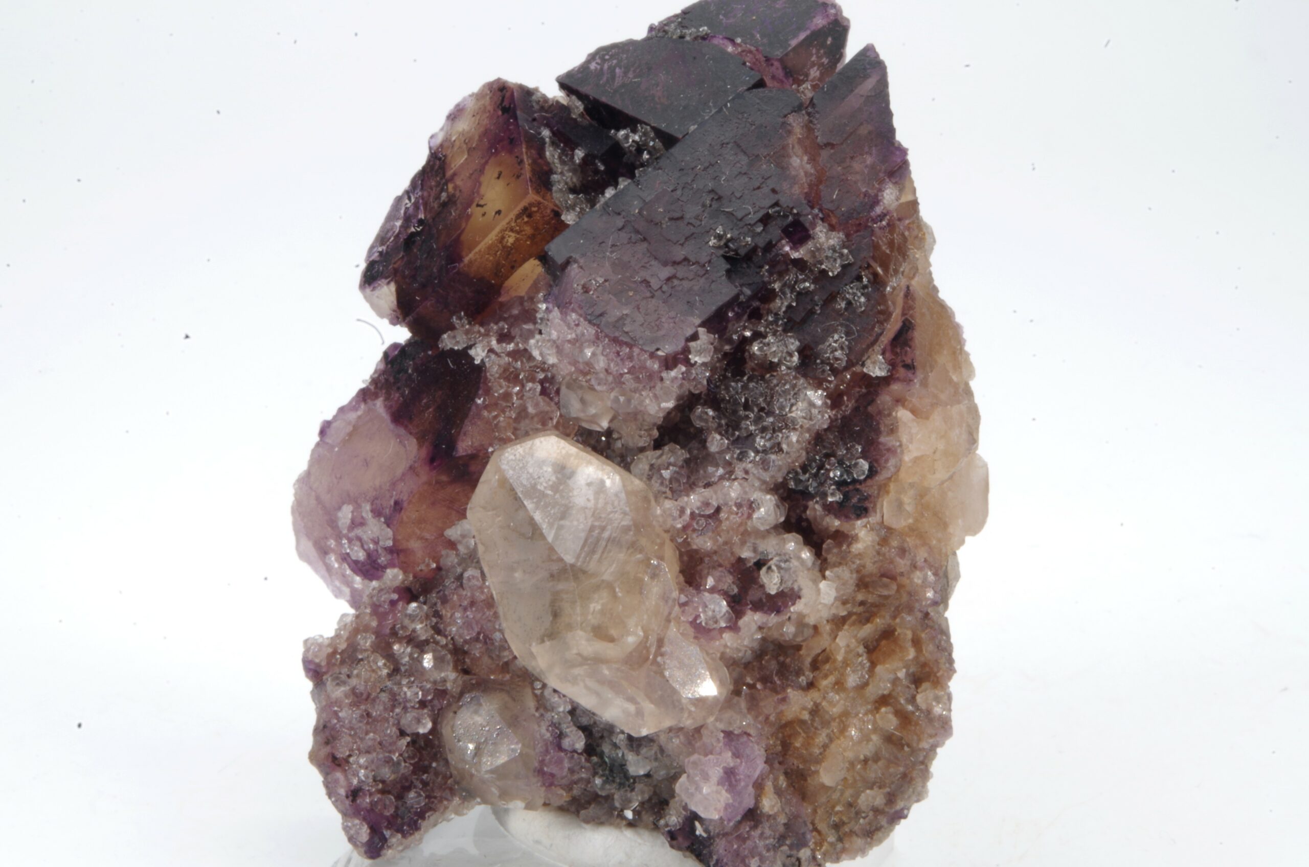 Bel assemblage de Fluorite bicolore complété d’un joli cristal de Calcite.
