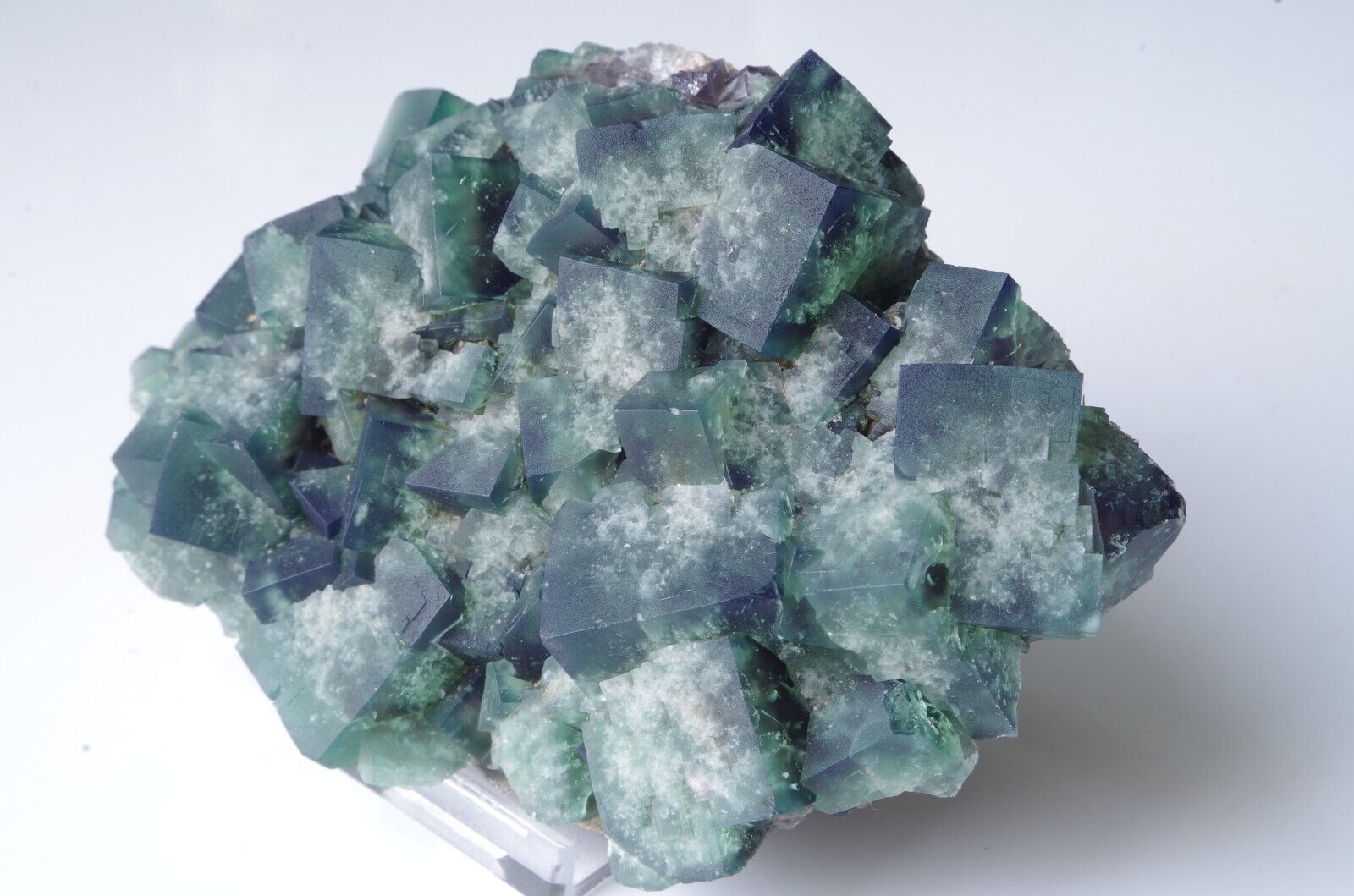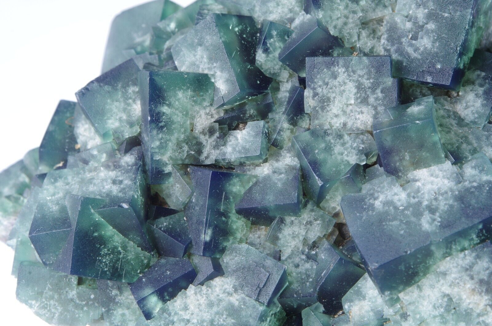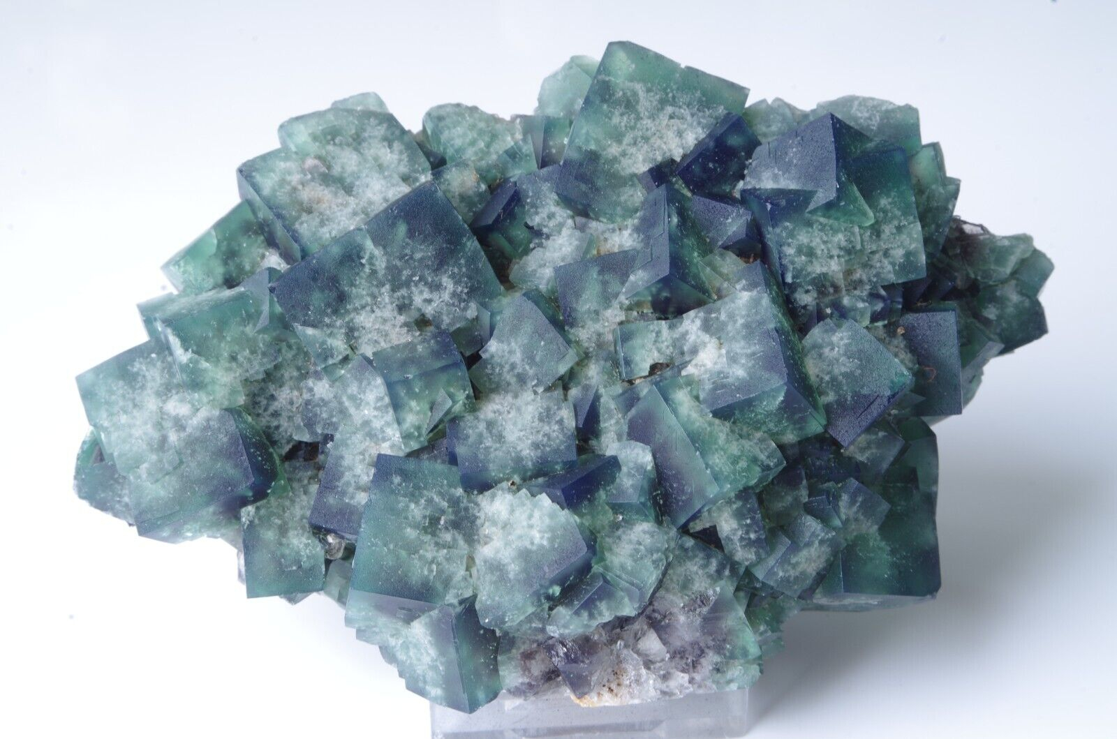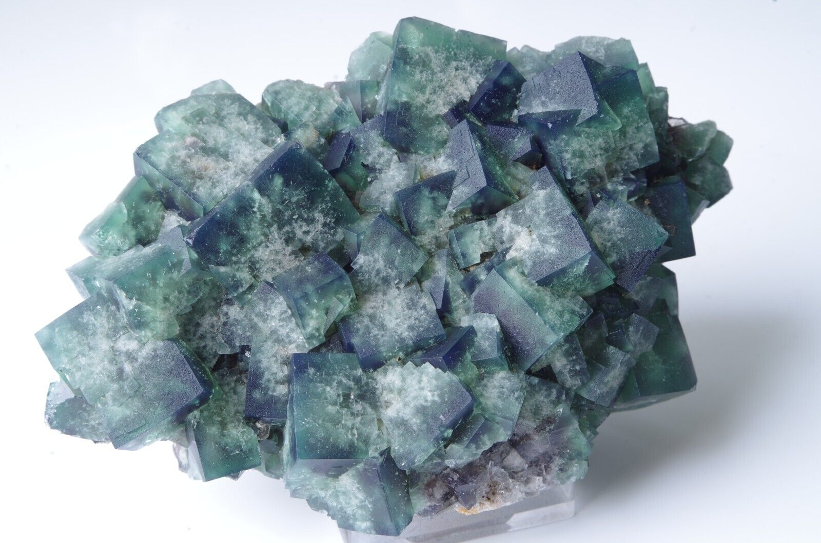 Les cristaux de fluorite vont du vert feuille profond gemme à un vert de mer plus bleuâtre avec des centres tachetés blanchâtre.