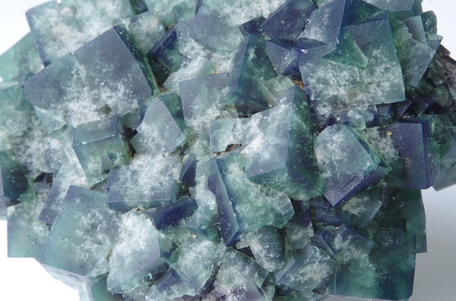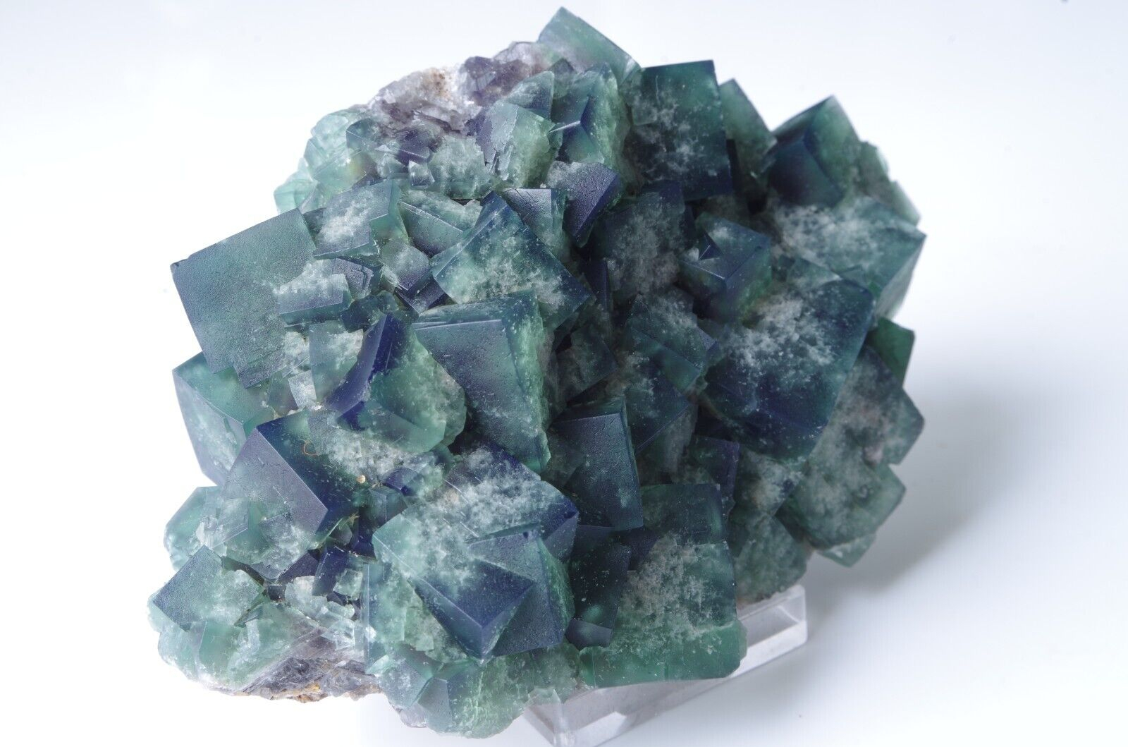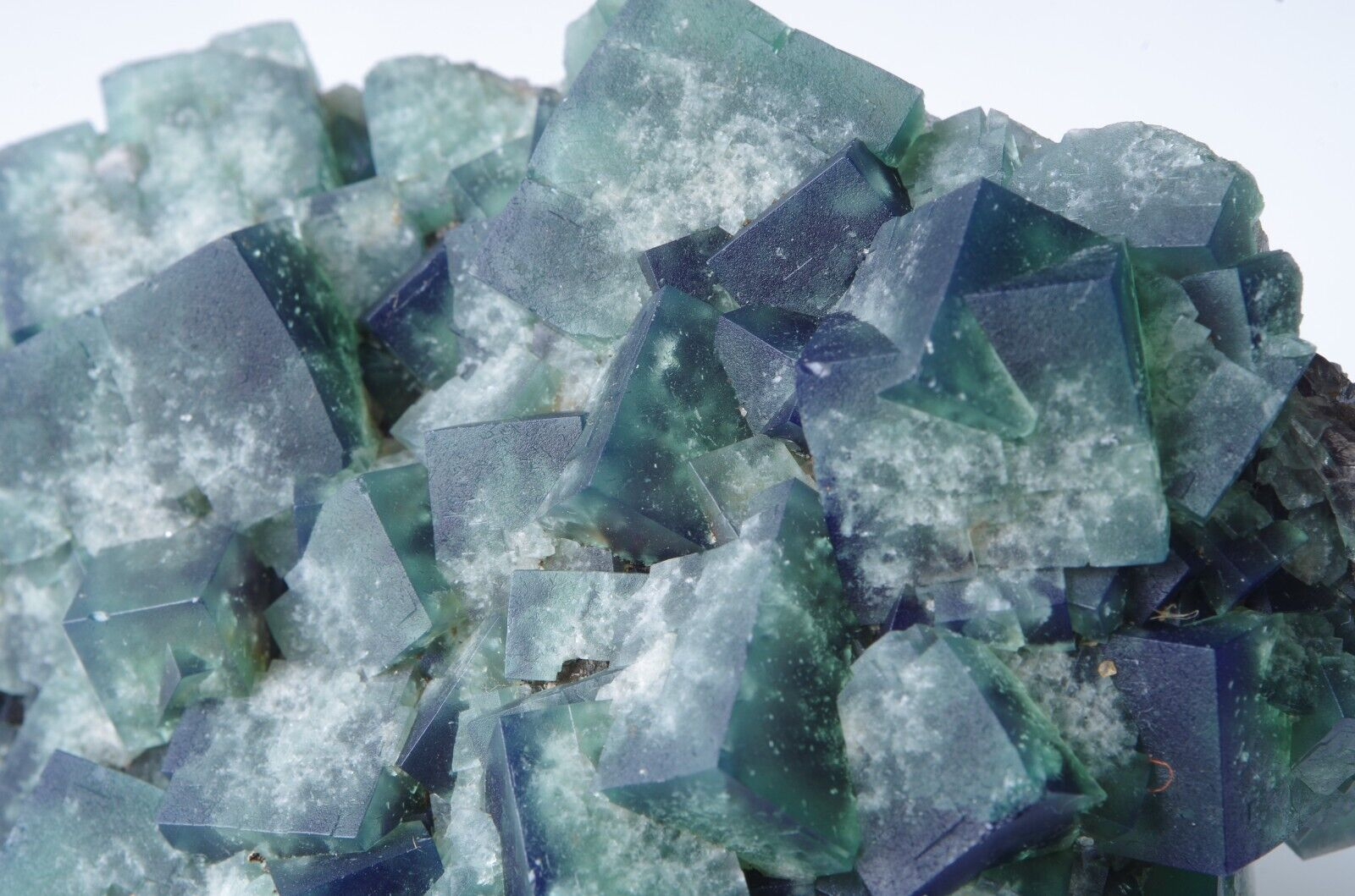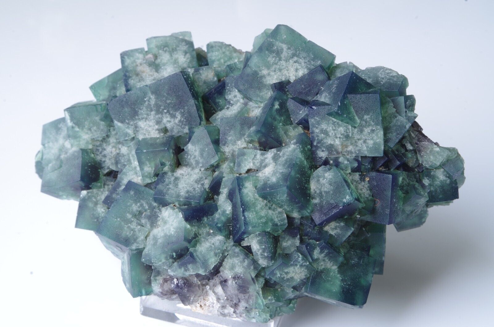 Les cristaux de fluorite vont du vert feuille profond gemme à un vert de mer plus bleuâtre avec des centres tachetés blanchâtre.