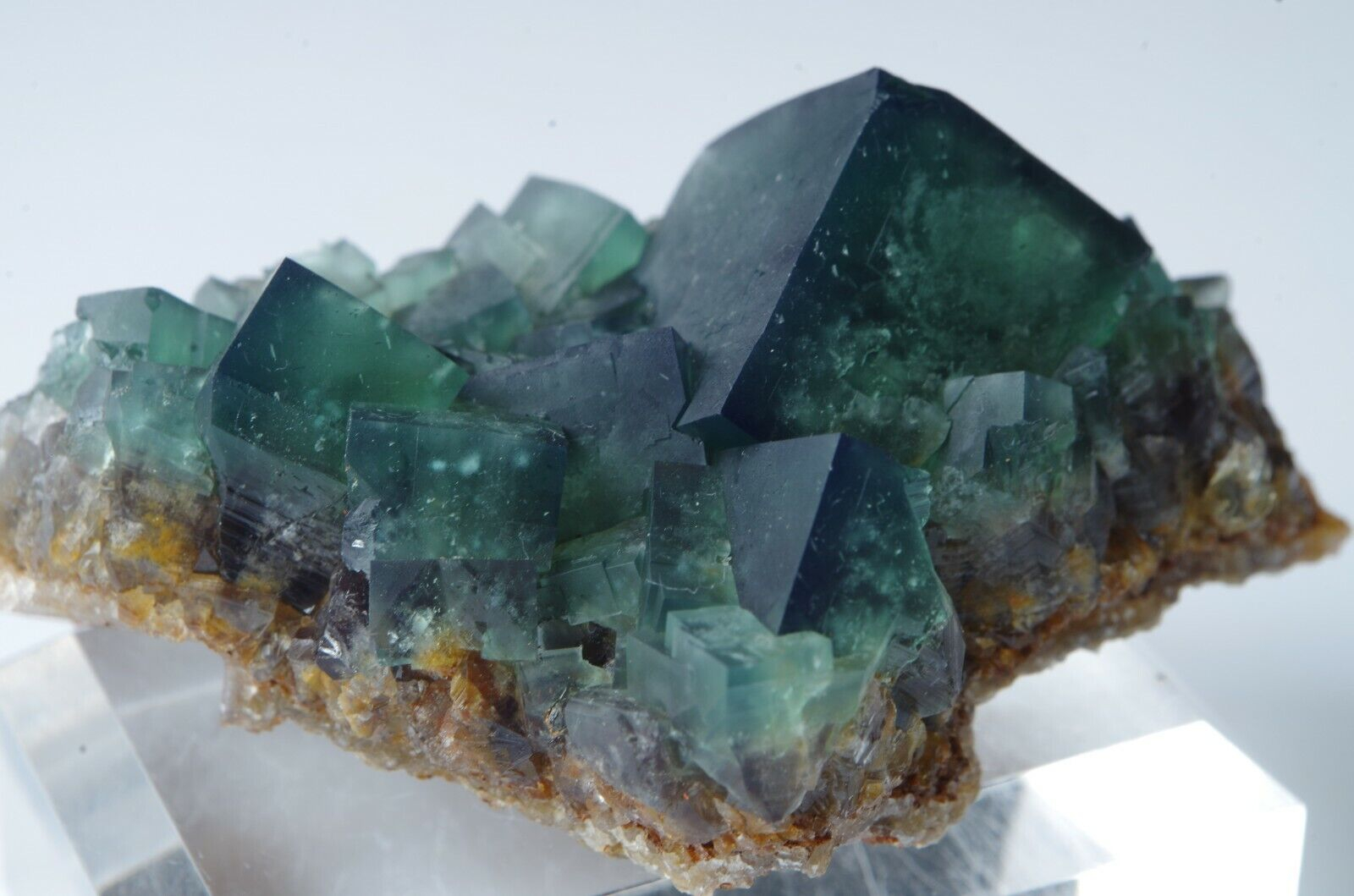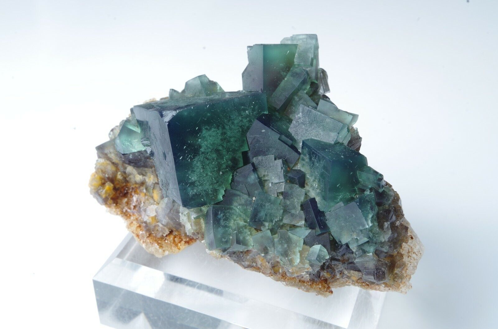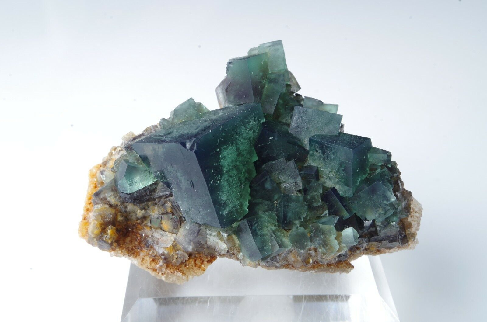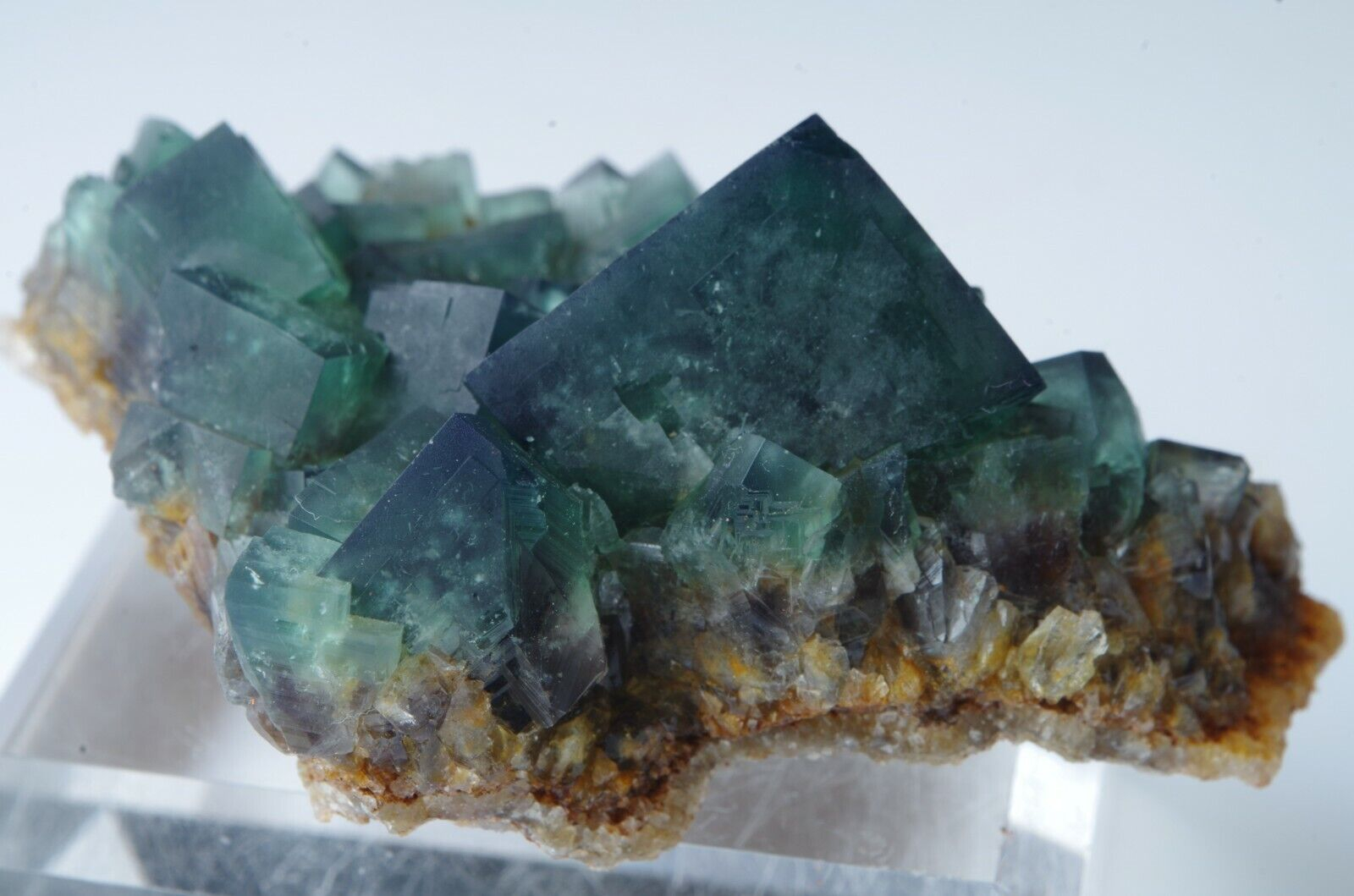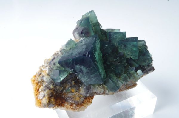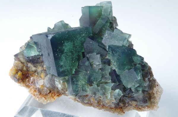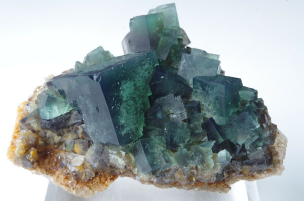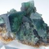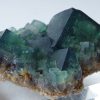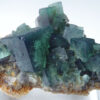 Les cristaux de fluorite vont du vert feuille profond gemme à un vert de mer plus bleuâtre avec des centres tachetés blanchâtre.