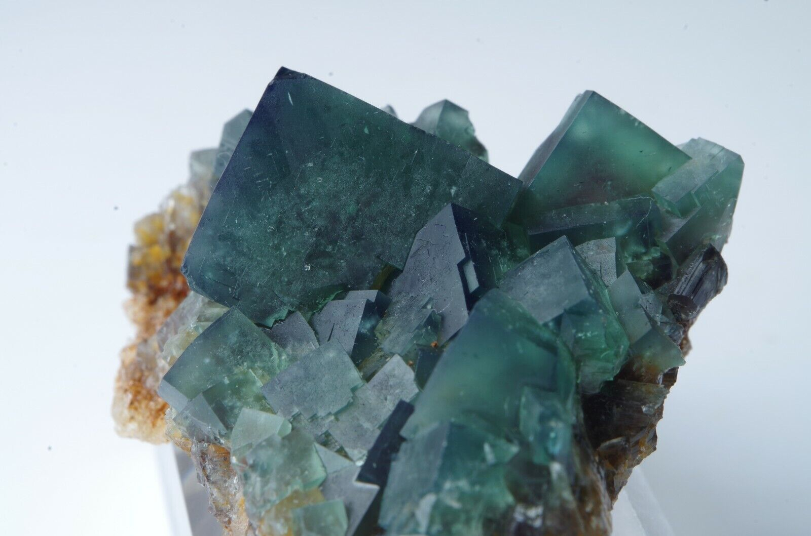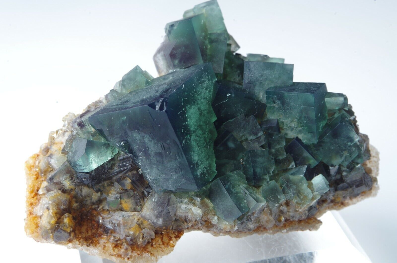 La poche est complexe et nécessite une extraction minutieuse. Près du sommet de la poche, la fluorite se produit contre les microcristaux de quartz contrastés blancs et colorés de fer.