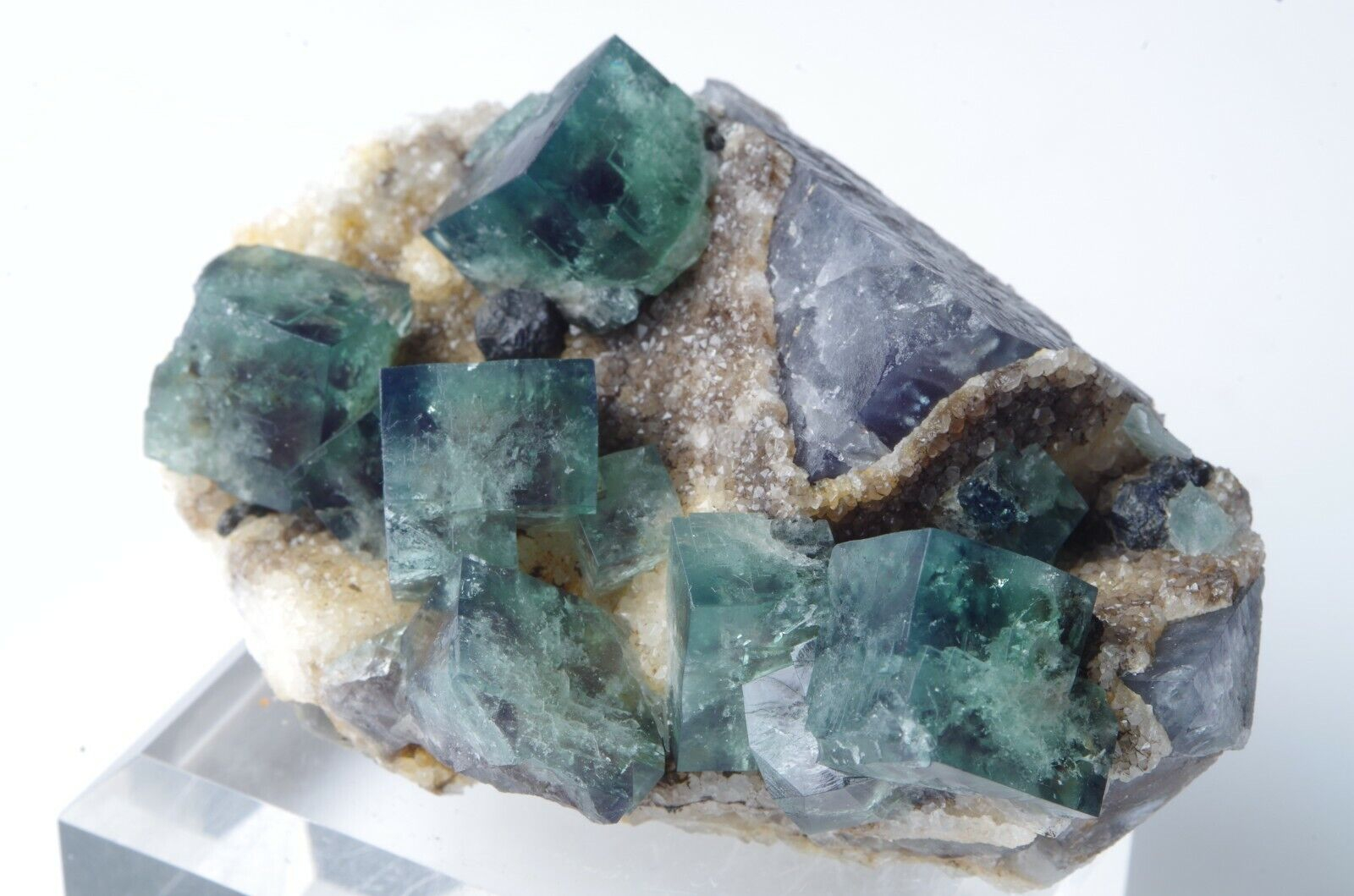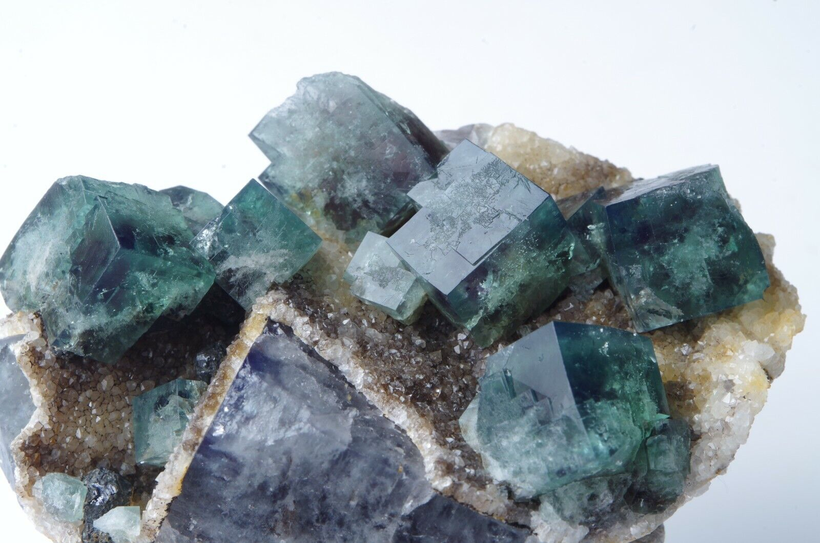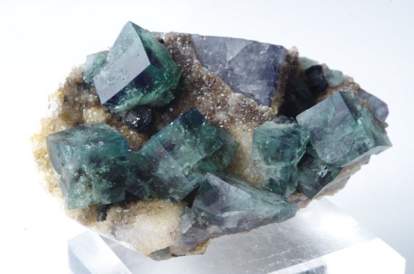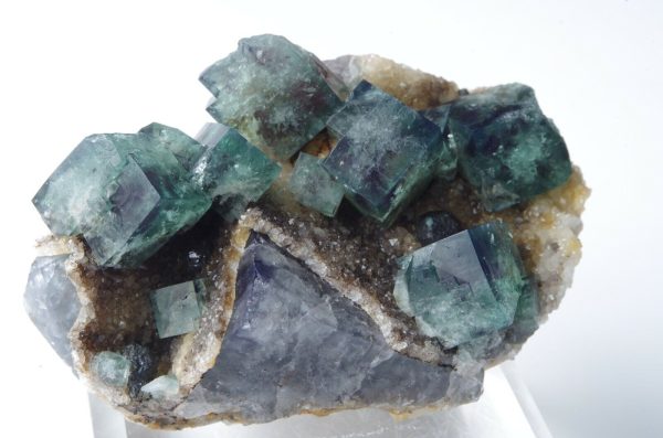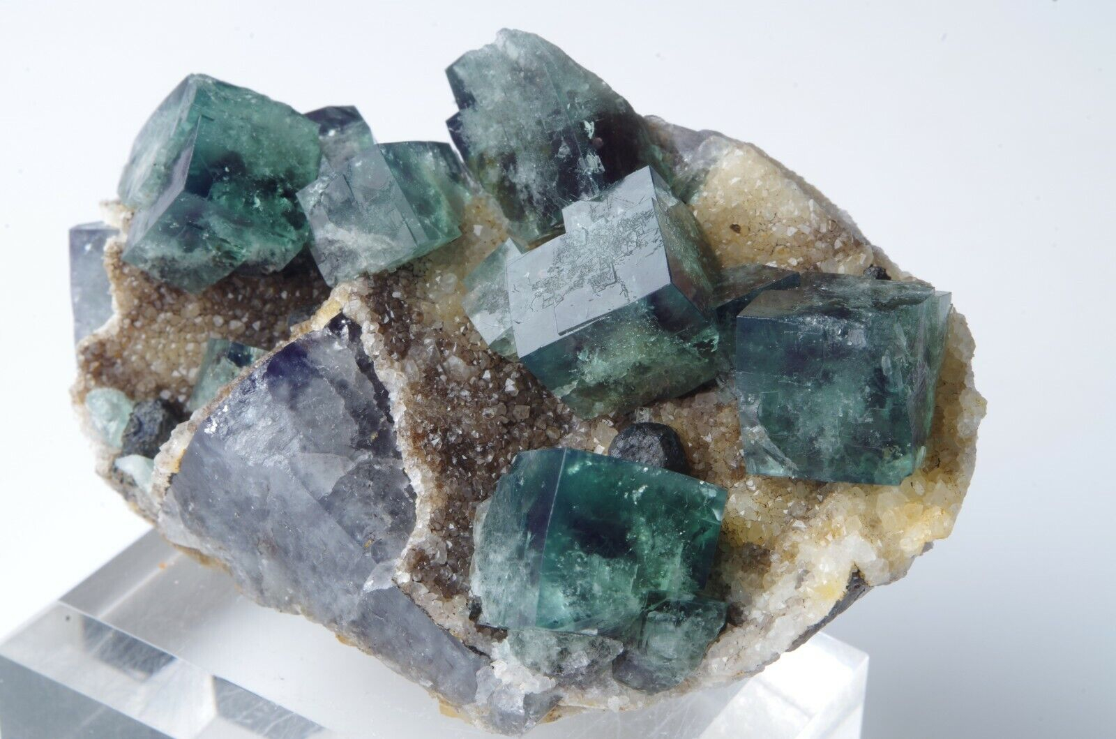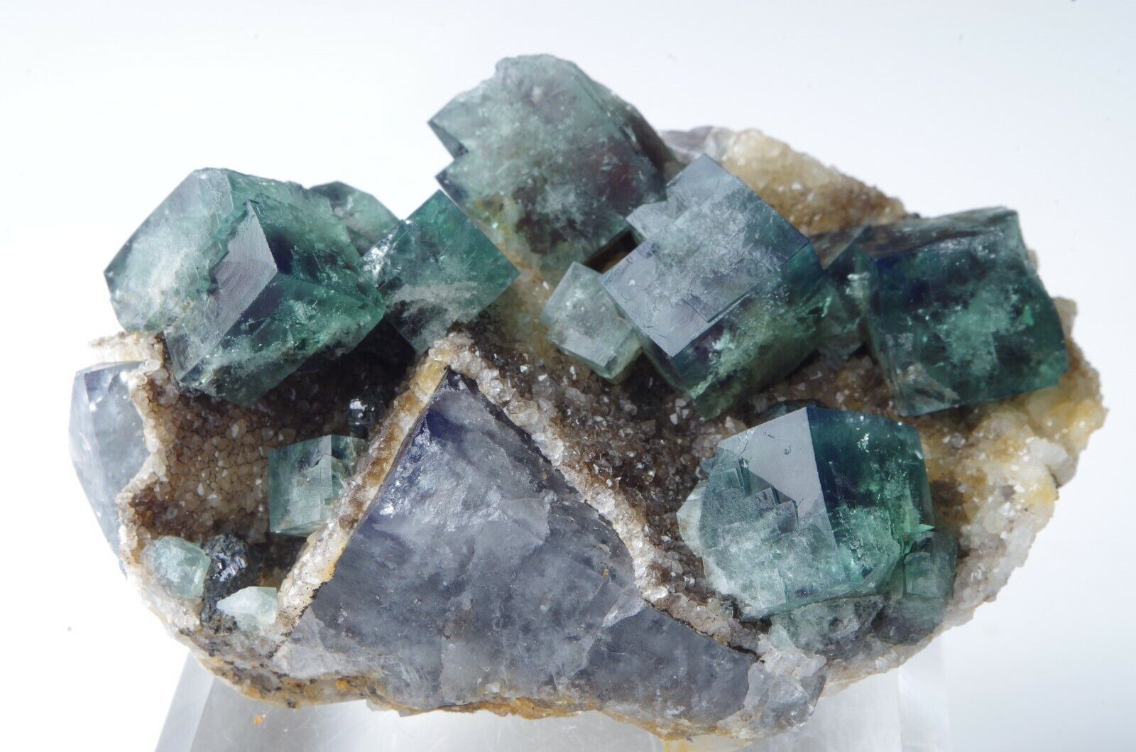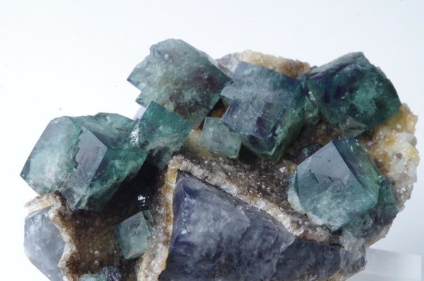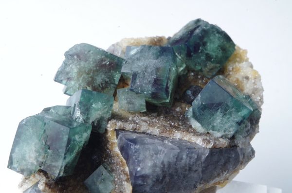Magnifique pièce composée de cubes verts translucides et brillants disposés sur une première génération de fluorite encroutée de quartz oxydé.