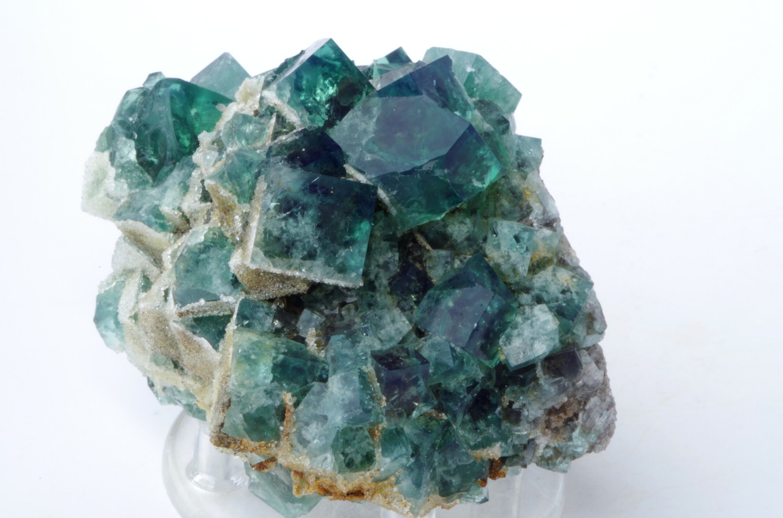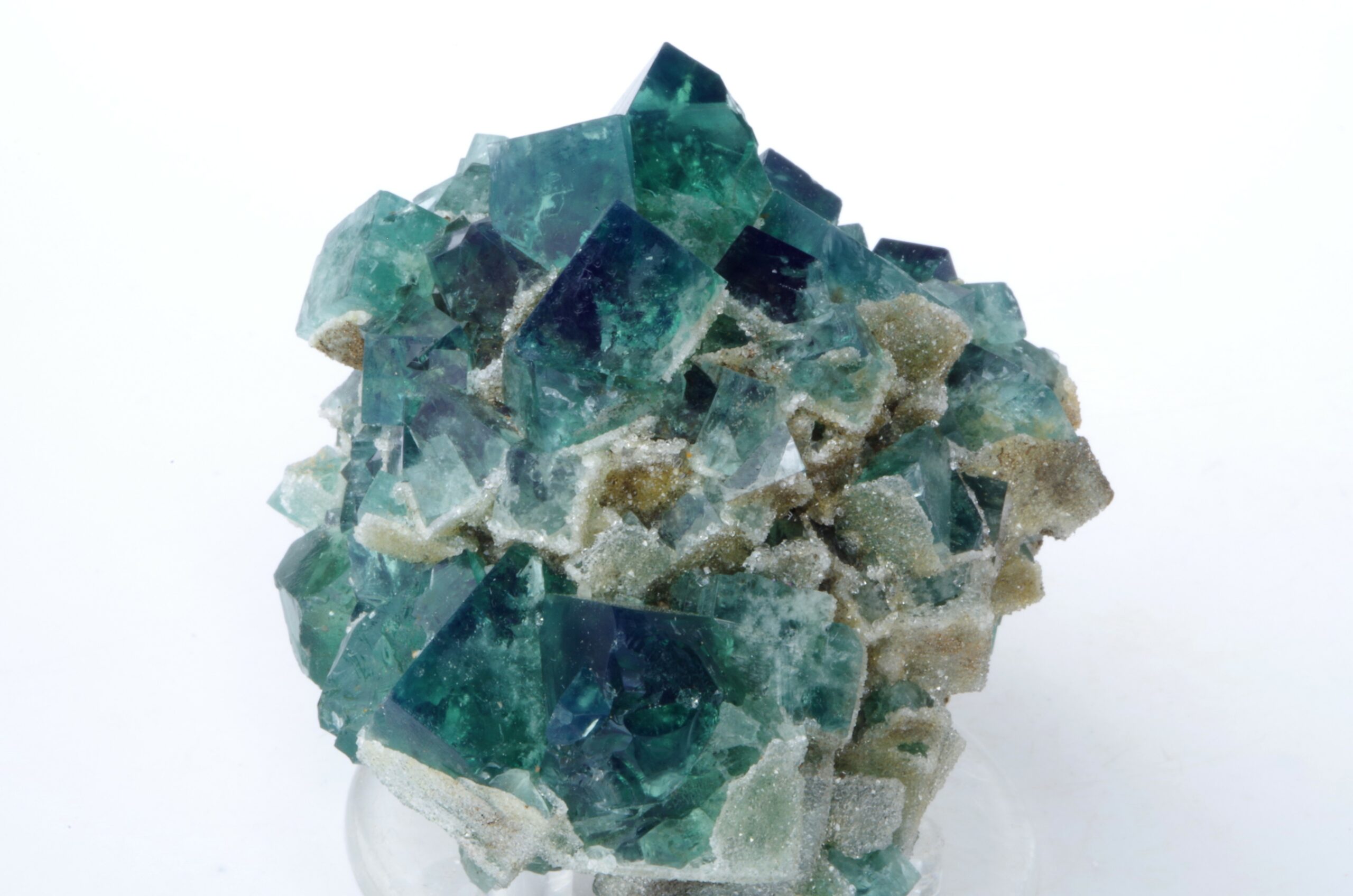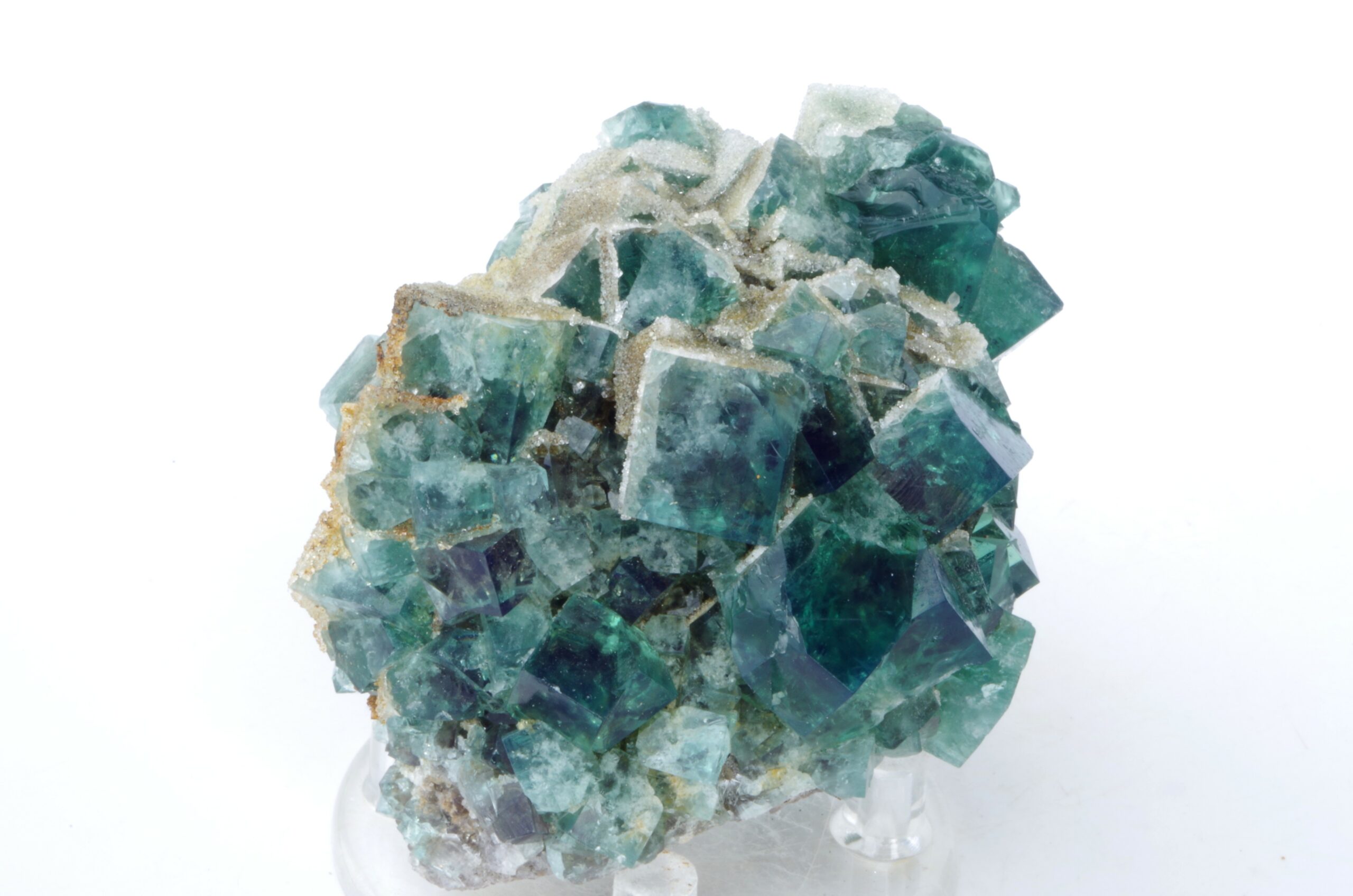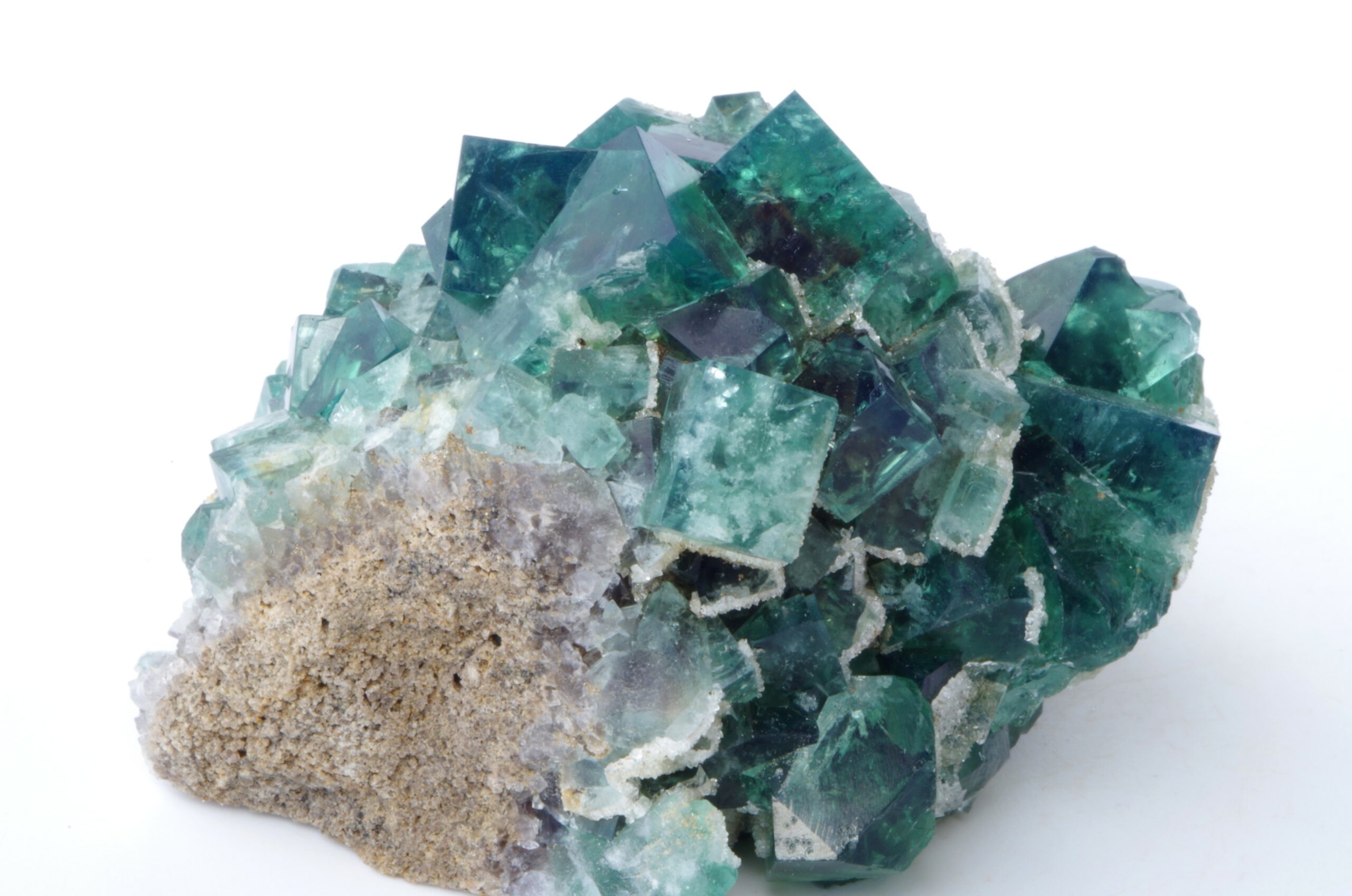 Cristaux maclés cubiques vert émeraude brillants transparents et gemmes légèrement encroutés de Quartz blanc laiteux scintillant.