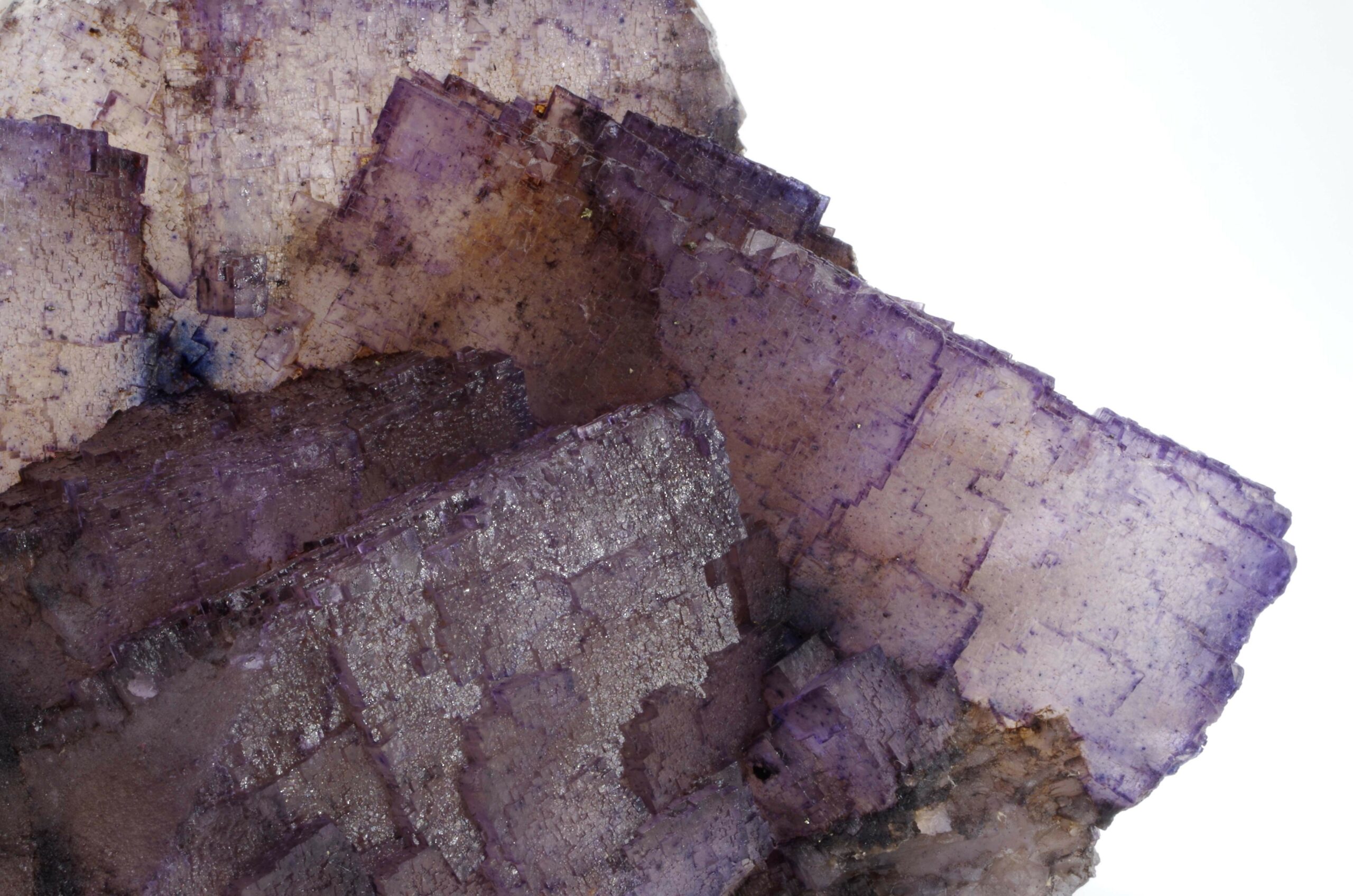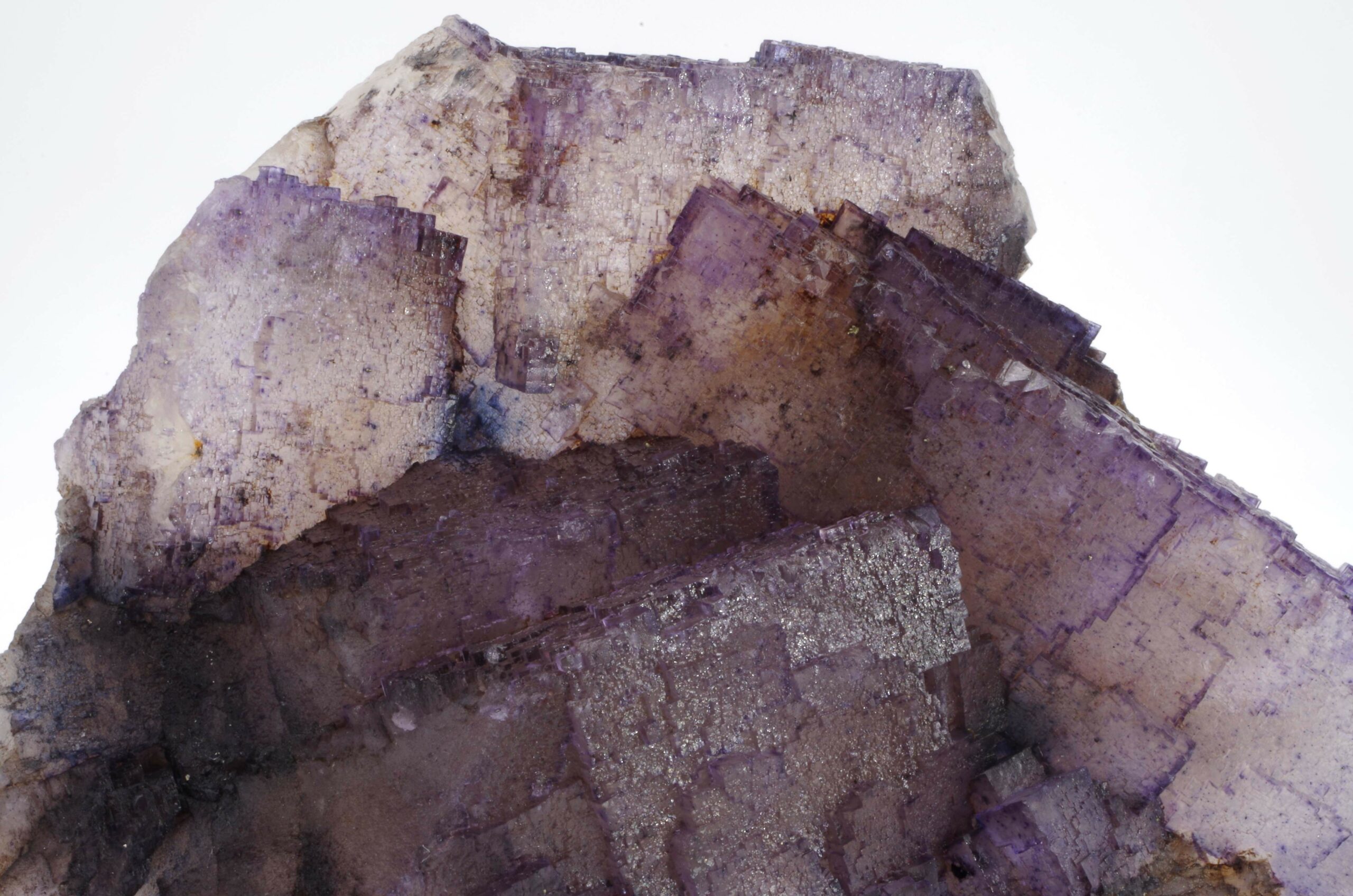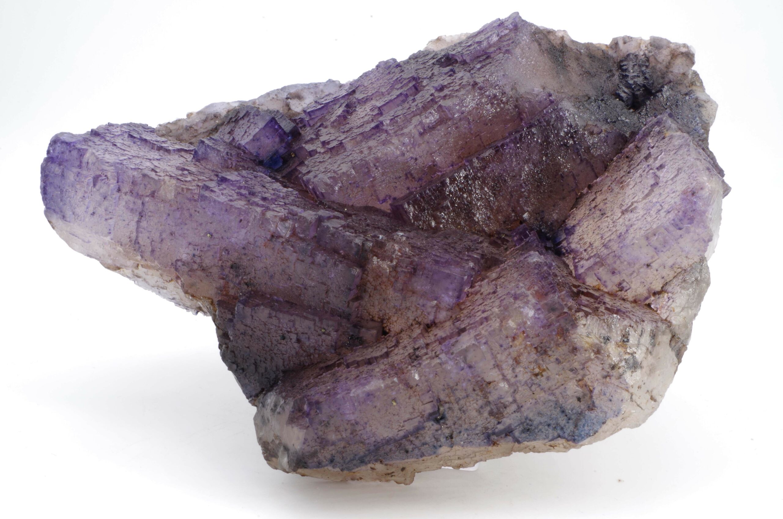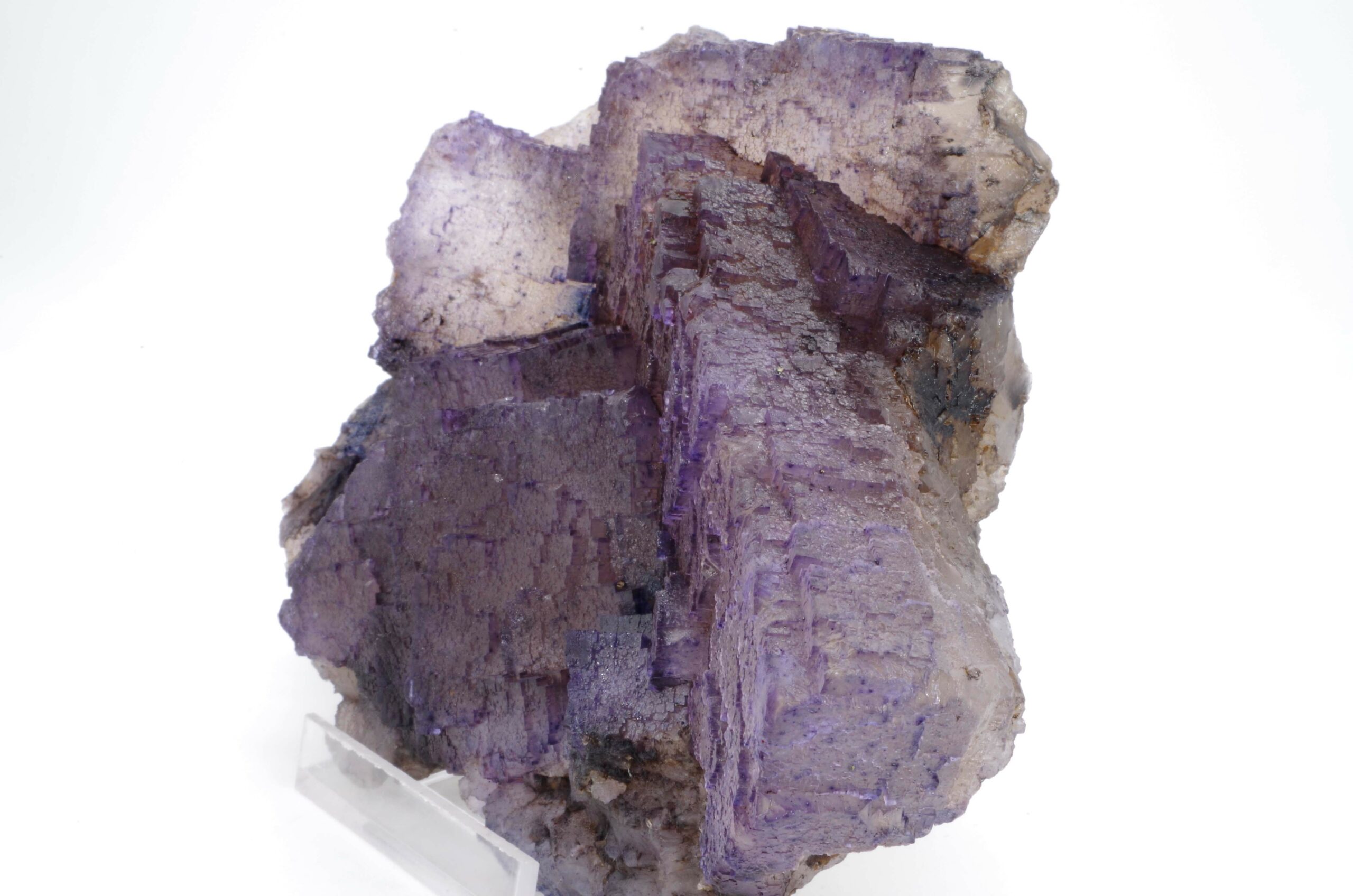 Grand spécimen de Fluorite à cœur translucide et bords violets présentant de jolis reliefs de croissance.