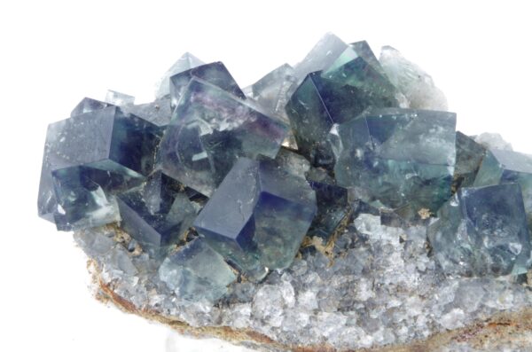 Excellent spécimen de fluorite maclée extraite en 2020 d’un vert transparent. Les cristaux de fluorite interpénétrés recouvrent une matrice calcaire altérée riche en fer contenant de la galène