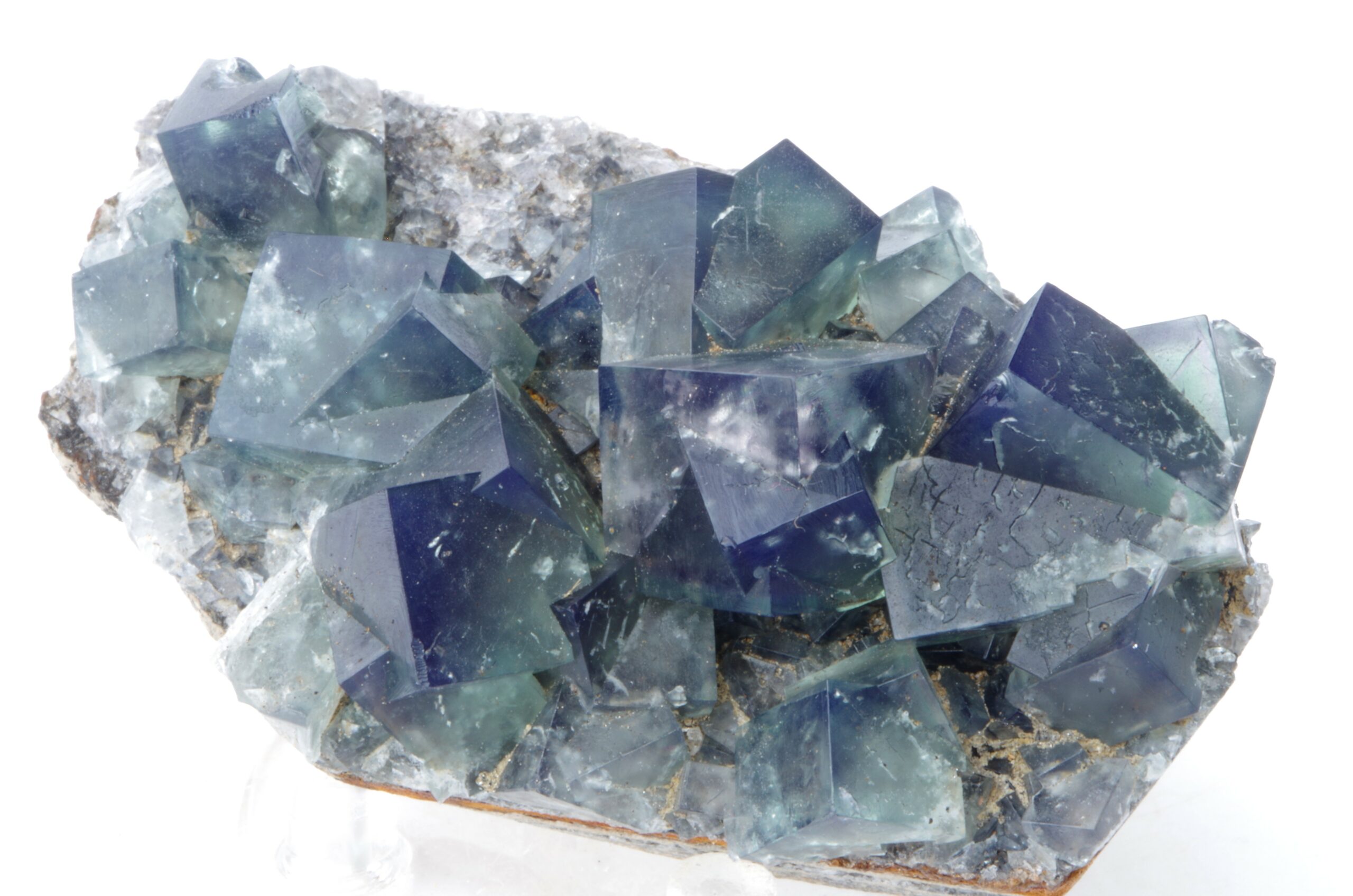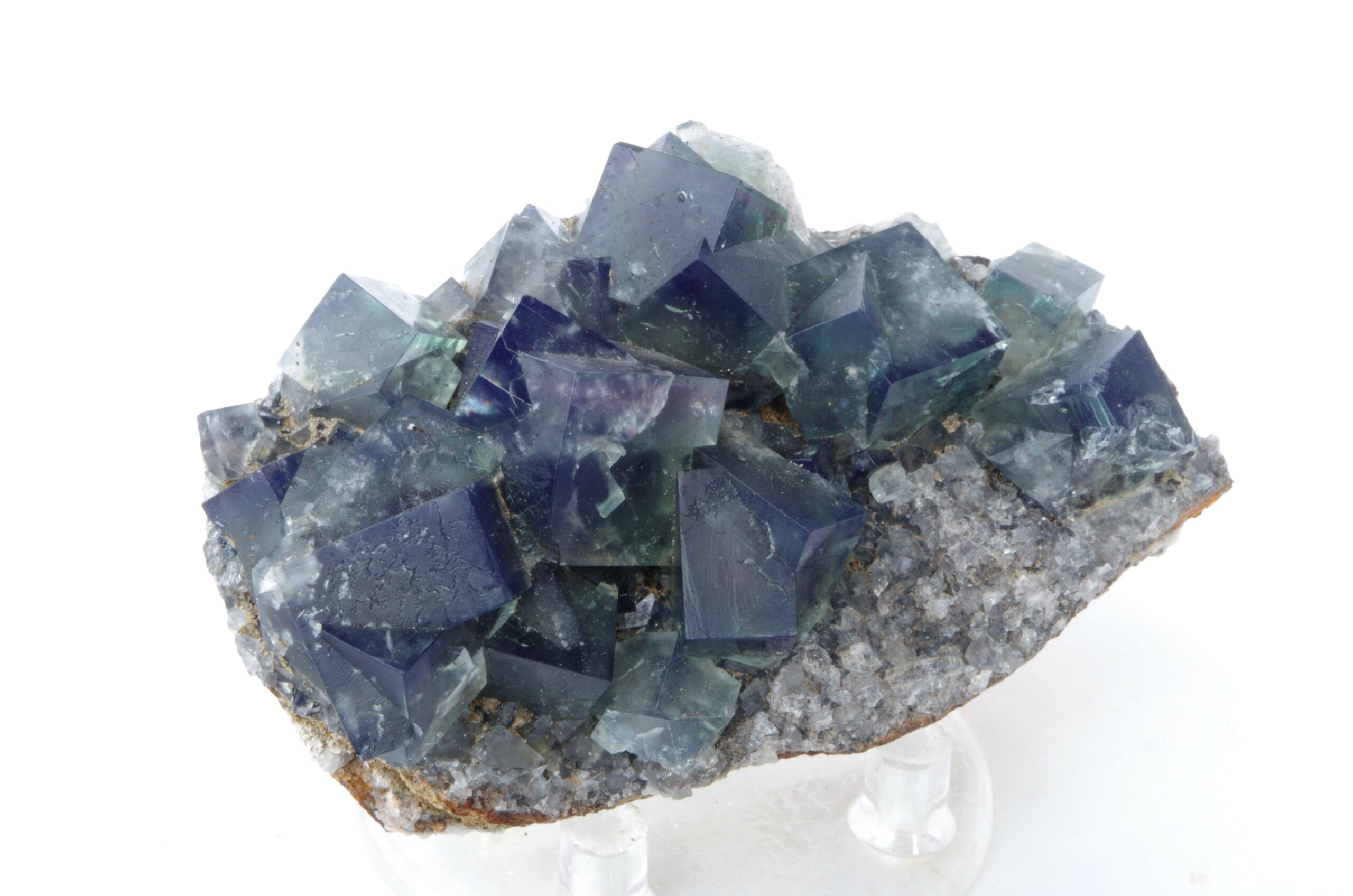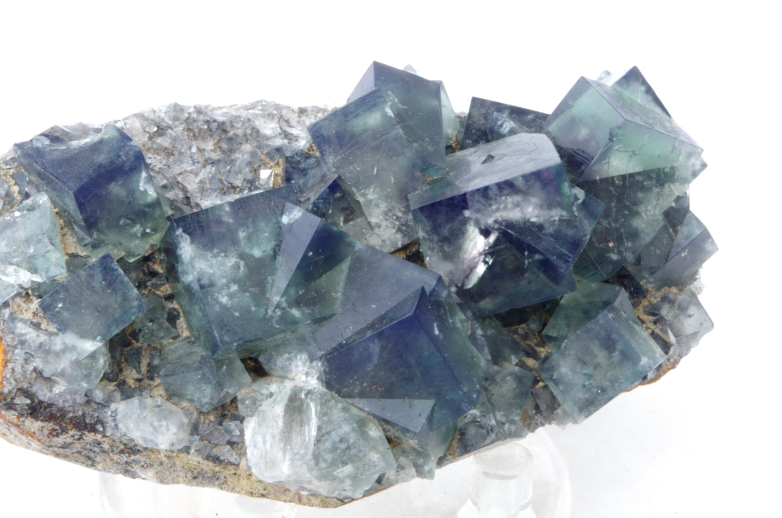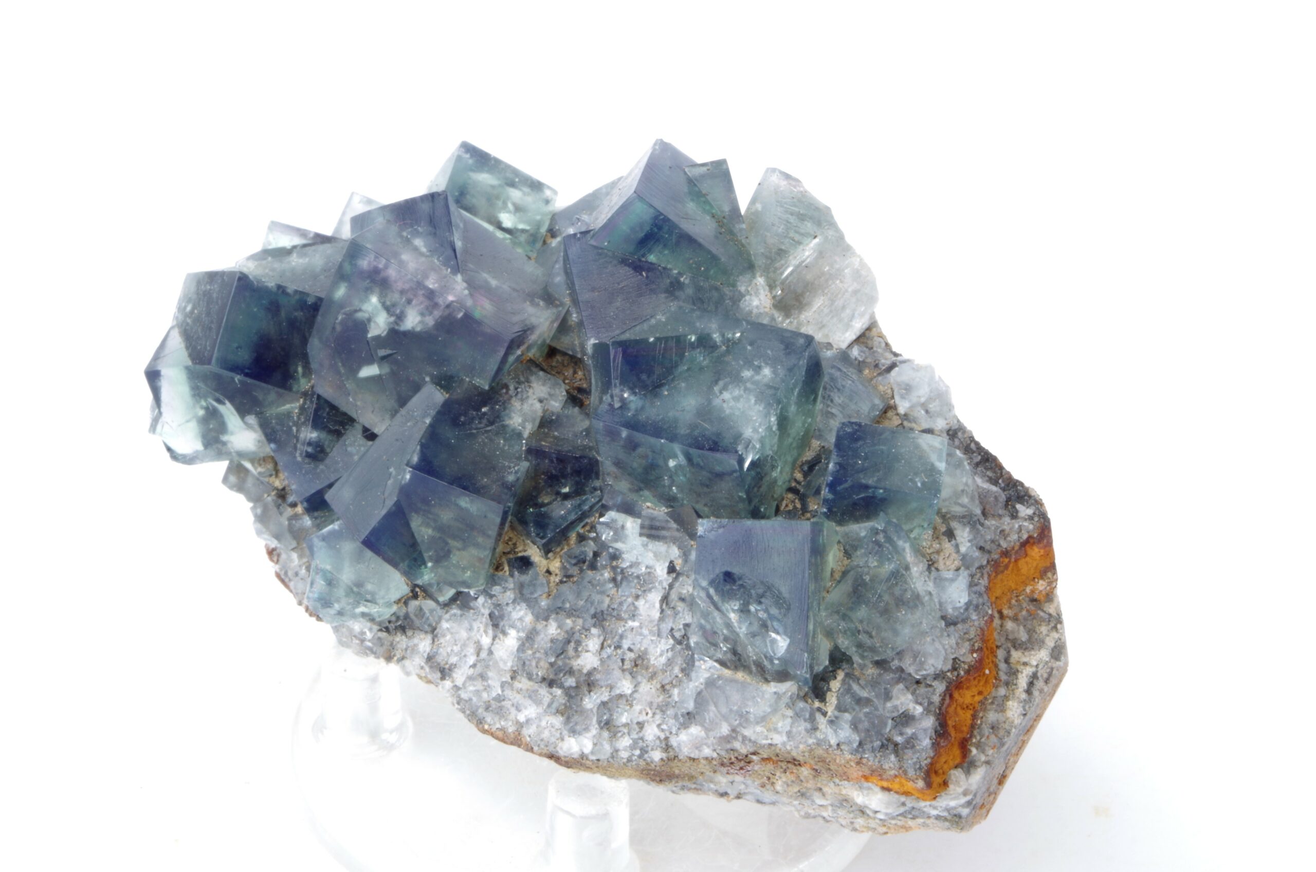 Excellent spécimen de fluorite maclée extraite en 2020 d’un vert transparent. Les cristaux de fluorite interpénétrés recouvrent une matrice calcaire altérée riche en fer contenant de la galène