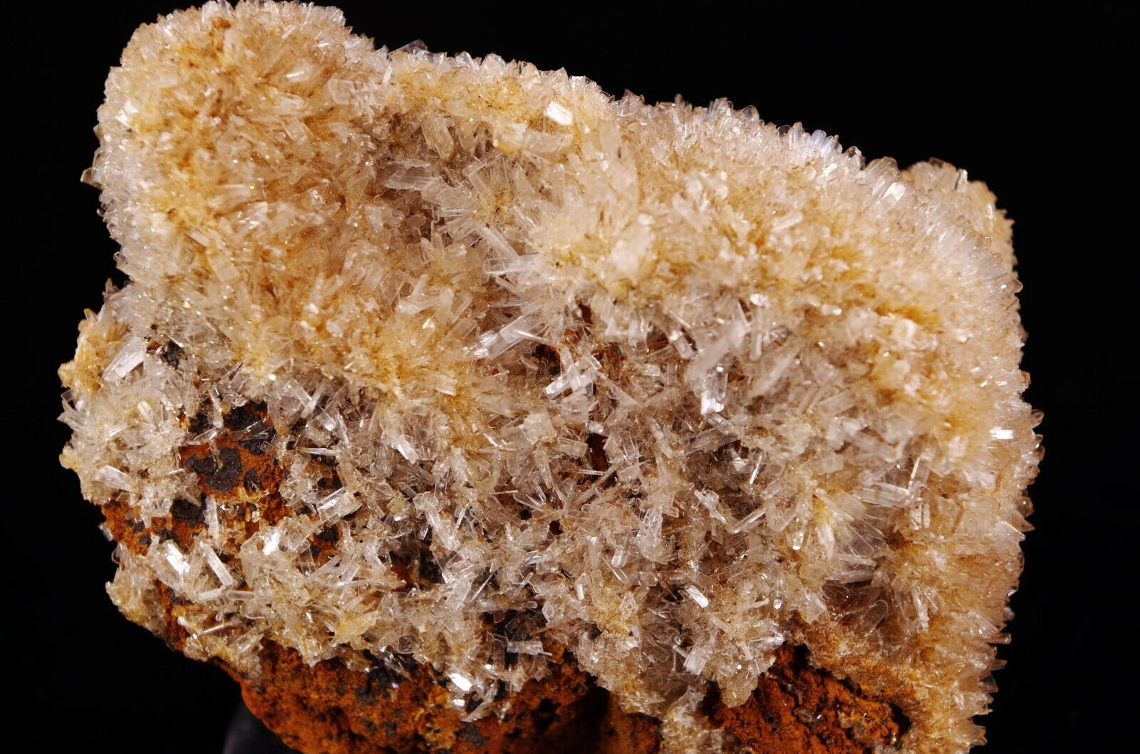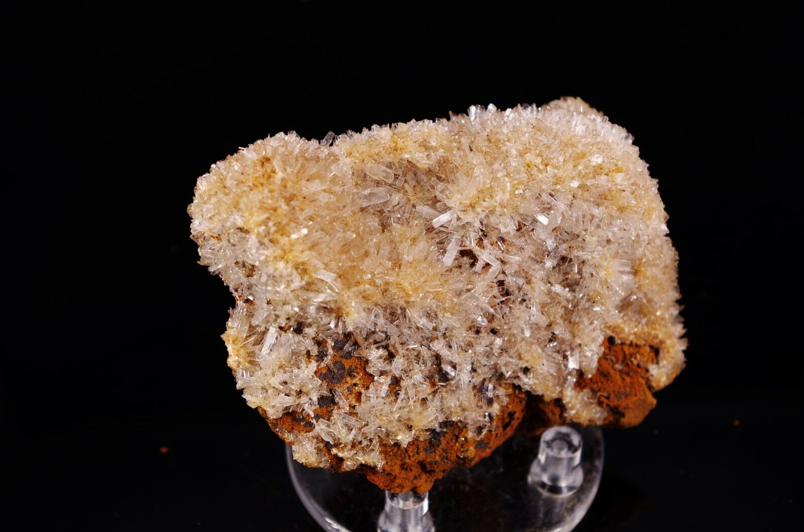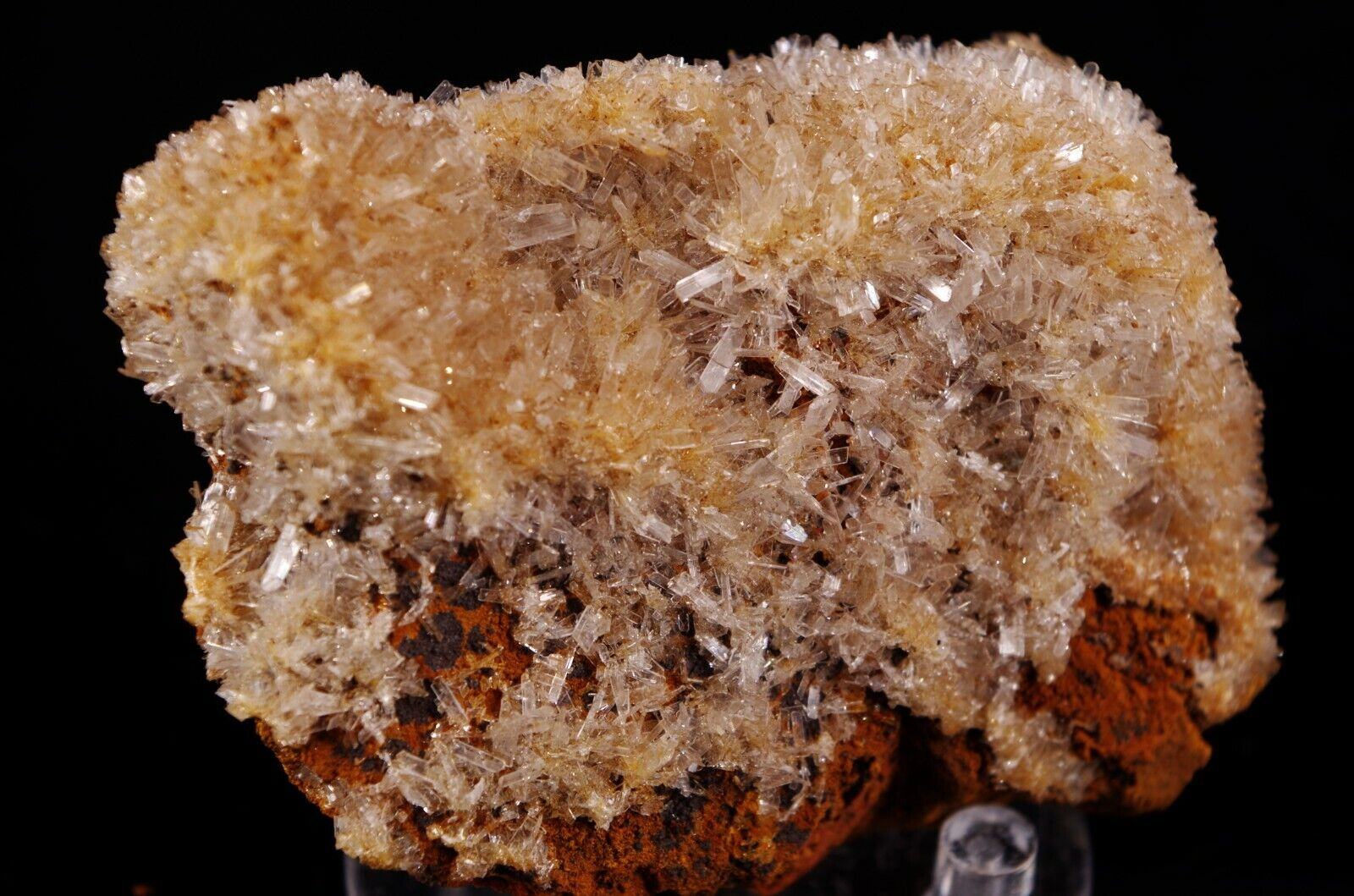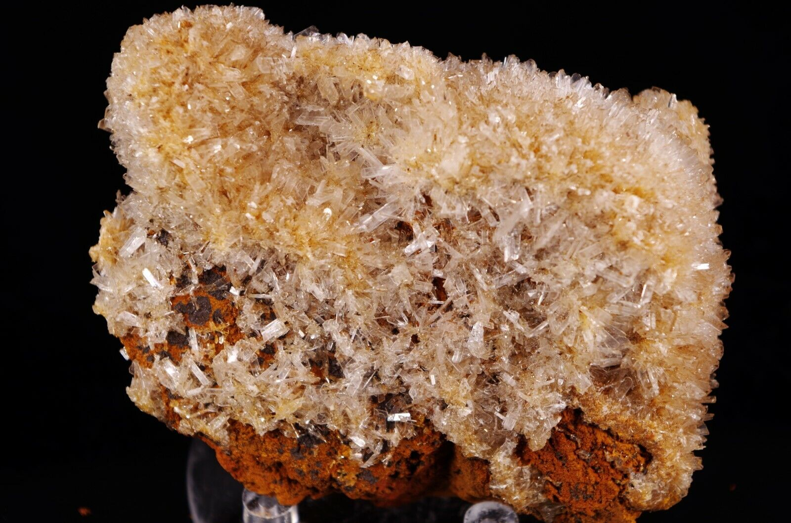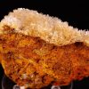 Cristallisation hérissée en fine lames translucides/ blanches d’hémimorphite sur matrice en limonite.
