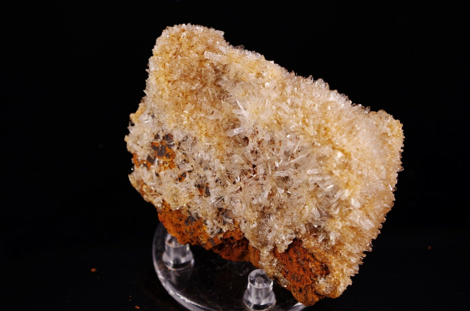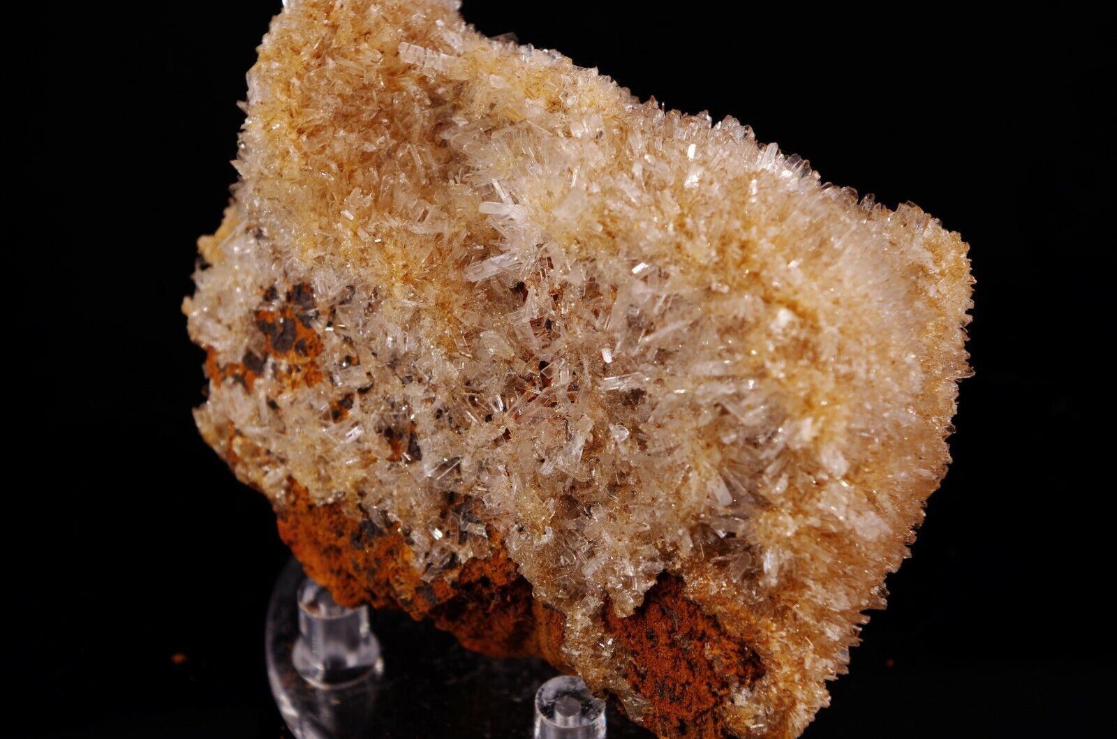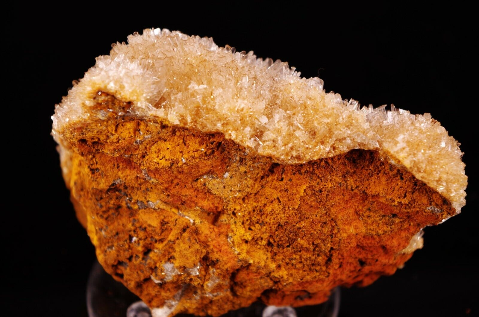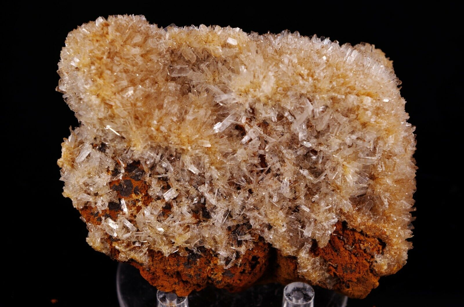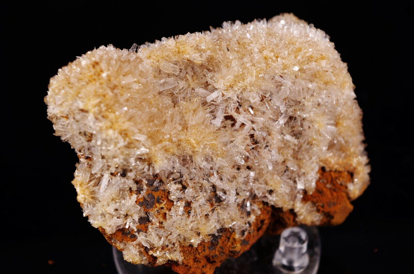 Cristallisation hérissée en fine lames translucides/ blanches d’hémimorphite sur matrice en limonite.