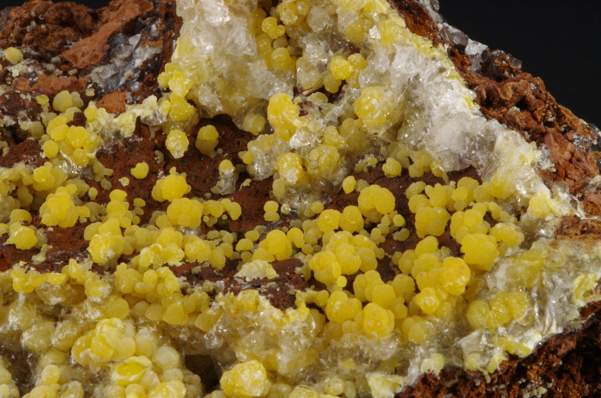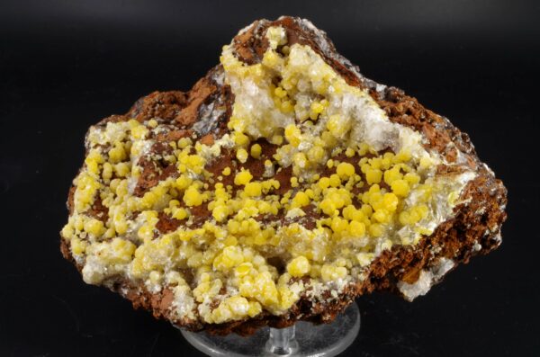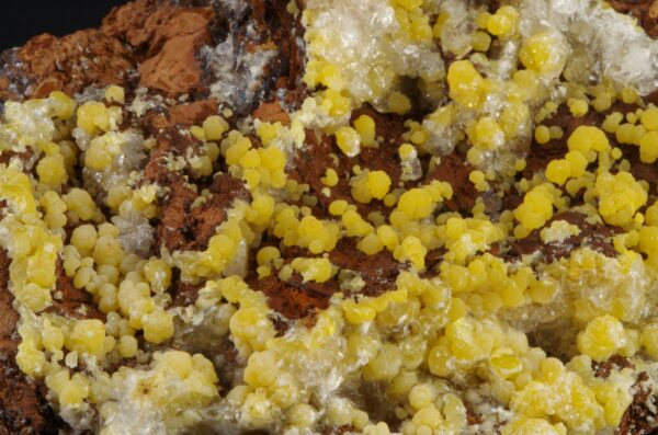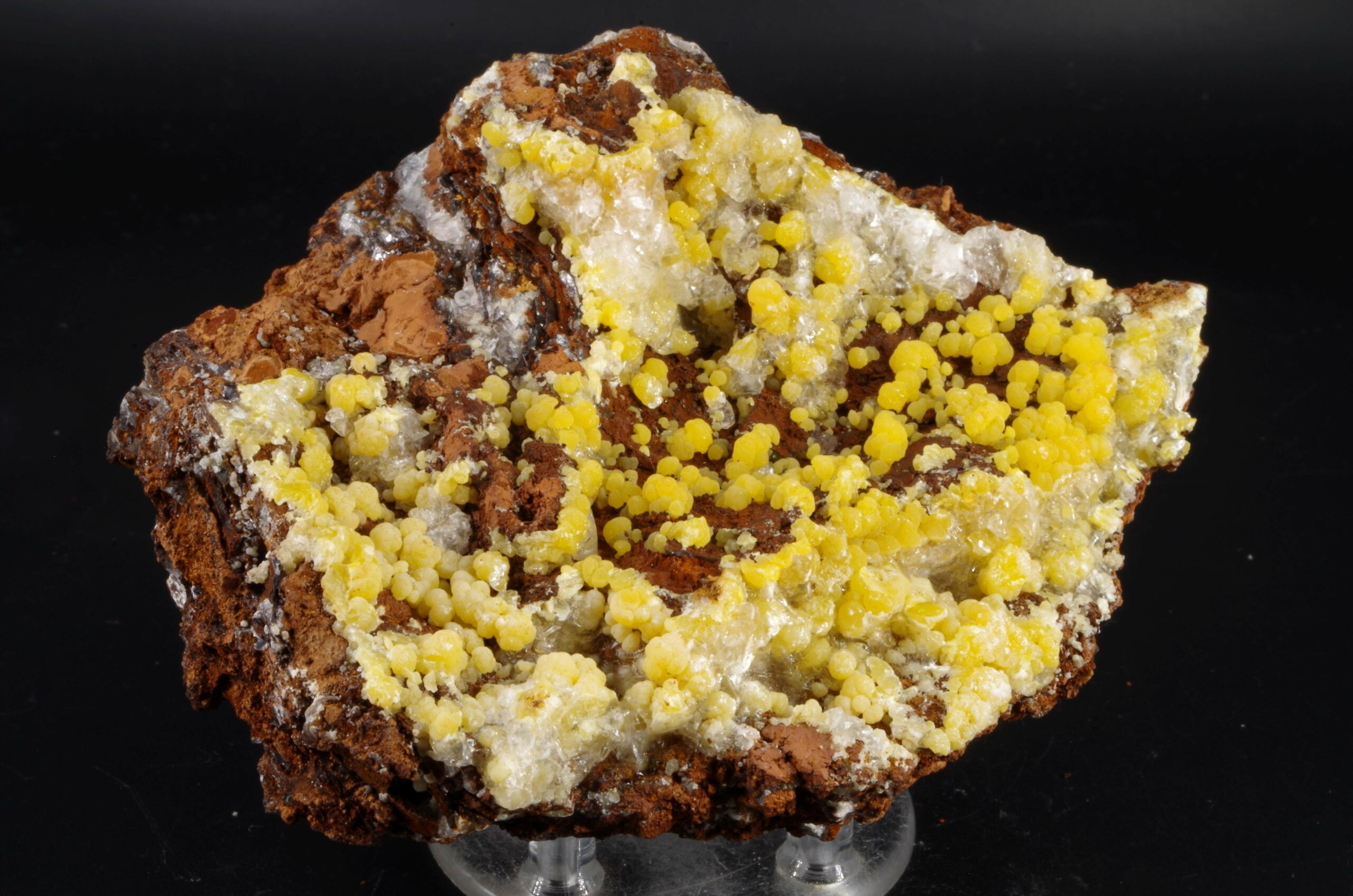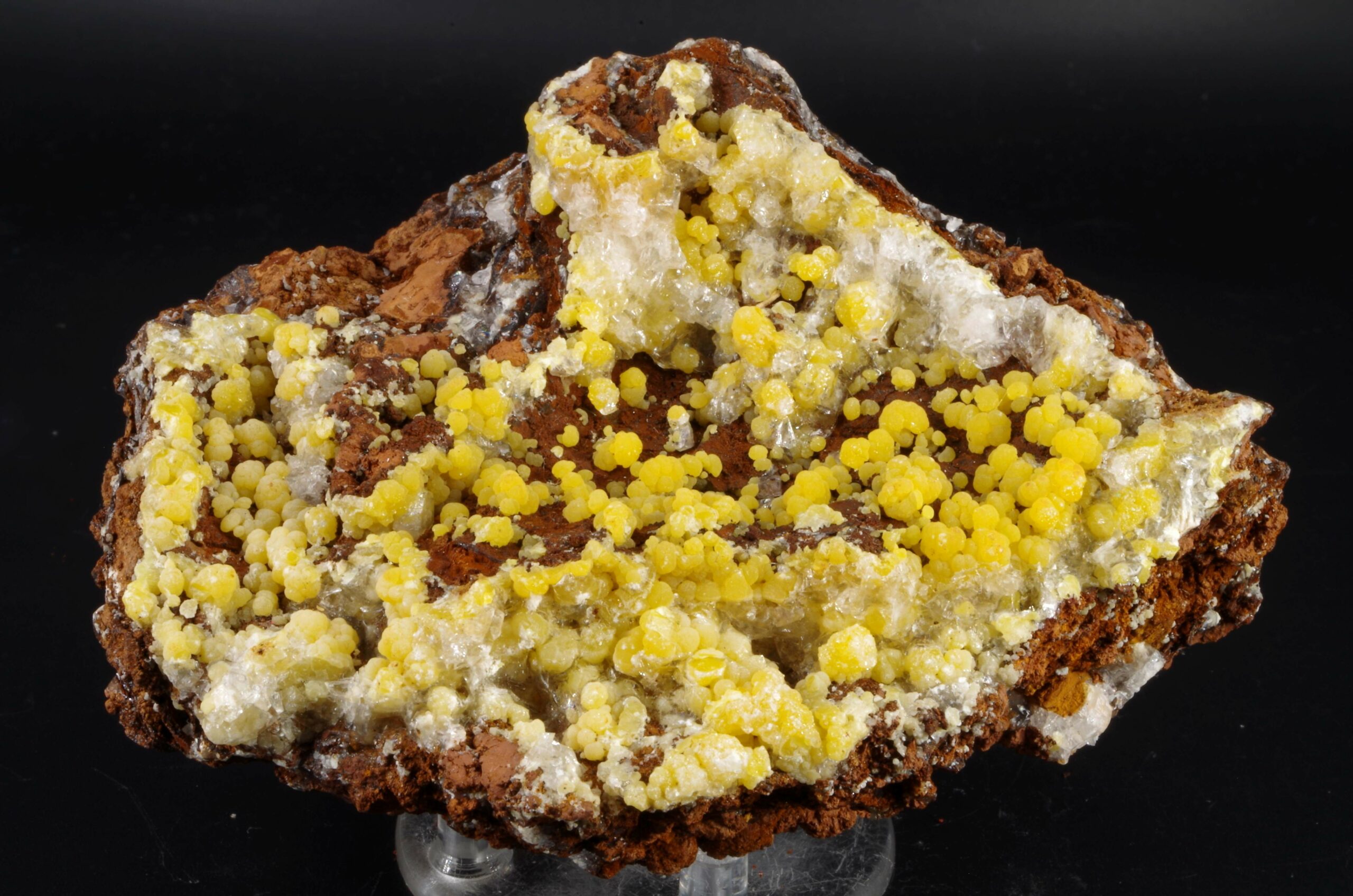 Excellent spécimen de Mimétite globulaire jaune citron disposée sur une matrice en limonite et complété par fine cristallisation d’Hémimorphite en périphérie.