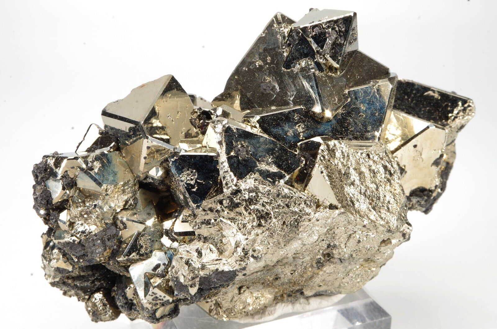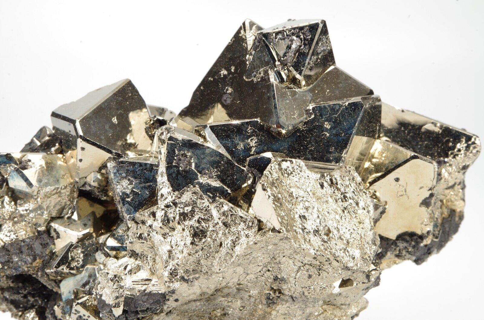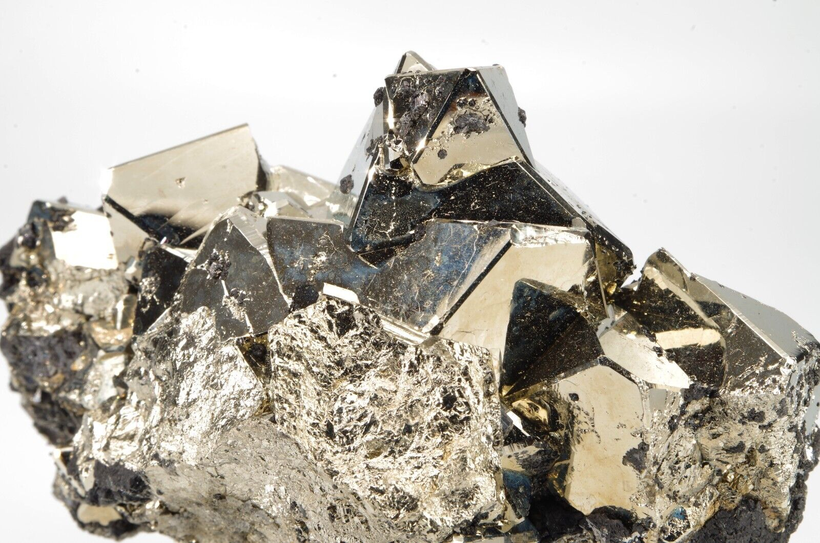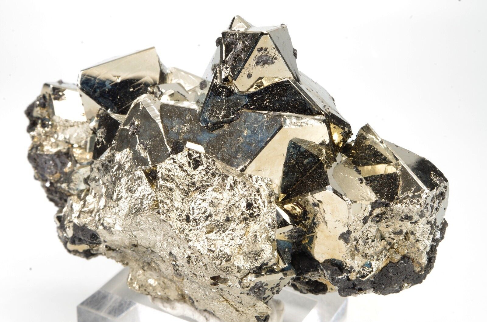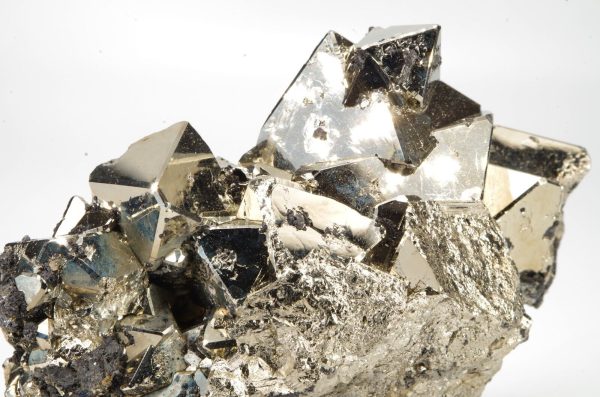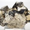 Belle pyrite octaédrique aux arrêtes chanfreinées associée à quelques formations de Sphalérite.