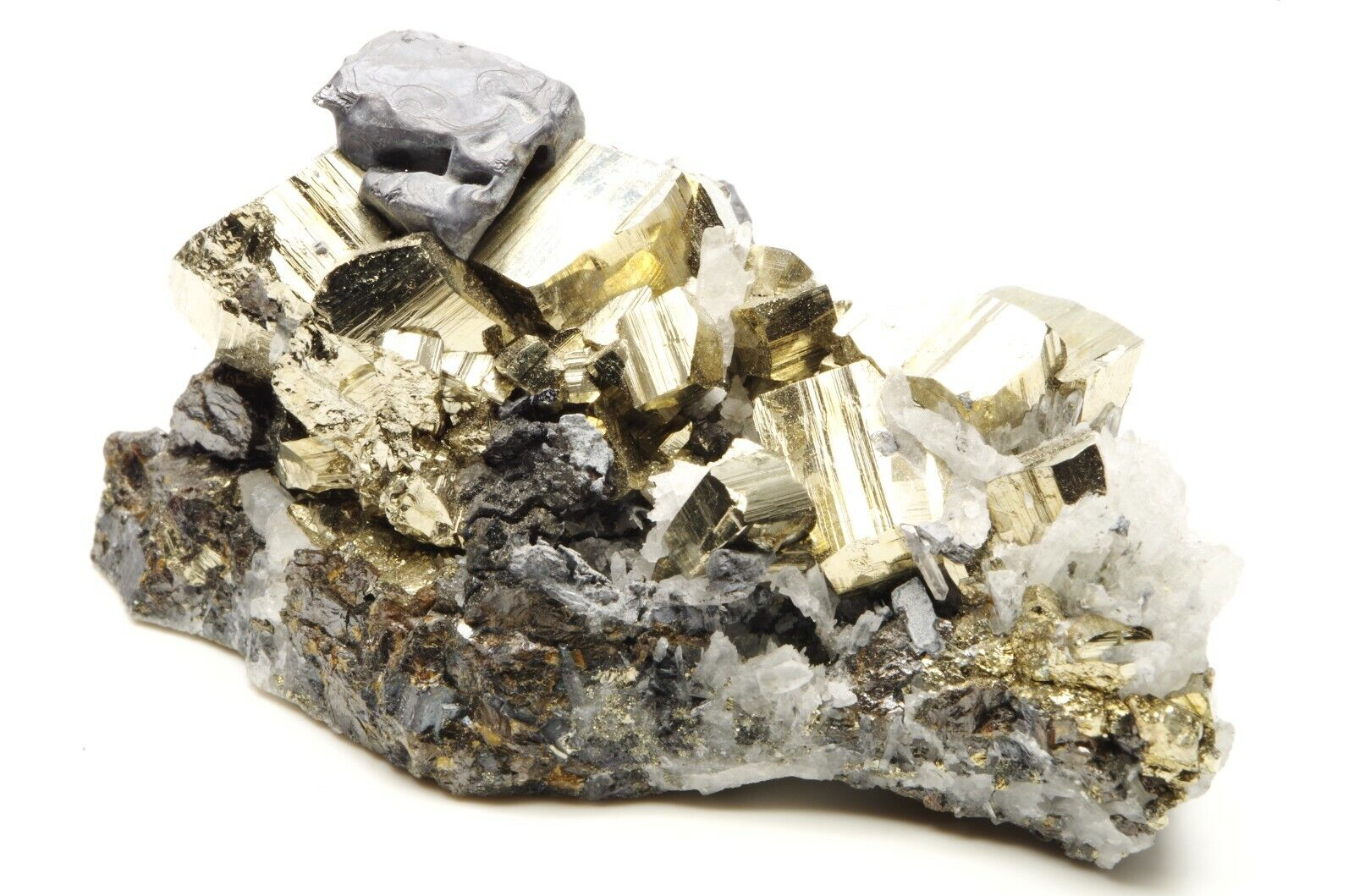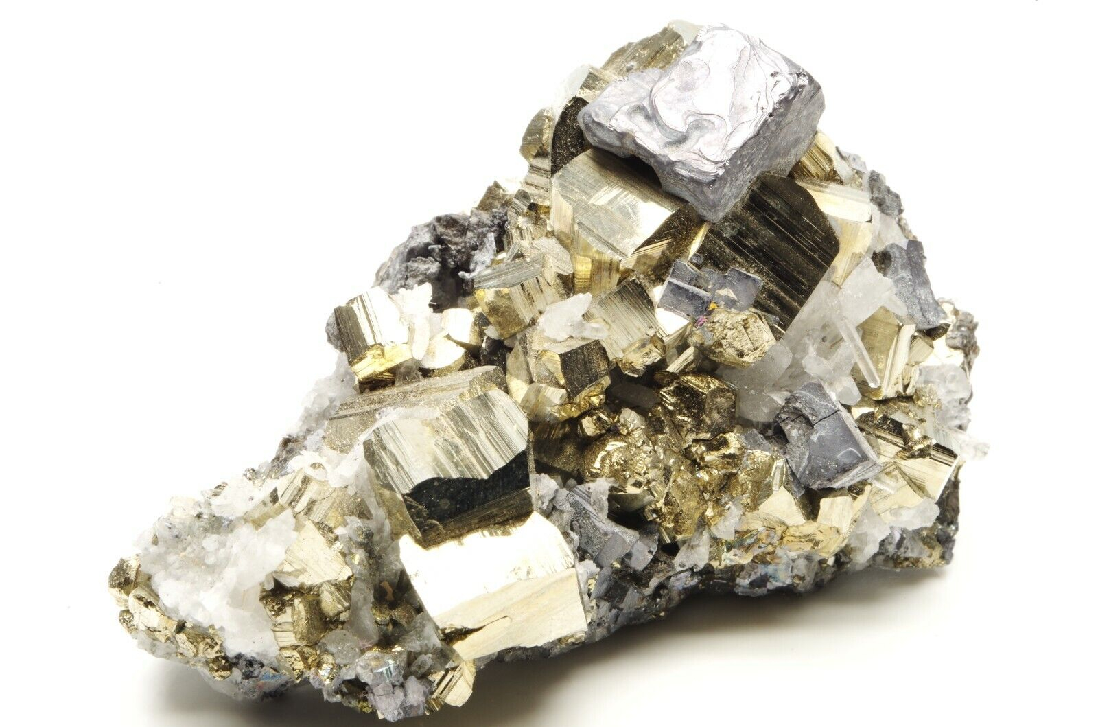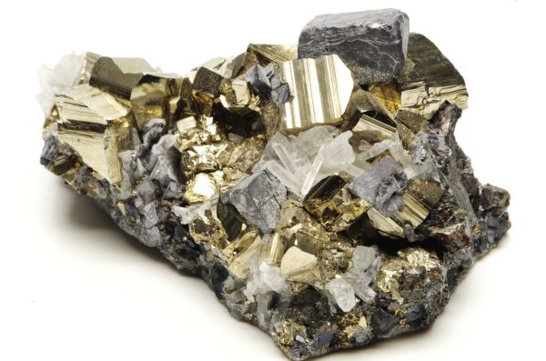 jolie association composée de larges cristaux de pyrite, petits quartz sur une base en sphalérite et cristal cubique de galène dominant la pièce