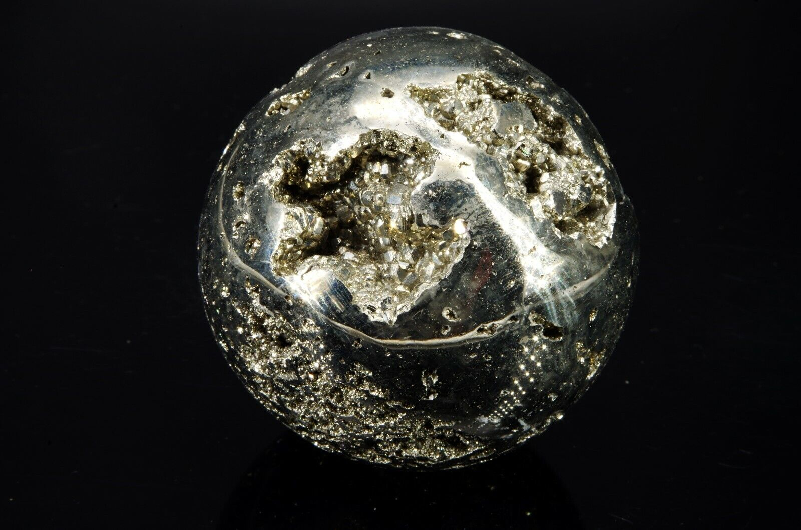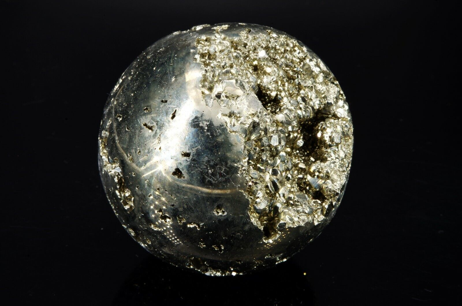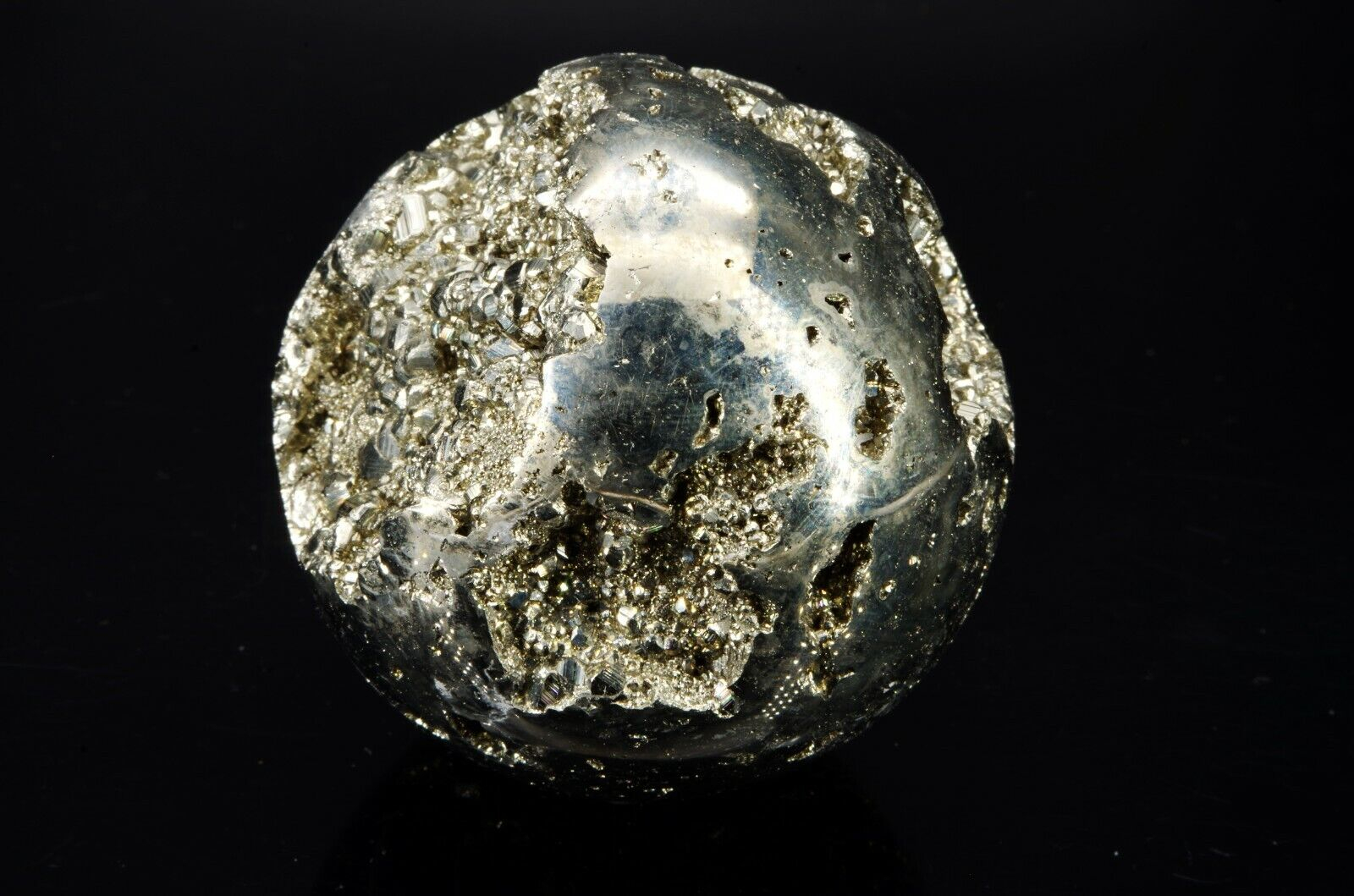 Pyrite en forme de sphère, provenance: Pérou, mine de Huanzala Poids: 478gr Diamètre: 6 cm Circonférence: 19.5 cm