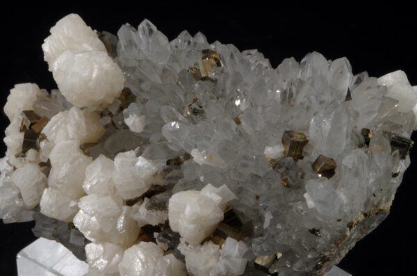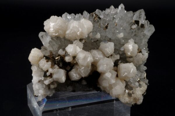 Magnifique spécimen composé de Dolomite disposée que une druse quartz limpide parsemée de petits cubes de Pyrite.