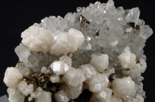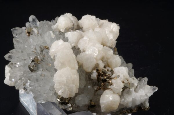 - Dolomite : Ce carbonate de calcium et de magnésium se présente sous forme de cristaux blancs ou légèrement rosés, souvent en association avec le quartz et la pyrite, offrant un contraste subtil et raffiné.