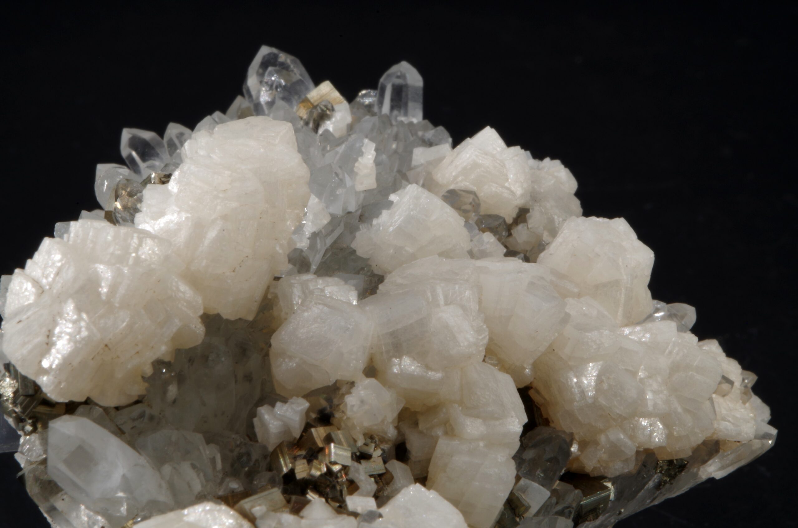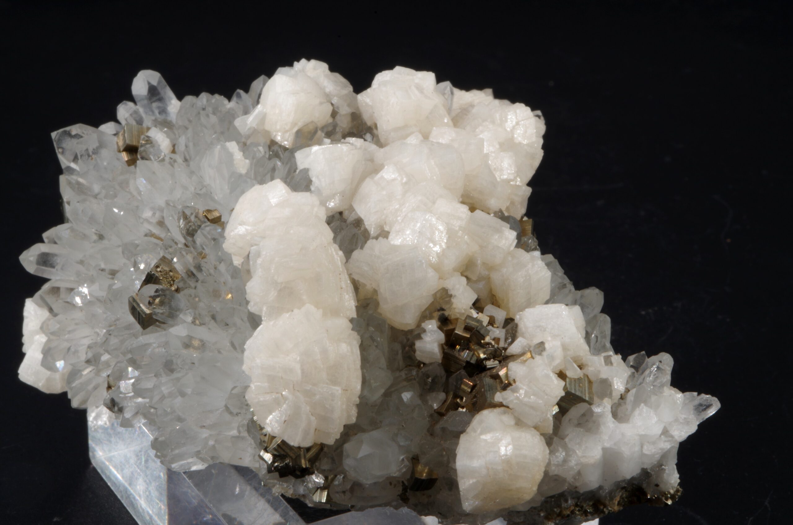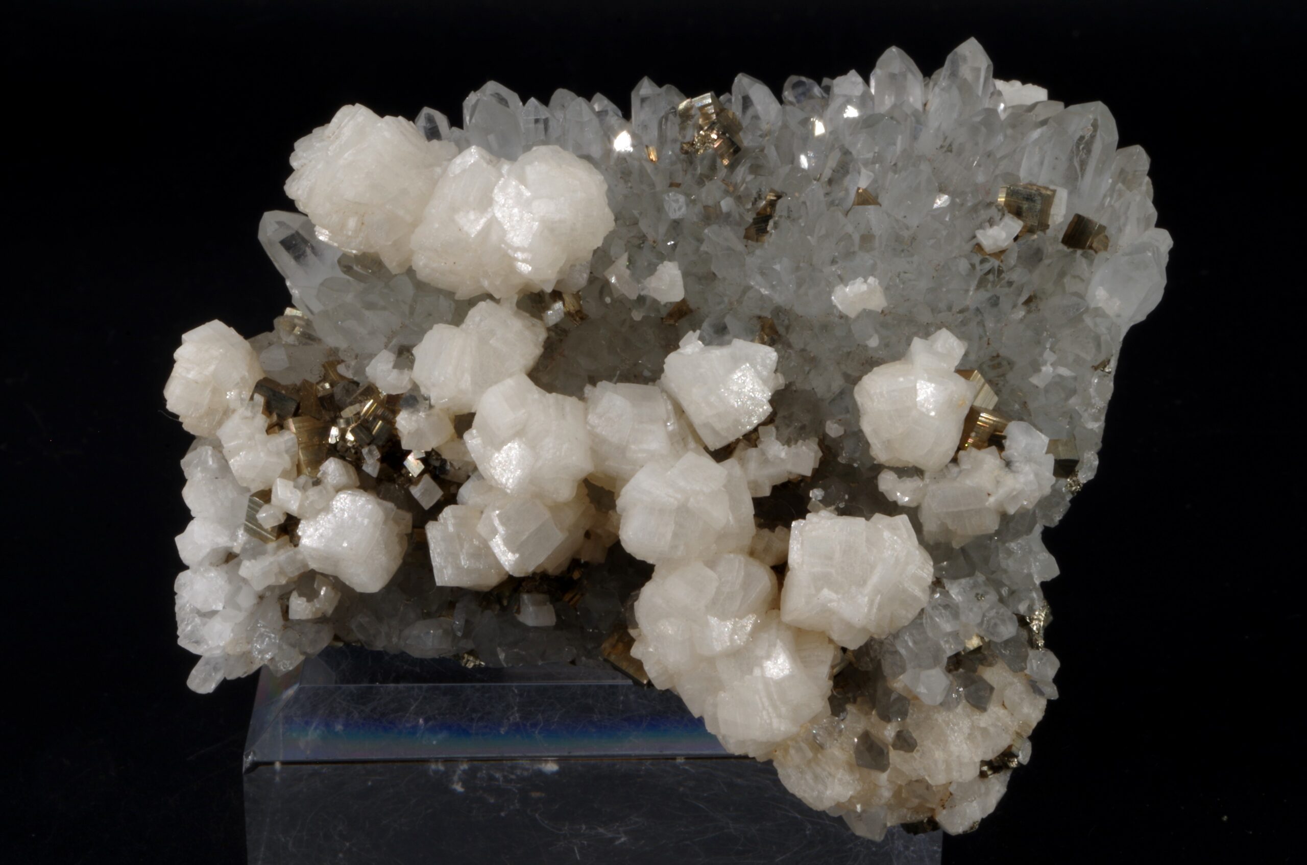 Magnifique spécimen composé de Dolomite disposée que une druse quartz limpide parsemée de petits cubes de Pyrite.