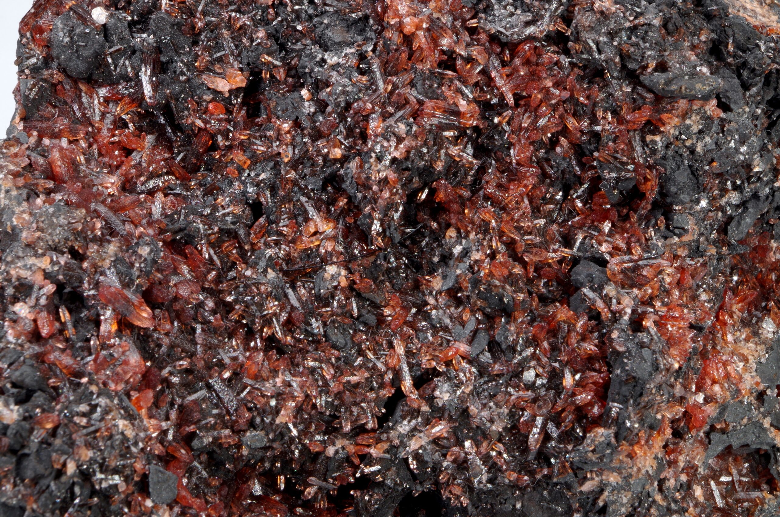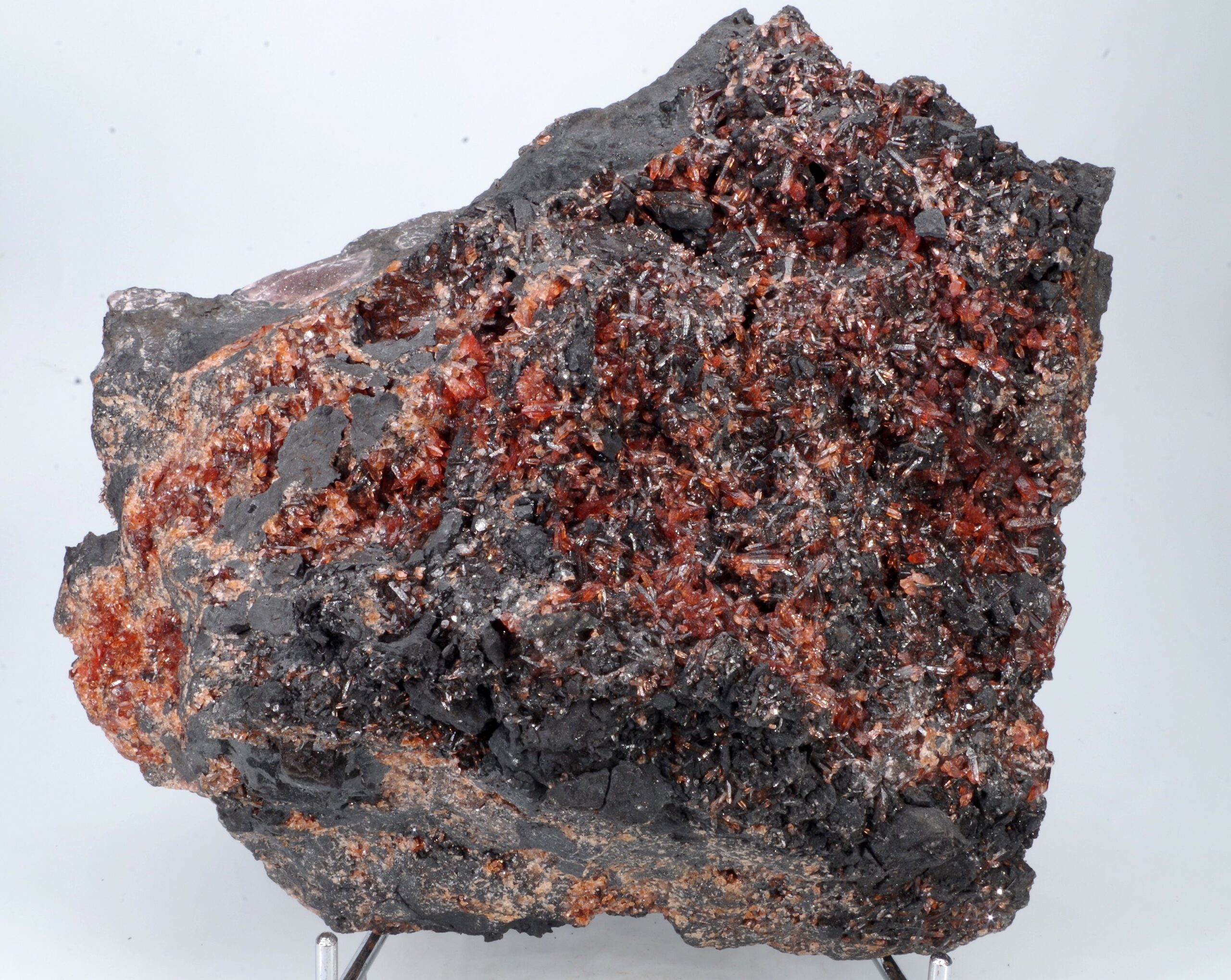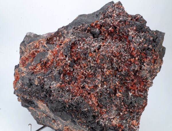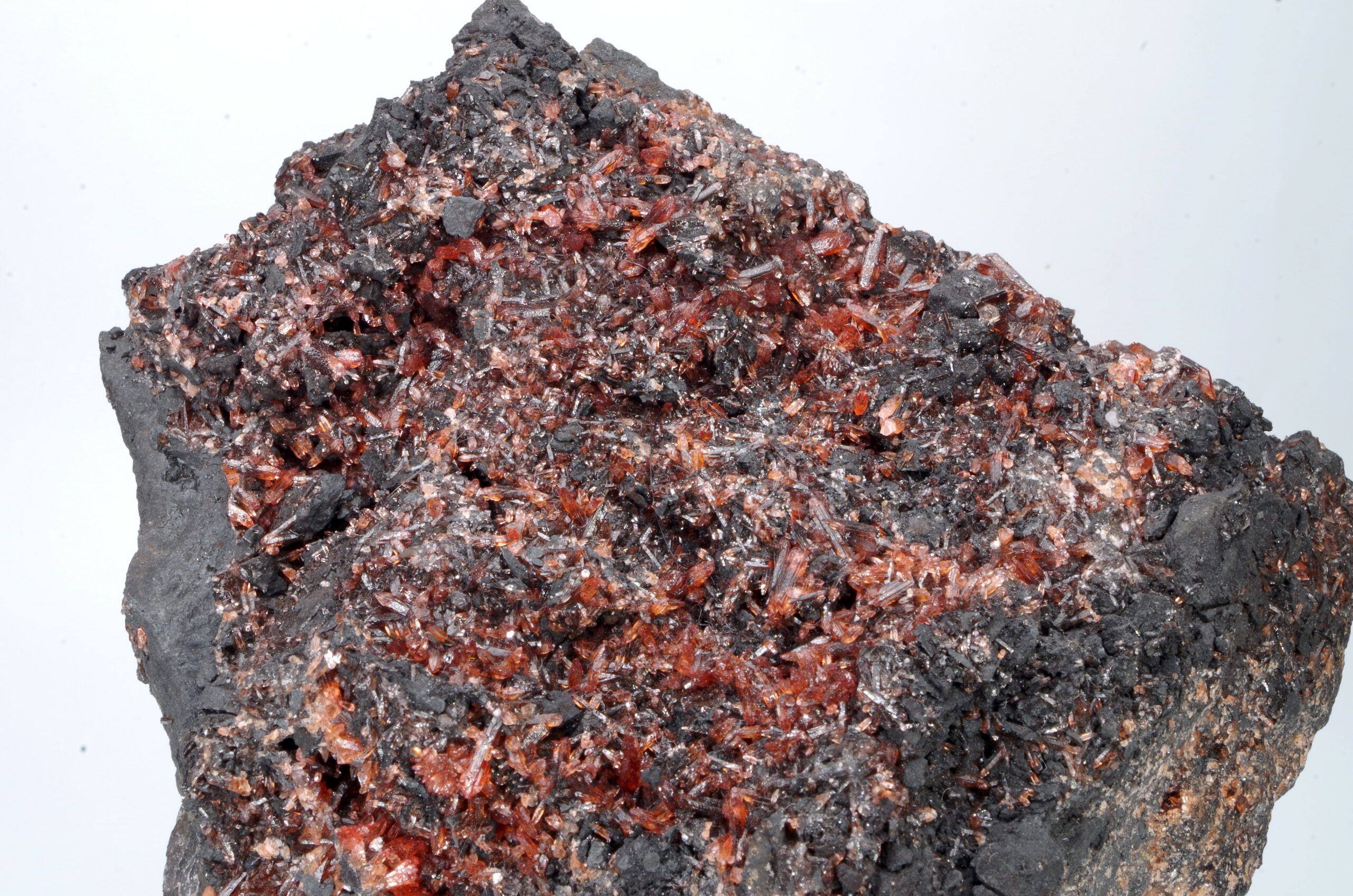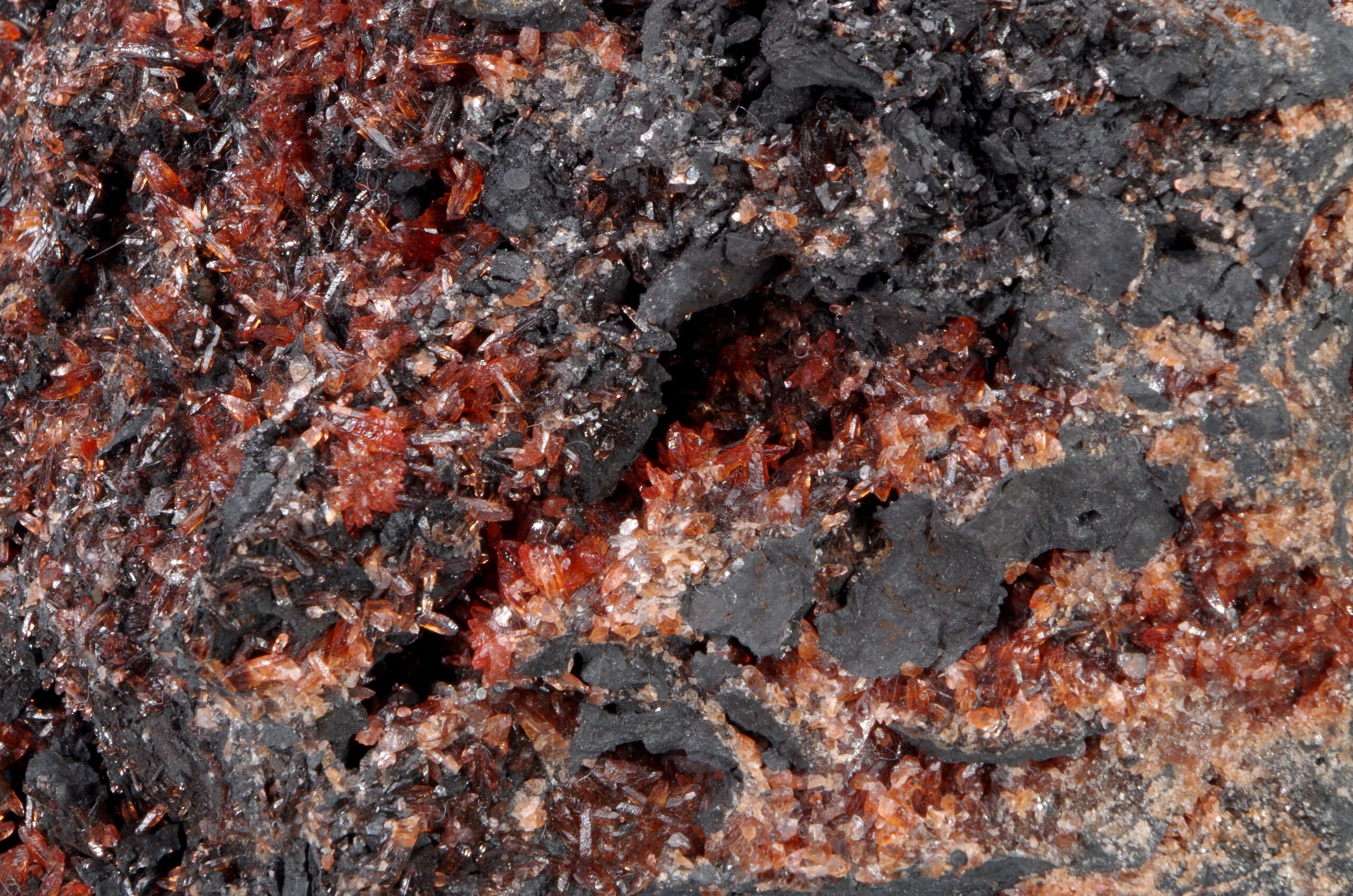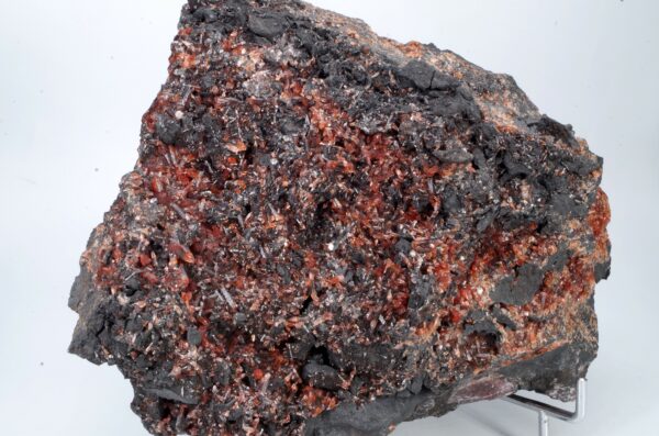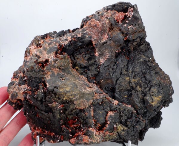 Scalénoèdres et cristaux rhomboédriques de Rhodochrosite parcourant une large matrice recouverte de manganite. Extraction des années 1970-1980.