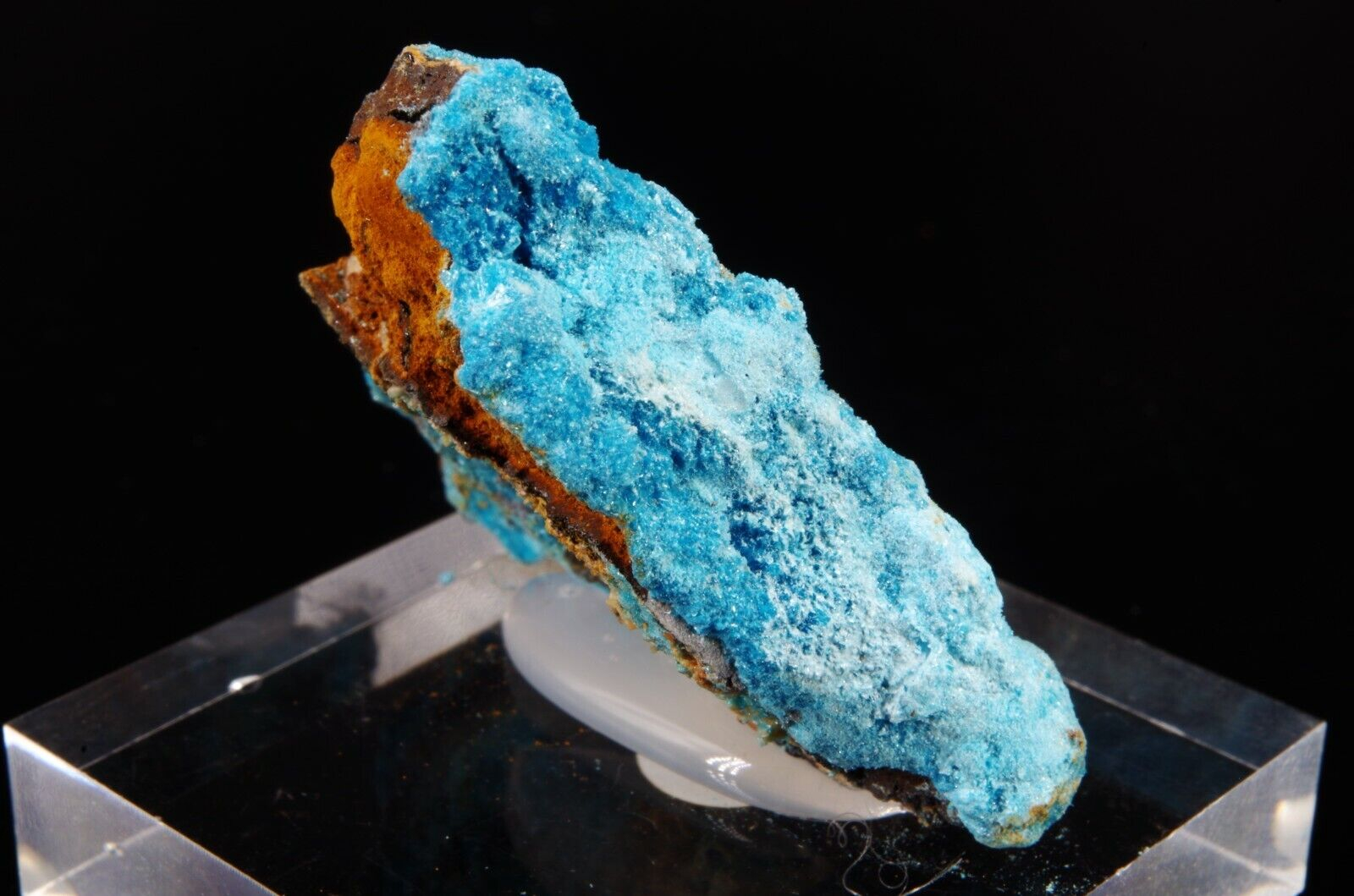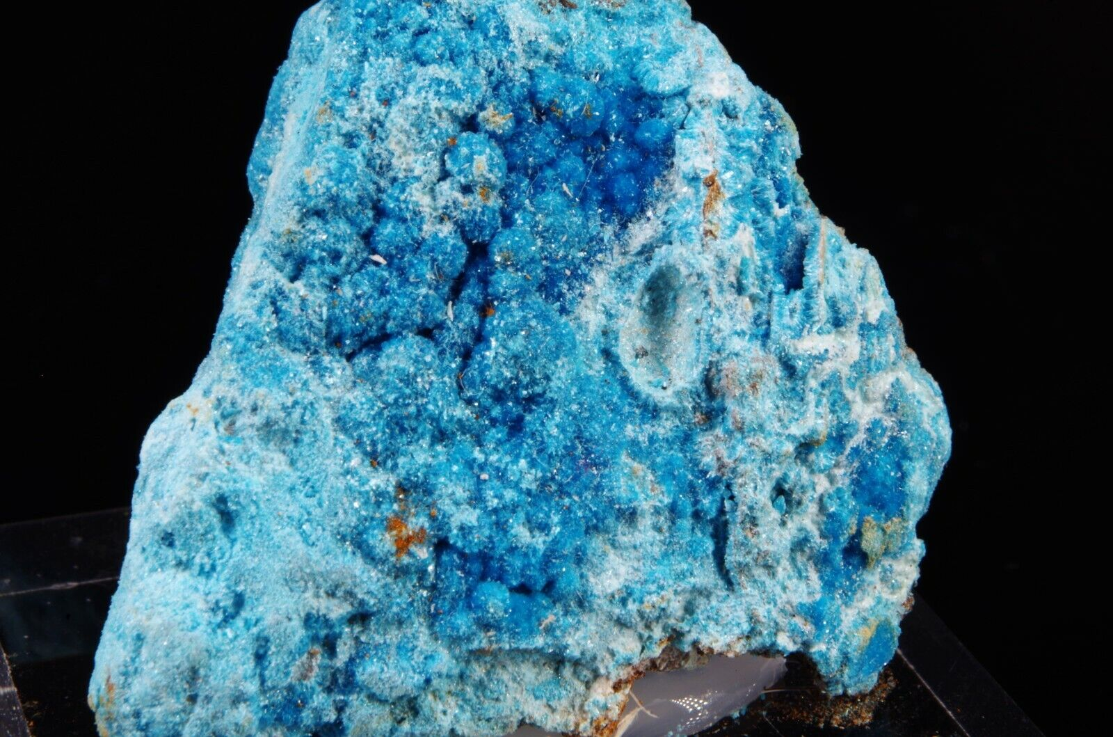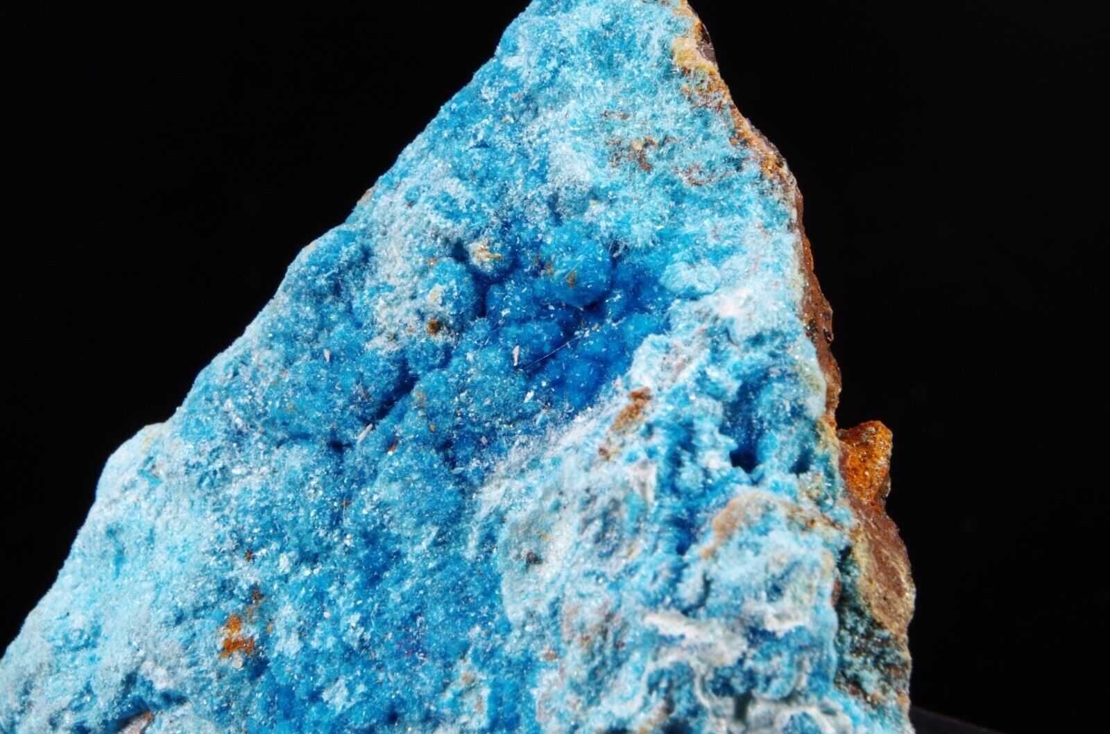 Rare sky-blue coloured hydrated sulfate mineral, often found as a post-mining product.