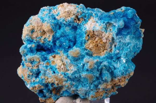 Rare sky-blue coloured hydrated sulfate mineral, often found as a post-mining product.