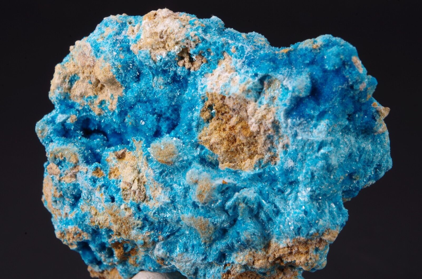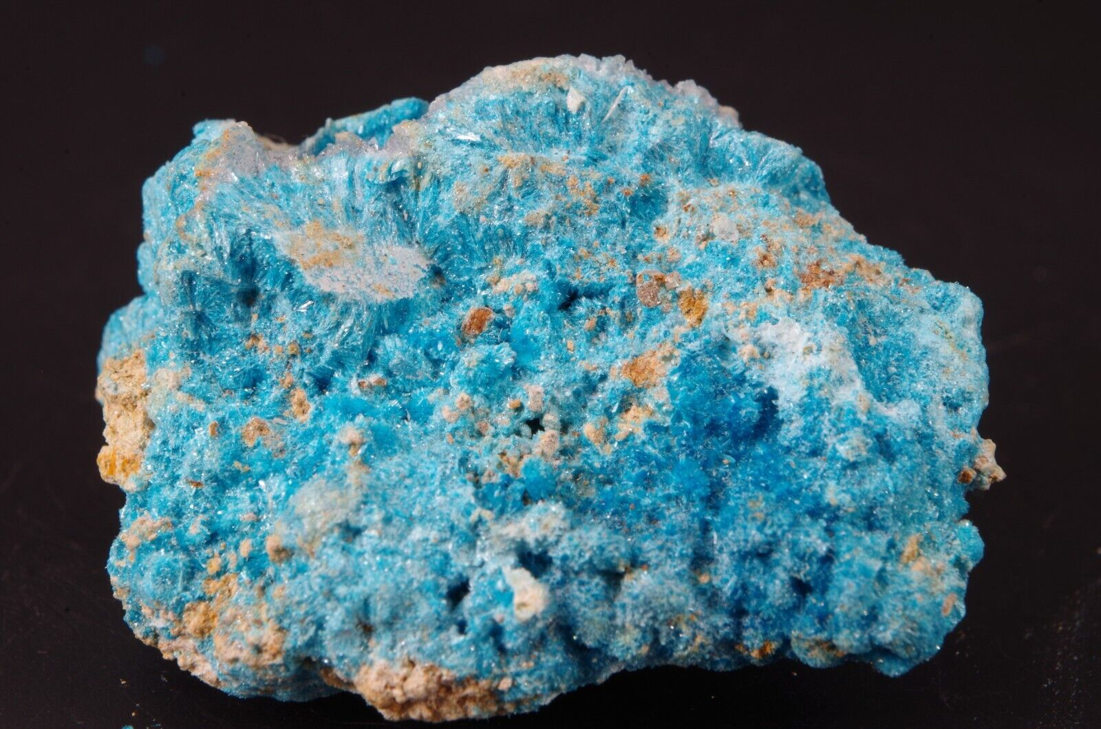 Rare sky-blue coloured hydrated sulfate mineral, often found as a post-mining product.
