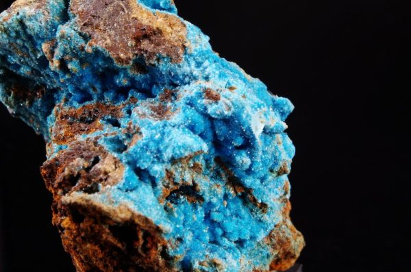 Rare sky-blue coloured hydrated sulfate mineral, often found as a post-mining product.