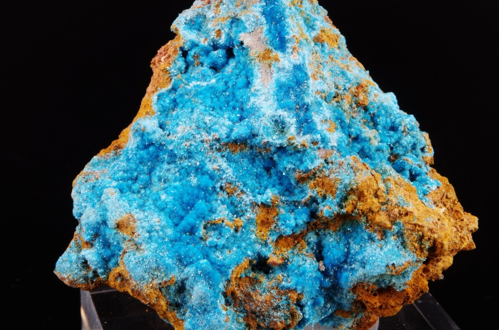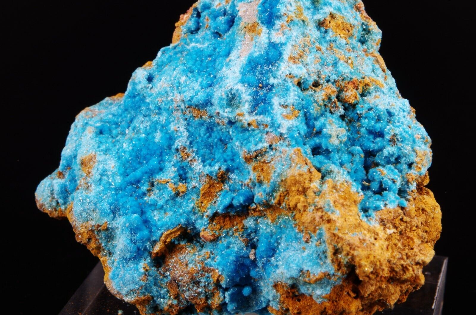 Rare sky-blue coloured hydrated sulfate mineral, often found as a post-mining product.